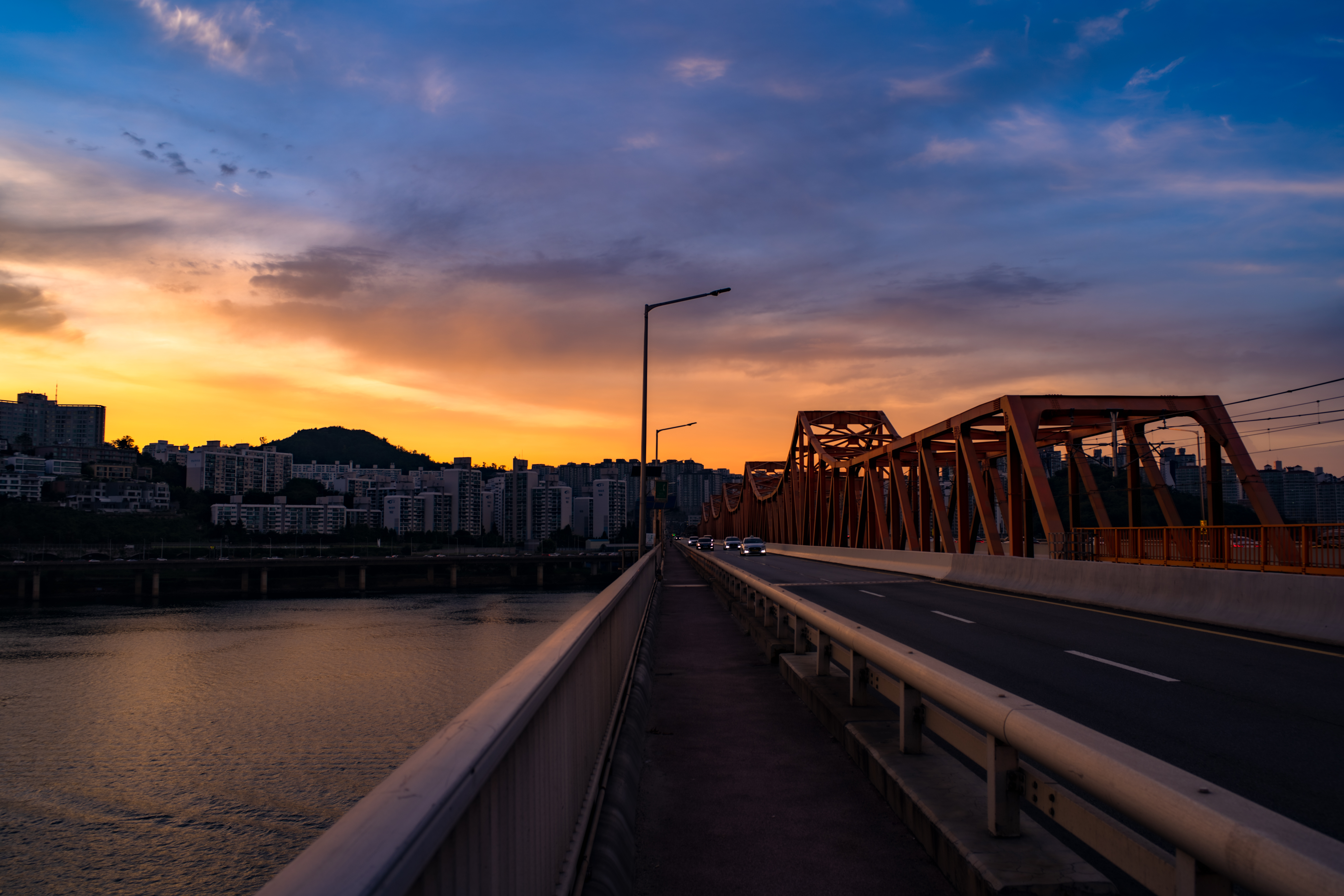 이번 여름 몇 번에 걸쳐 노을 사냥(?)에 나섰지만 난지 한강 공원에서, 노들섬과 선유도, 서울숲에서 생각처럼 탁 트인 뷰를 맞을 수 없었기에 이번엔 아예 한강 다리 위에서 기다리기로 했습니다. 목적지는 이전에 야경 감상차 다녀왔던 달맞이 근린공원 아래 있는 동호대교. 철제 구조물과 밤에 들어오는 조명의 색이 아름다운 곳이죠. 이날은 더위가 채 가시지 않은 8월 초였는데, 오후 여섯시쯤 도착해 해넘이를 기다리기로 했습니다.