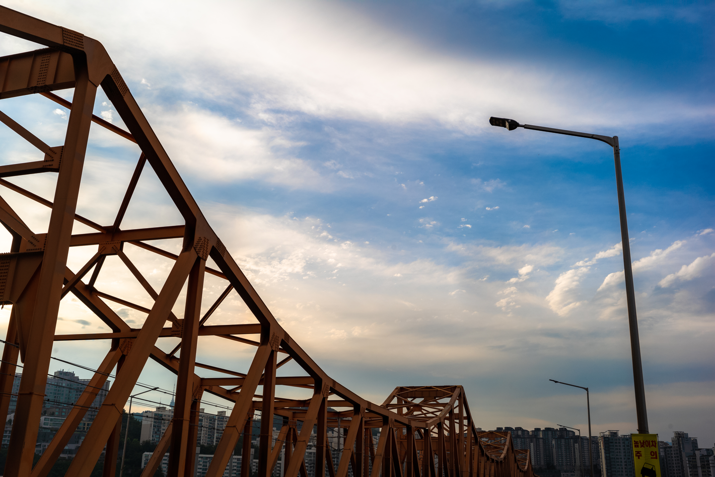 이번 여름 몇 번에 걸쳐 노을 사냥(?)에 나섰지만 난지 한강 공원에서, 노들섬과 선유도, 서울숲에서 생각처럼 탁 트인 뷰를 맞을 수 없었기에 이번엔 아예 한강 다리 위에서 기다리기로 했습니다. 목적지는 이전에 야경 감상차 다녀왔던 달맞이 근린공원 아래 있는 동호대교. 철제 구조물과 밤에 들어오는 조명의 색이 아름다운 곳이죠. 이날은 더위가 채 가시지 않은 8월 초였는데, 오후 여섯시쯤 도착해 해넘이를 기다리기로 했습니다.