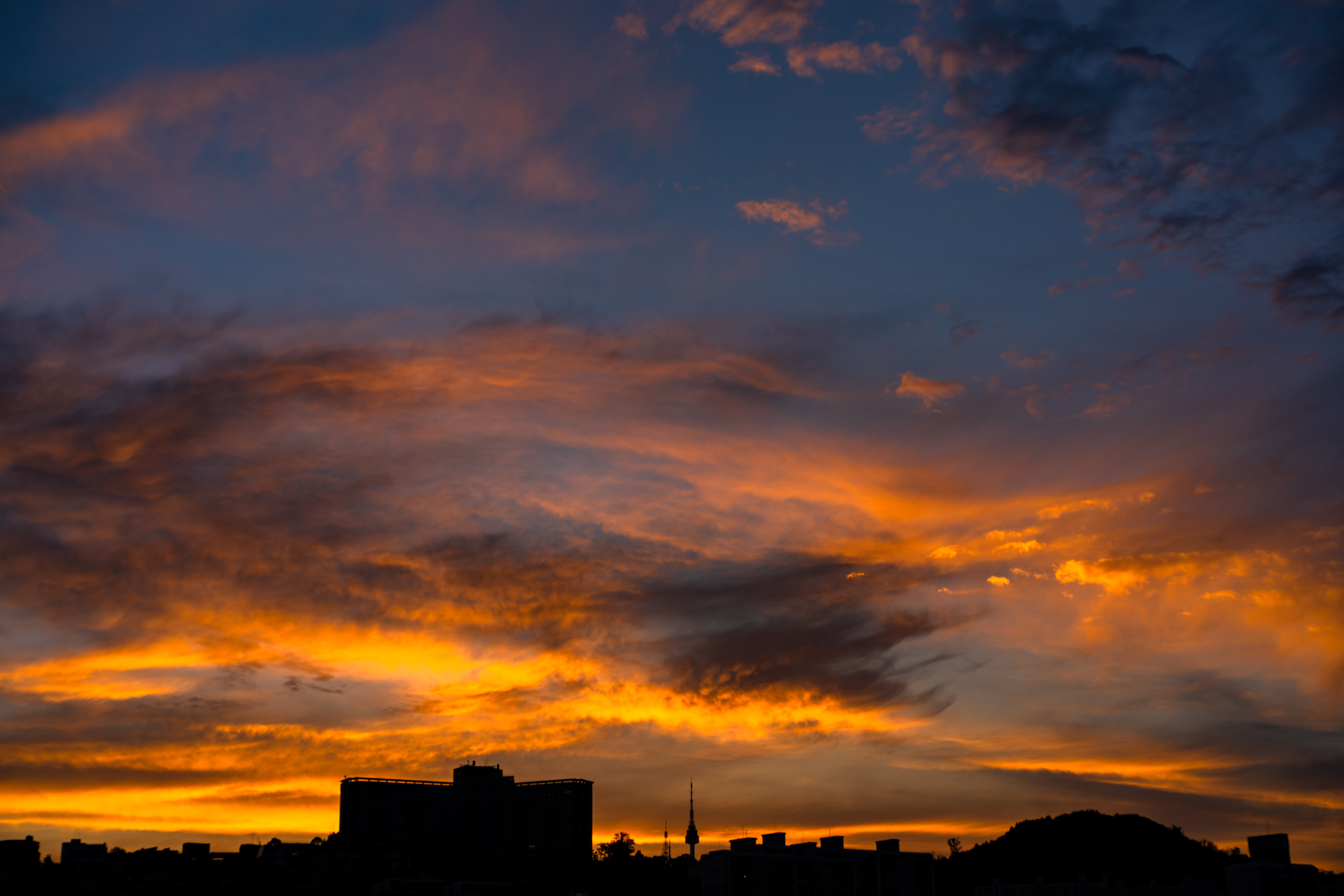 노을 쇼가 시작된 지 얼마 되지 않아 해는 도시의 스카이라인 너머로 사라졌고, 잔열과 남은 색들이 대기 위에 퍼졌습니다. 해넘이의 골든 타임은 해가 진 순간이 아니라 해가 사라지고 난 후라는 것을 그간 왜 몰랐을까요. 발길 돌리다 아쉬움에 다시 달려간 적이 한두번이 아닌데.