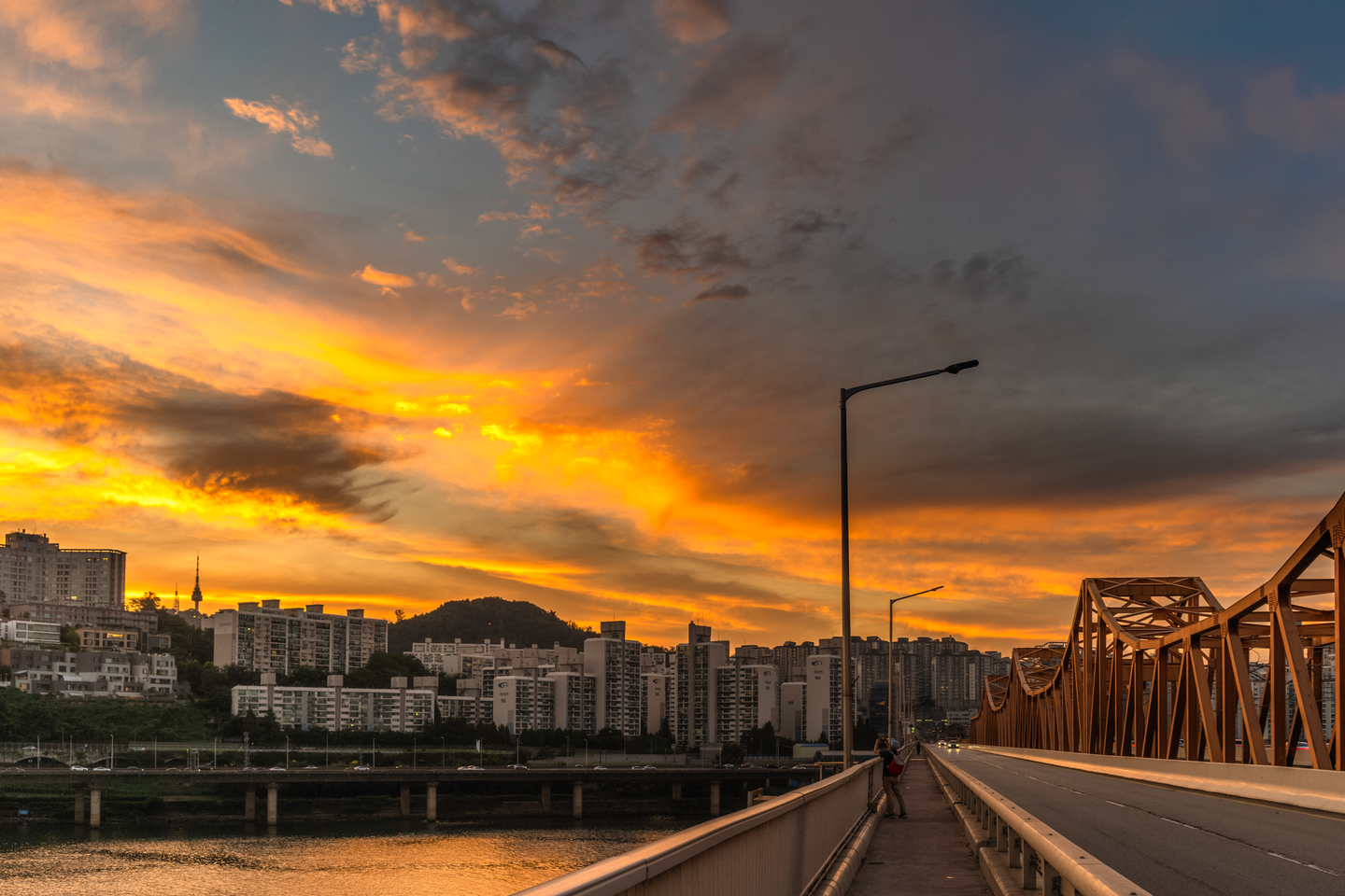 그렇게 시작된 이 날의 노을 쇼. 그간 감탄할 만큼 아름다운 노을이 펼쳐질 때는 늘 실내에서 작은 조각만 들여다 보는 것으로 만족했는데 이날은 운이 맞았어요. 여느 날보다 화려한 노을이 펼쳐졌고, 저는 어느 때보다 좋은 자리에서 그 시간을 맞았습니다. 주황색으로 시작해 붉은 빛으로 달궈지는 대기를 원없이 감상했습니다. 매일 이 다리를 지나는 듯한 사람들도 멈춰 서서 휴대폰을 꺼내 사진을 찍을 정도로 특별했습니다.