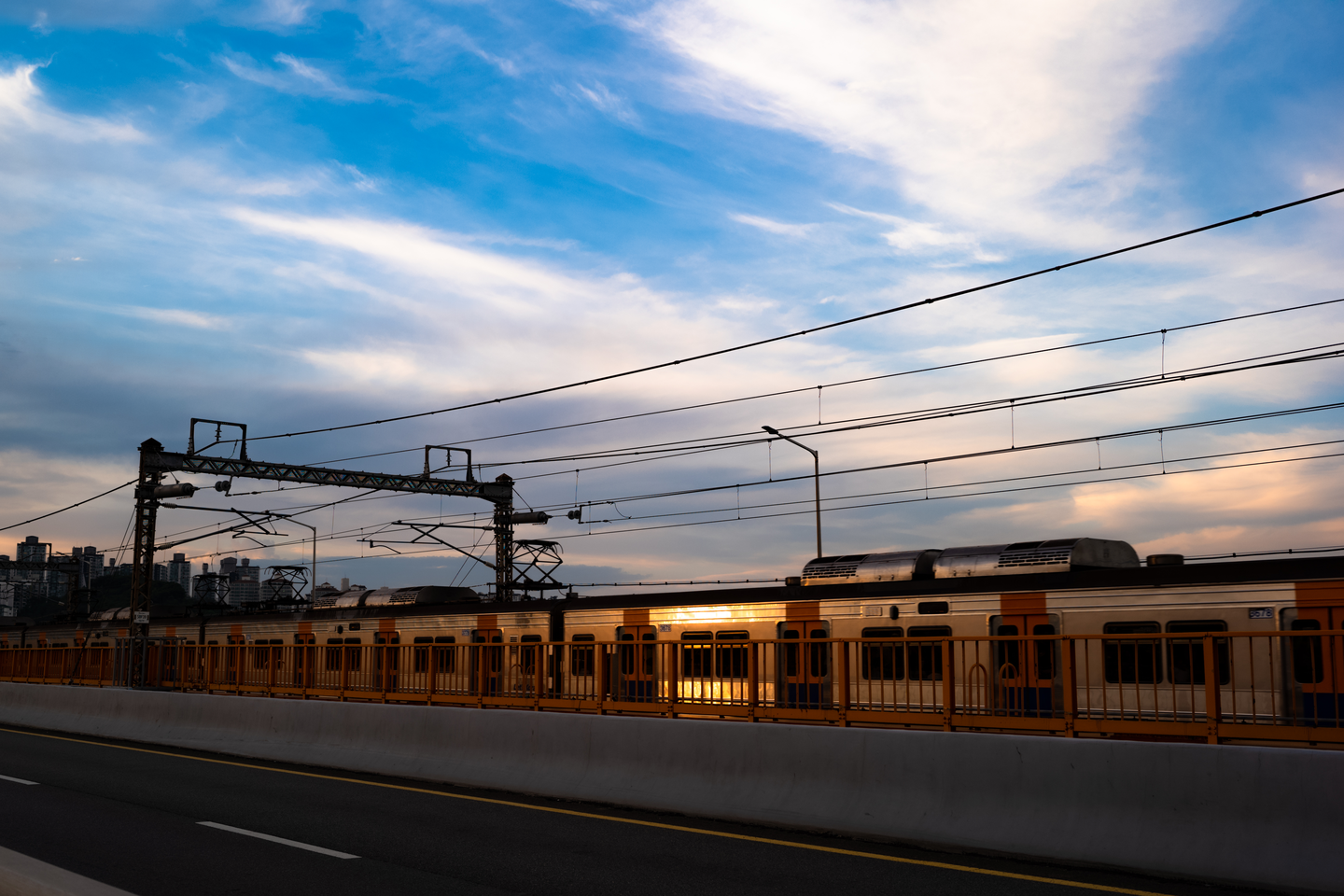 이 날 일몰 시간은 저녁 7시 50분이었어요. 압구정에서 다리 반대편으로 건너가 해가 지는 서쪽을 바라보며 걸었습니다. 일곱시가 넘으니 대기가 조금씩 금빛으로 물들어 햇살 닿는 지하철의 금속 표면이 달아올랐습니다. 강 위라 바람이 꽤 불어서 더위로 고생하진 않았지만, 기다렸던 시간이 다가오니 마음이 분주해졌습니다. 챙겨 간 카메라를 손에 꼭 쥐고 다리 위 좋은 위치를 찾았습니다.