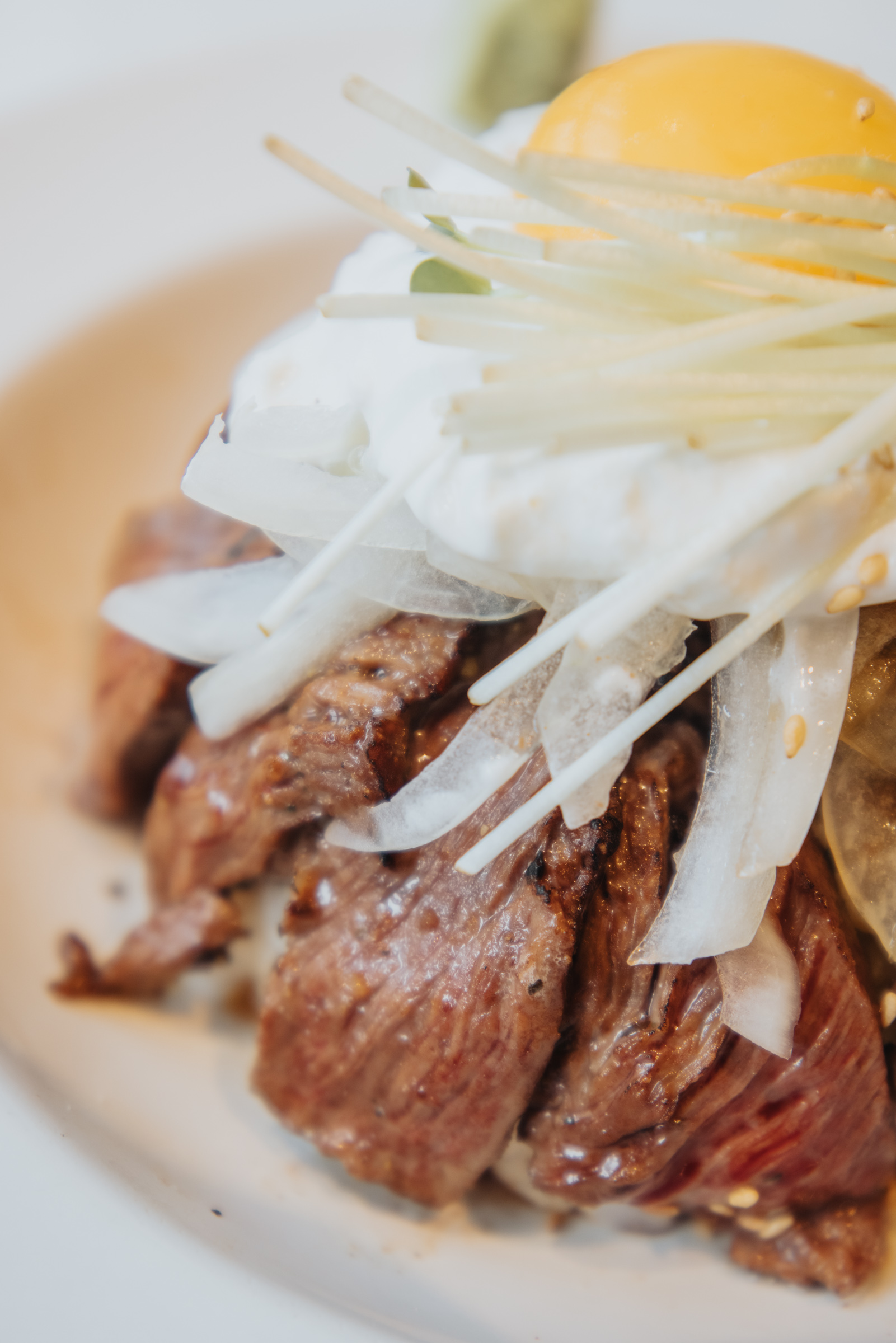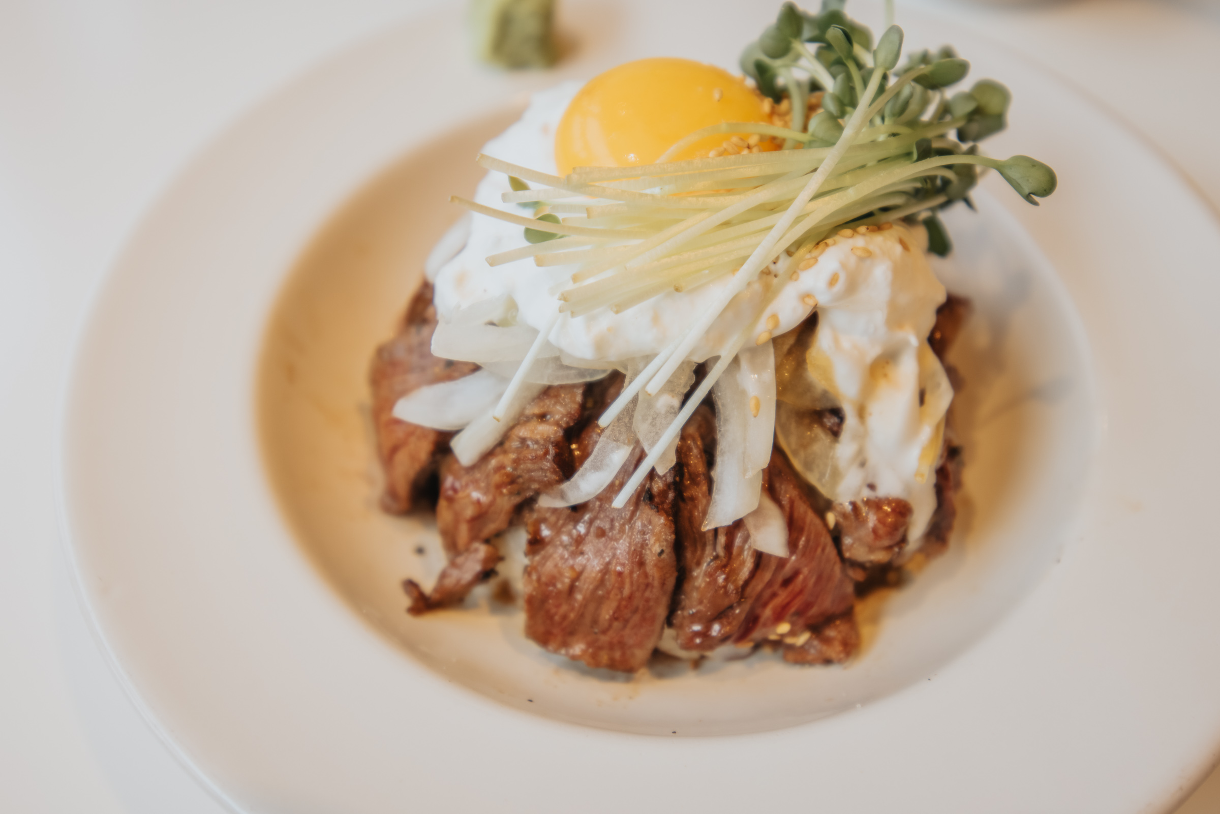 일행이 주문한 스테이크 덮밥. 밥 위에 구운 고기와 양파, 무순, 달걀, 소스 등을 올렸습니다.