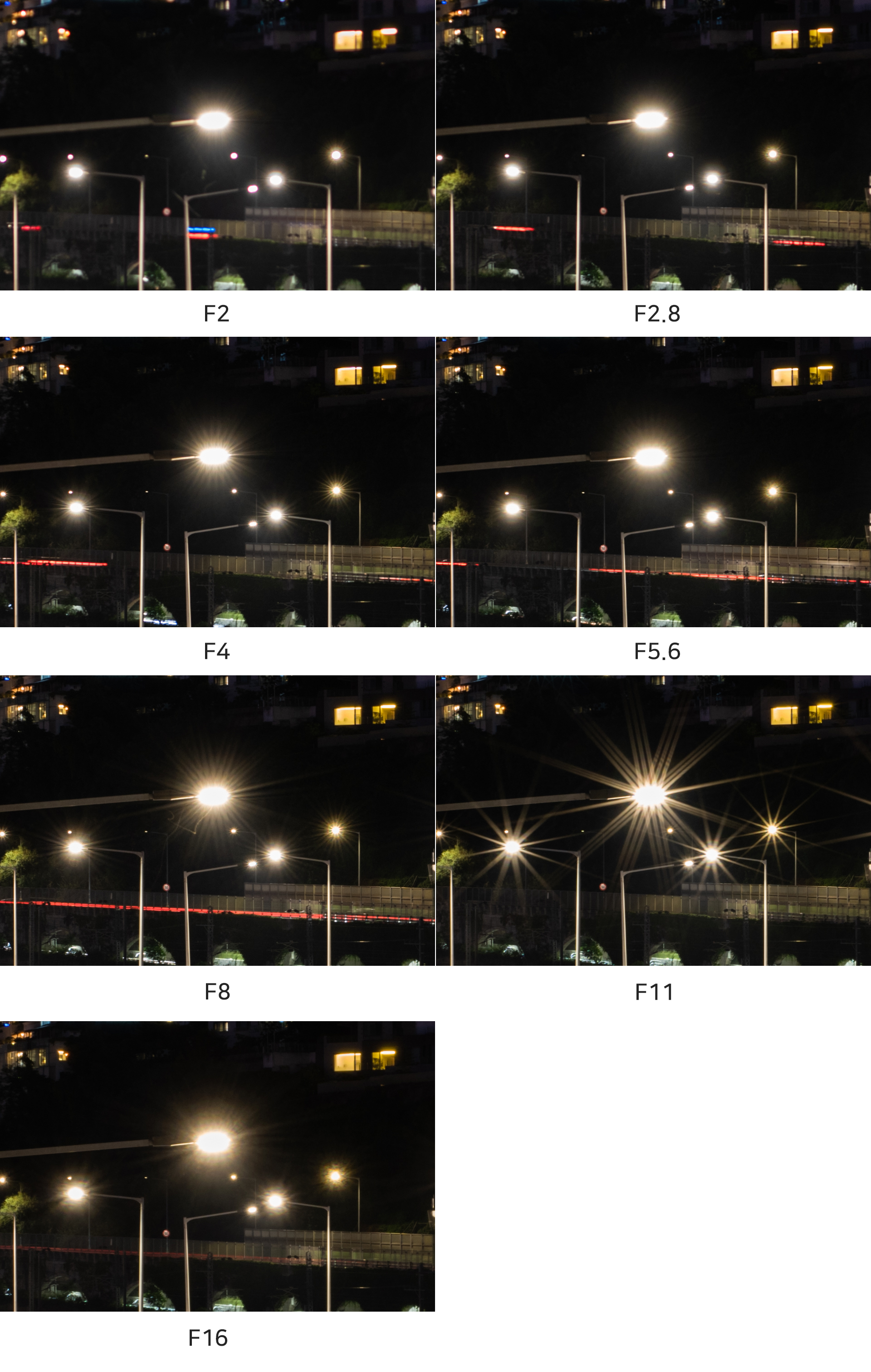 당연히(?) 원형 조리개가 표현되는 F2 최대 개방을 제외하고 비교적 높은 조리개 값인 F5.6 설정을 비교해 보았습니다. 직전 조리개 값인 약 F4.8에서는 특유의 톱니바퀴 모양 보케가 나타나는 데 반해 그보다 높은 F5.6 설정값에서 선명한 원형 보케가 나타납니다. 아래는 F2 최대 개방부터 F16까지 조리개 값에 따른 보케 모양을 비교한 것입니다.