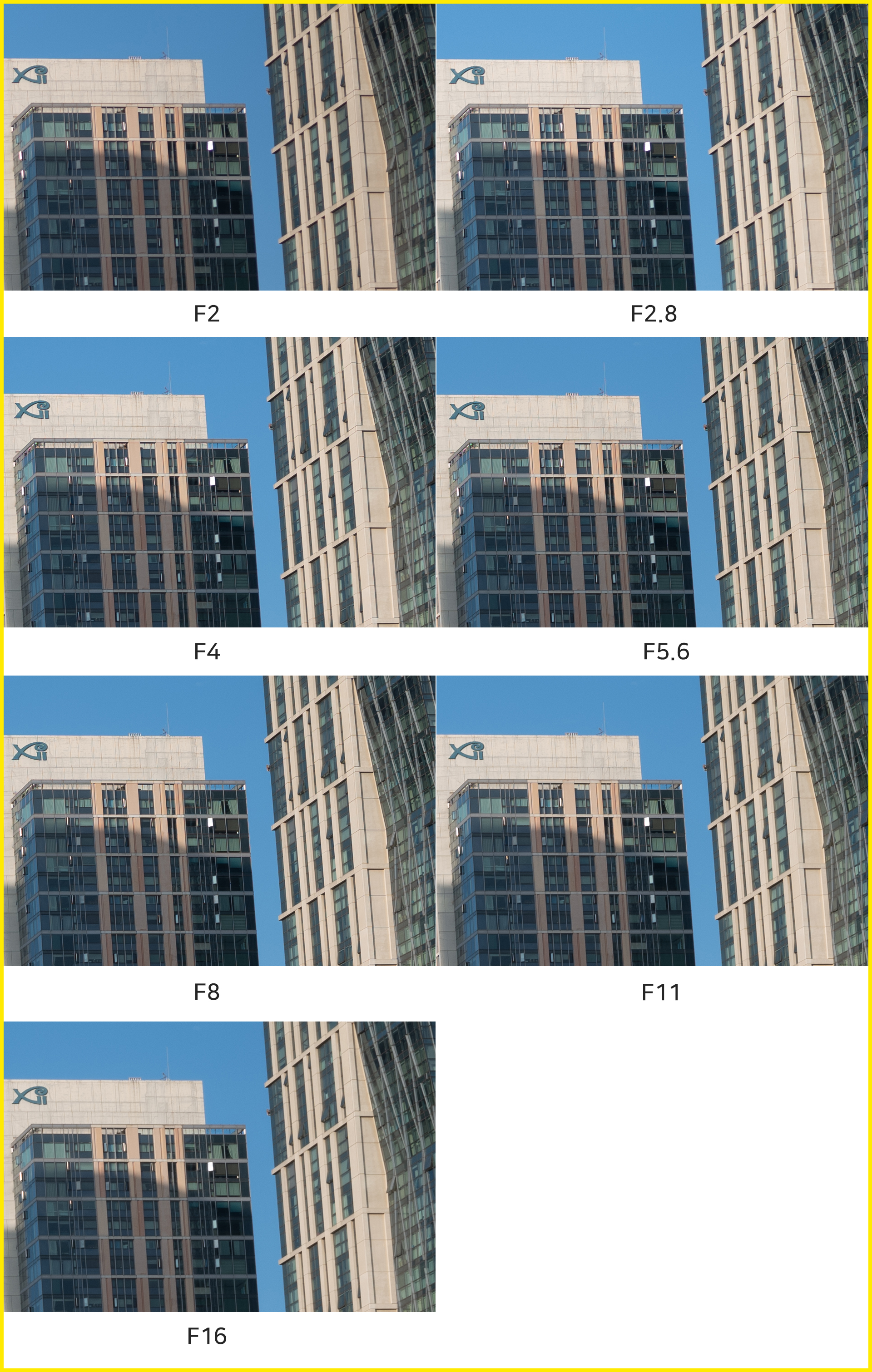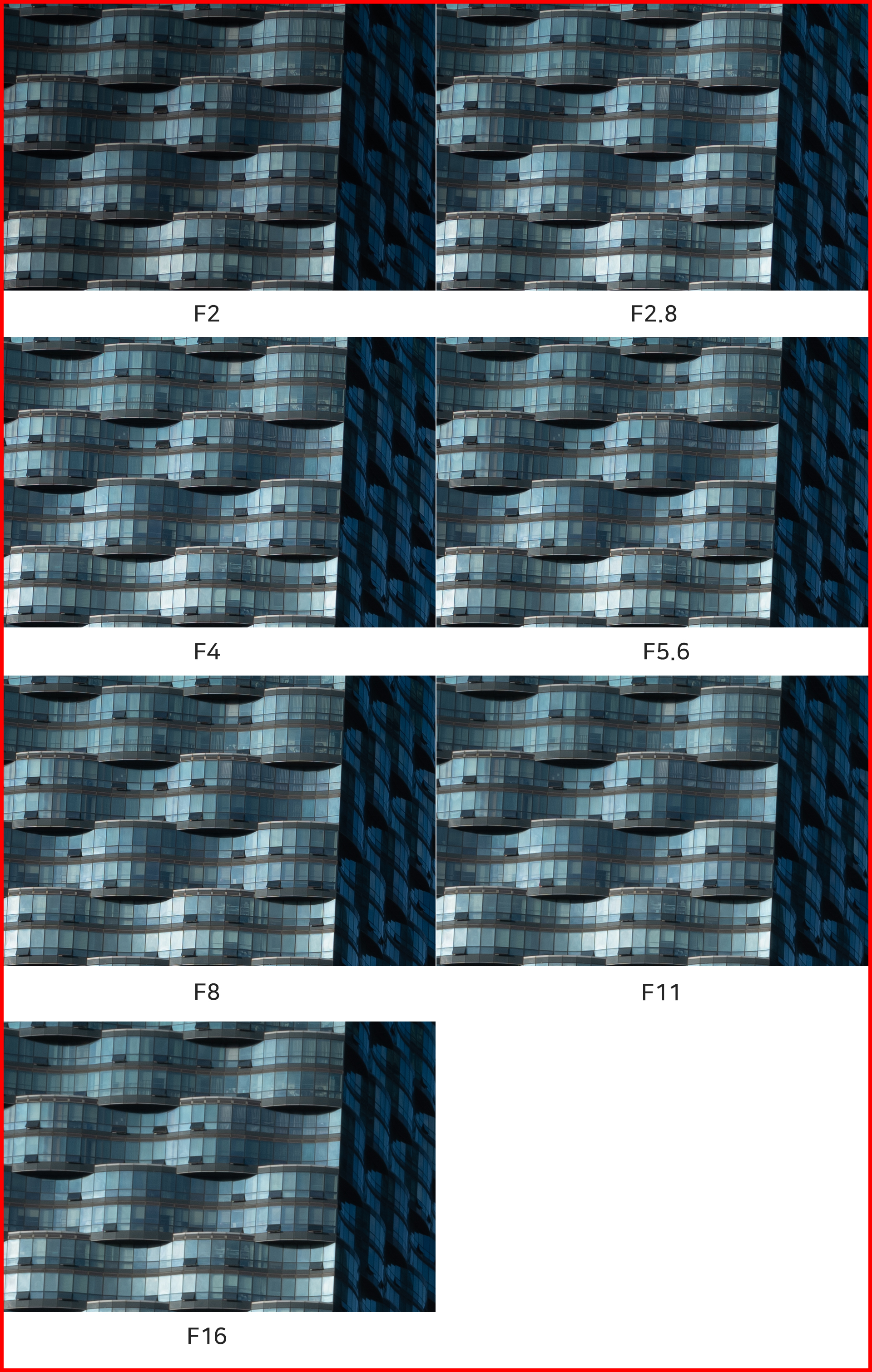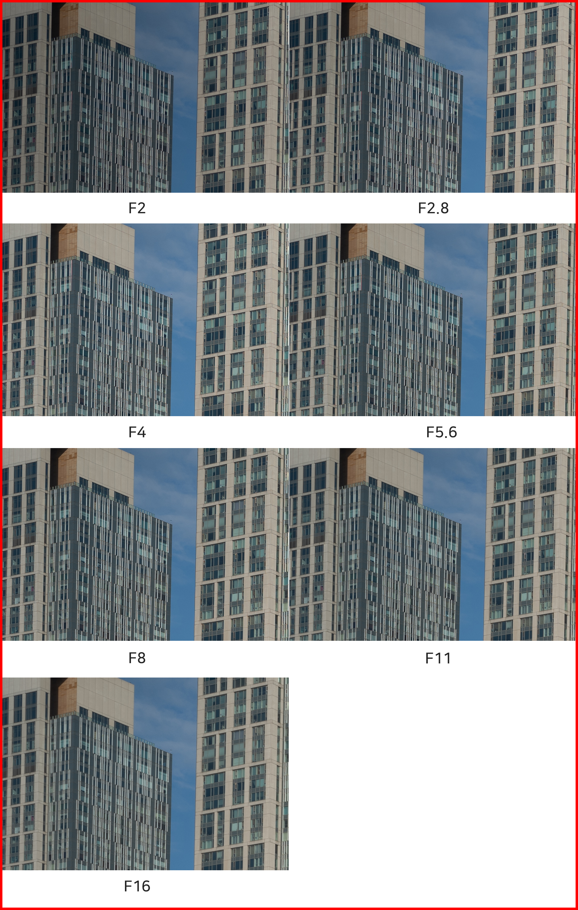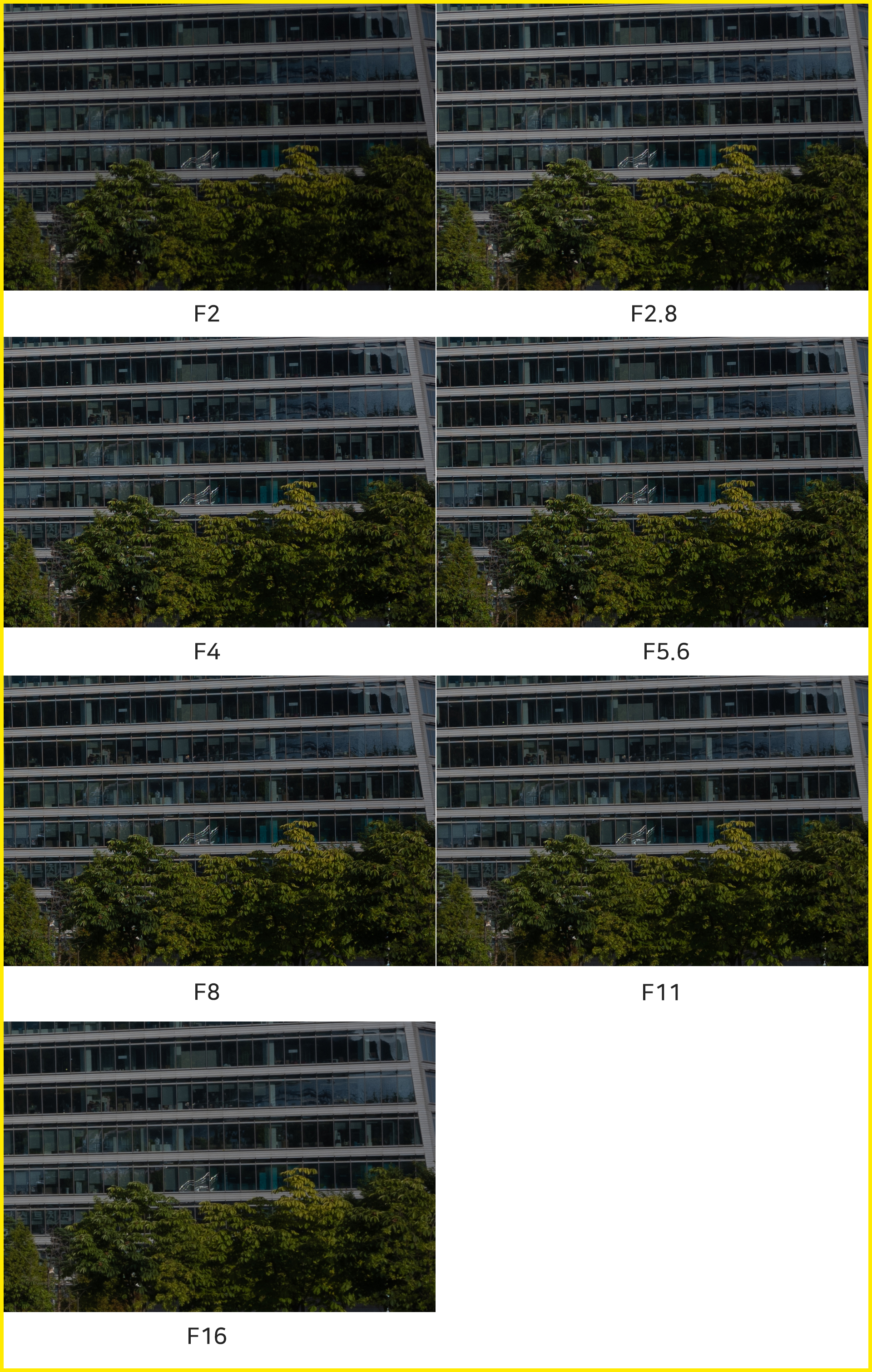 F2부터 F4, F5.6, F8 등 다양한 조리개 값 설정이지만 중심부 해상력에서는 큰 차이를 느낄 수 없습니다. 일반적으로 화질이 가장 좋은 F5.6-8의 결과물을 볼 때, 이 렌즈는 F2 최대 개방을 포함한 모든 조리개 값에서 매우 높은 수준의 해상력을 보여준다 평할 수 있겠습니다. 100% 확대 이미지를 따로 표기하지 않는다면 쉽게 구분하기 힘들 정도로 해상력이 놀랍습니다.