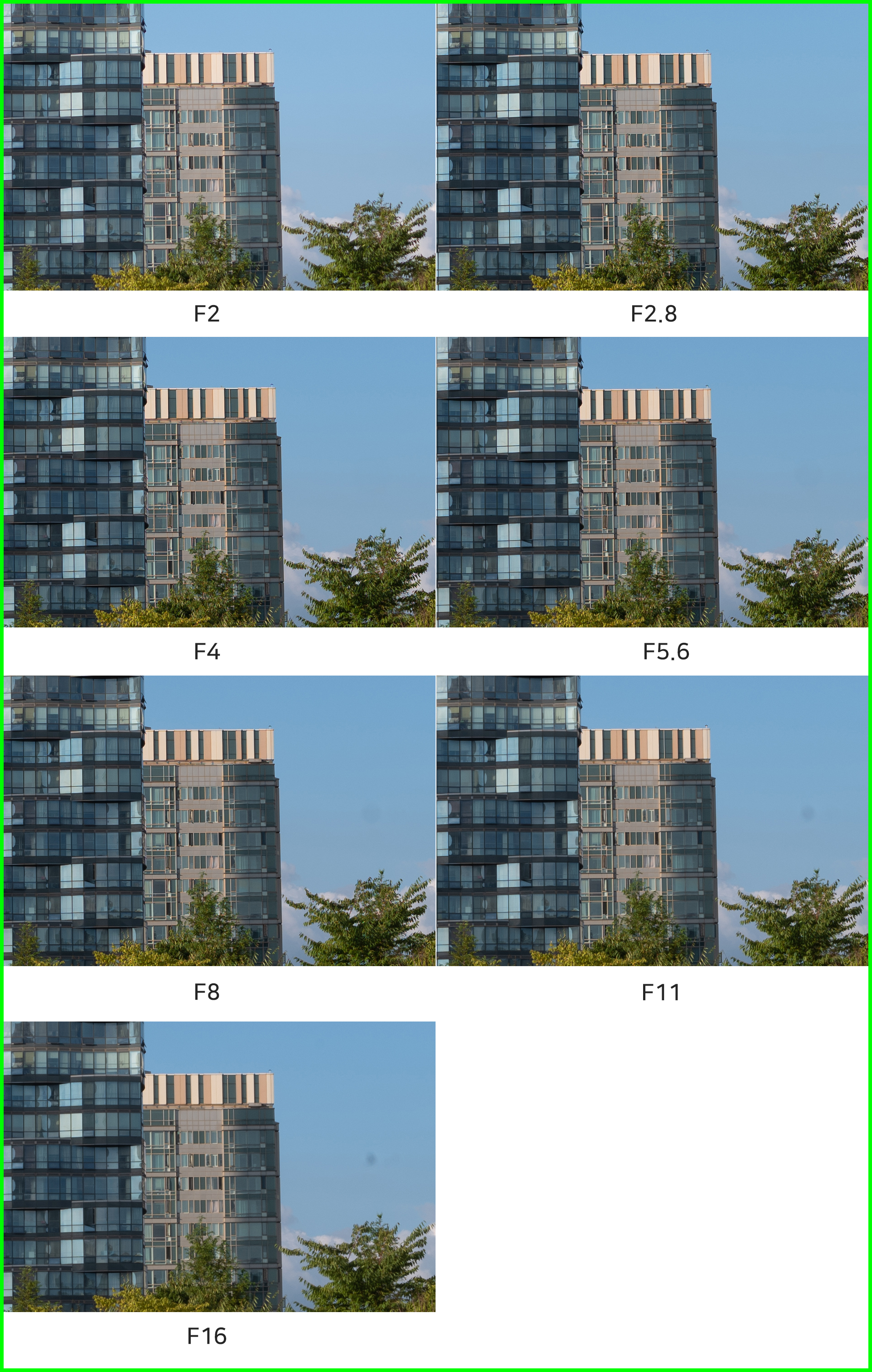 다만 50mm 렌즈보다 야외/풍경 촬영의 비중이 높은 35mm 광각 렌즈다 보니 F2 촬영에서의 주변부 광량 저하가 신경 쓰일 때가 많습니다. 조리개 값을 F4로만 설정해도 결과물이 눈에 띄게 좋아지니 조금만 유의하면 되겠죠. F2-5.6의 결과물을 비교하면 F5.6부터가 최상의 컨디션으로 볼 수 있겠습니다.