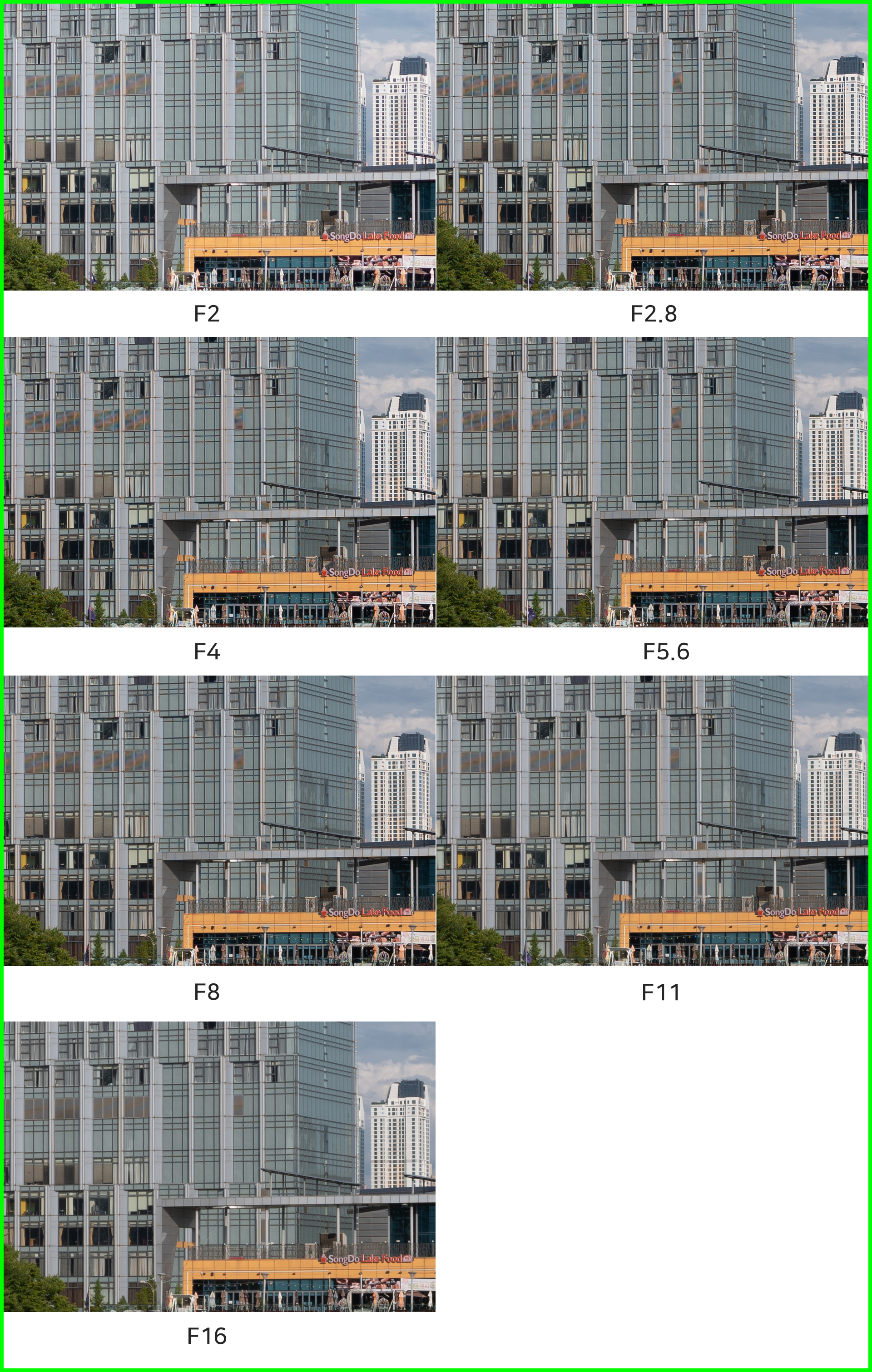 다만 50mm 렌즈보다 야외/풍경 촬영의 비중이 높은 35mm 광각 렌즈다 보니 F2 촬영에서의 주변부 광량 저하가 신경 쓰일 때가 많습니다. 조리개 값을 F4로만 설정해도 결과물이 눈에 띄게 좋아지니 조금만 유의하면 되겠죠. F2-5.6의 결과물을 비교하면 F5.6부터가 최상의 컨디션으로 볼 수 있겠습니다.