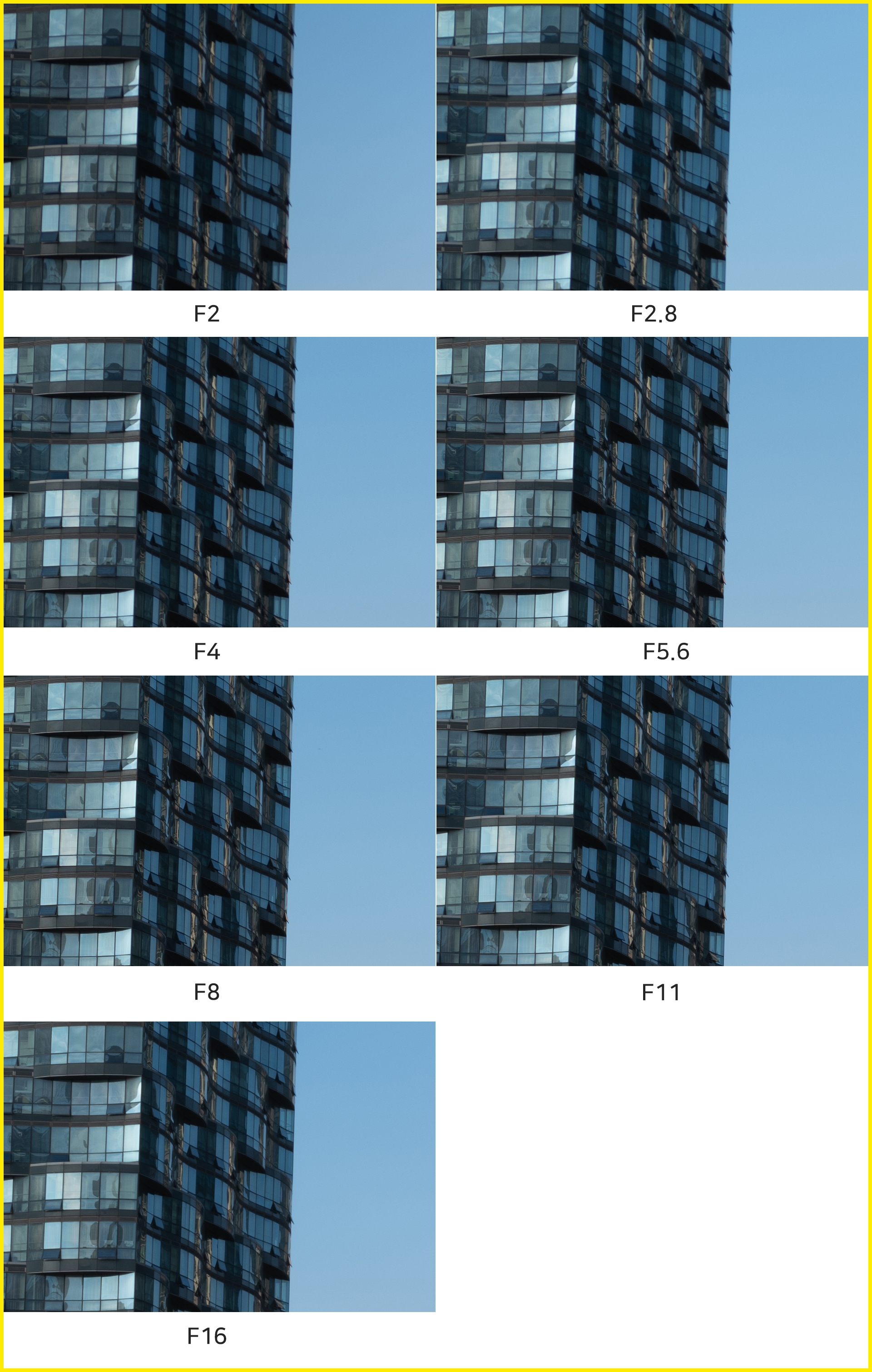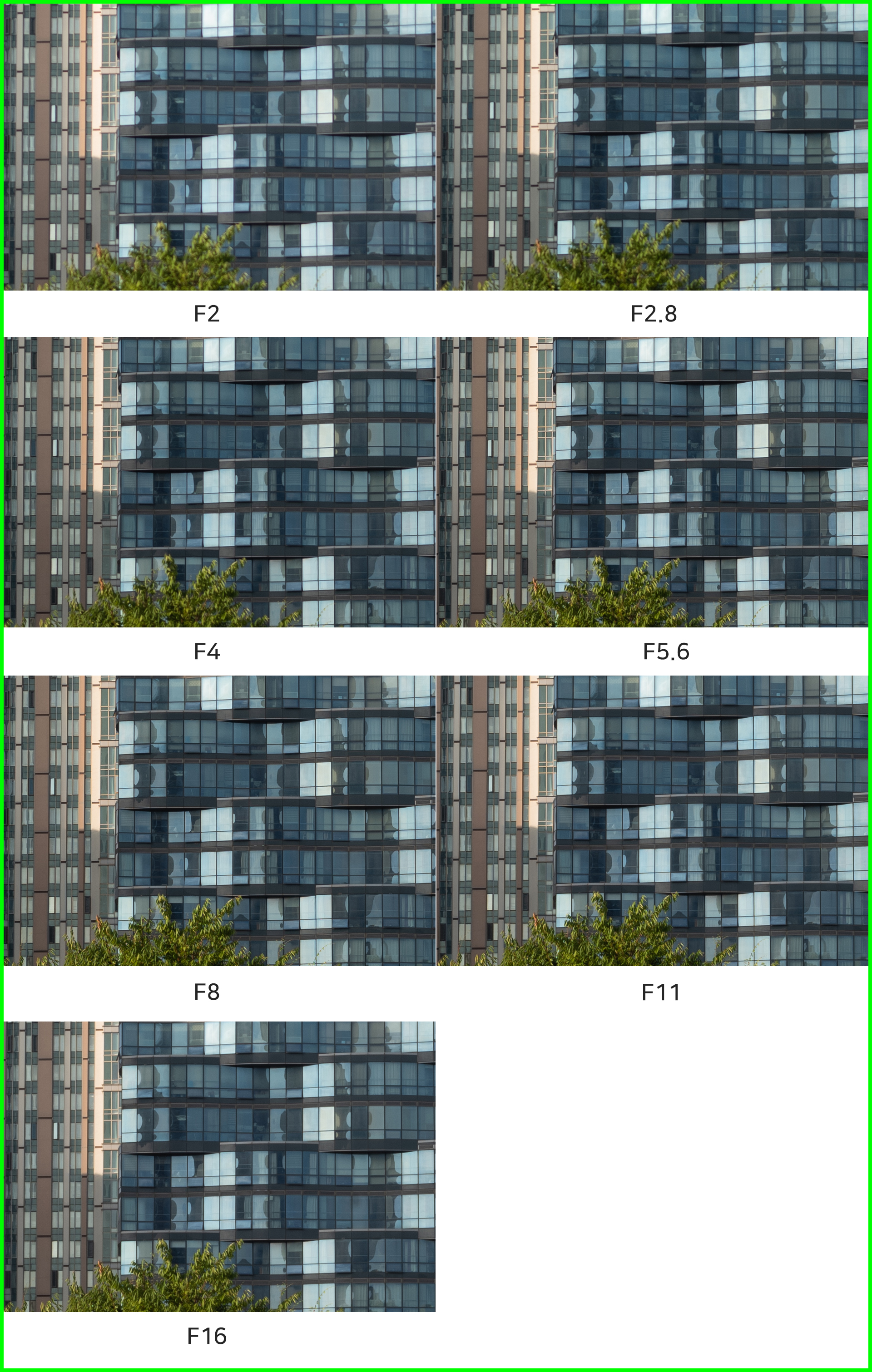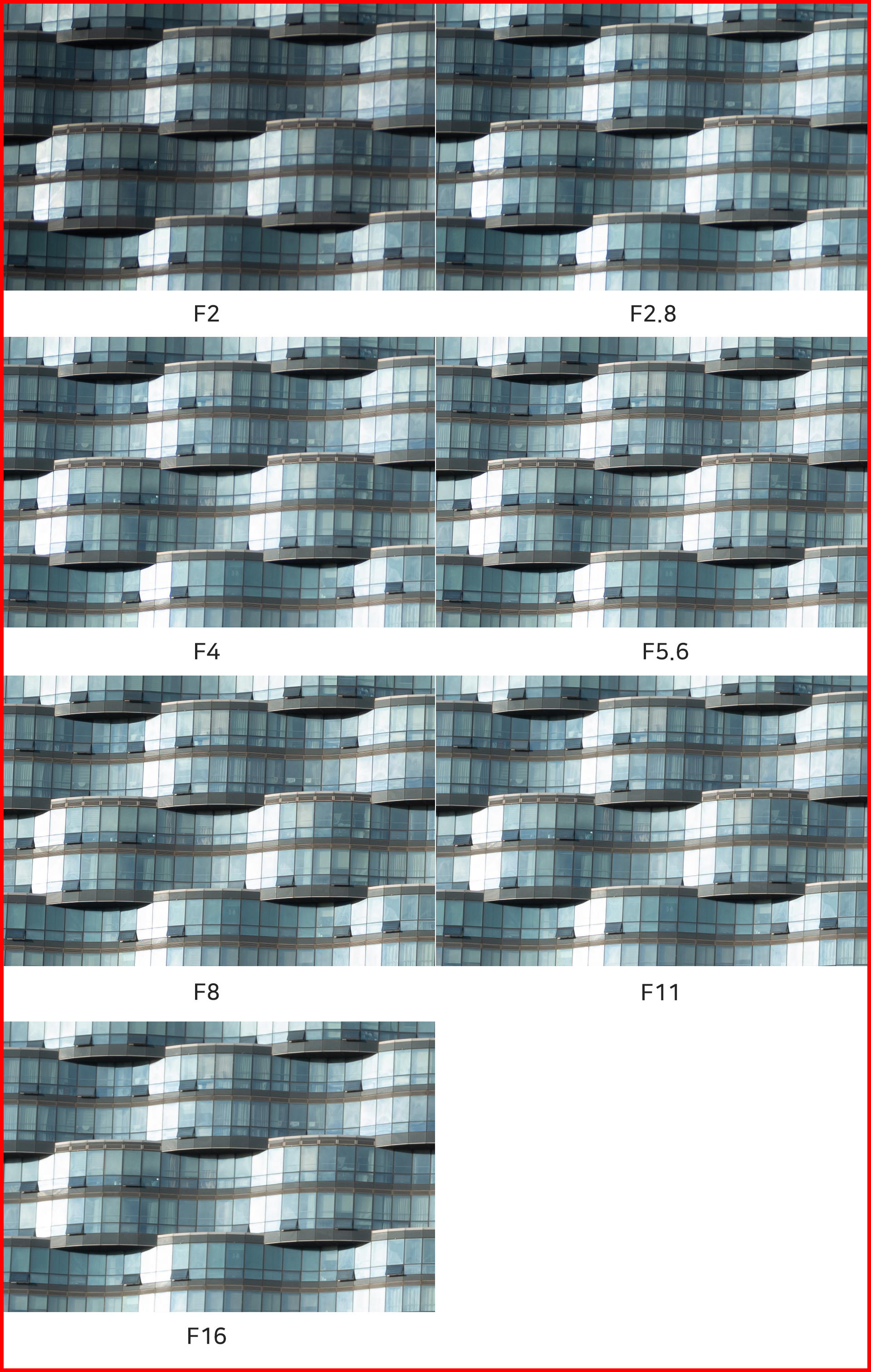 F2 최대 개방의 이미지가 놀라울 정도로 샤프하다 생각했지만, 조리개 값에 따른 결과물을 나란히 놓고 비교하니 미세하게 흐린 느낌이 있습니다. 물론 그 폭이 일반적인 렌즈에 비해 적어서 이미지 품질에 대한 걱정으로 F2 최대 개방 촬영을 피할 필요는 없습니다. F2.8 조리개 값부터 해상력이 향상돼 F11까지 균일하게 유지됩니다. 가장 높은 F16 값에서는 회절 현상으로 인해 약간의 해상력 저하가 있지만 이것 역시 F2 촬영과 비슷한, 매우 좋은 수준입니다.
