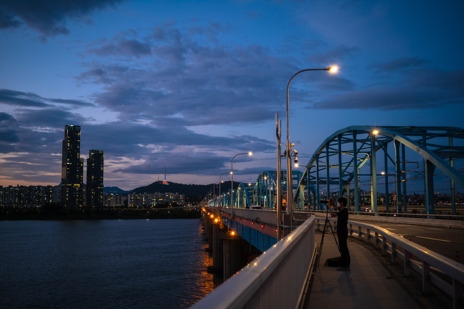 용산과 동작,반포를 잇는 동작대교. 자전거 라이딩 때 종종 지나치는 곳이지만 여기서 노을을 볼 생각은 못했는데 이미 유명한 야경 스팟인지 커다란 카메라와 삼각대를 놓고 촬영하시는 분들이 많았습니다. 지하철로 갈 경우 2번 출구에서 바로 다리 위를 오를 수 있어요. 양쪽으로 노을 감상하기 좋은 카페가 있는 것도 특징. 뷰 좋은 루프탑이 있지만 사실 카페 옆 다리 위에서 봐도 충분합니다.