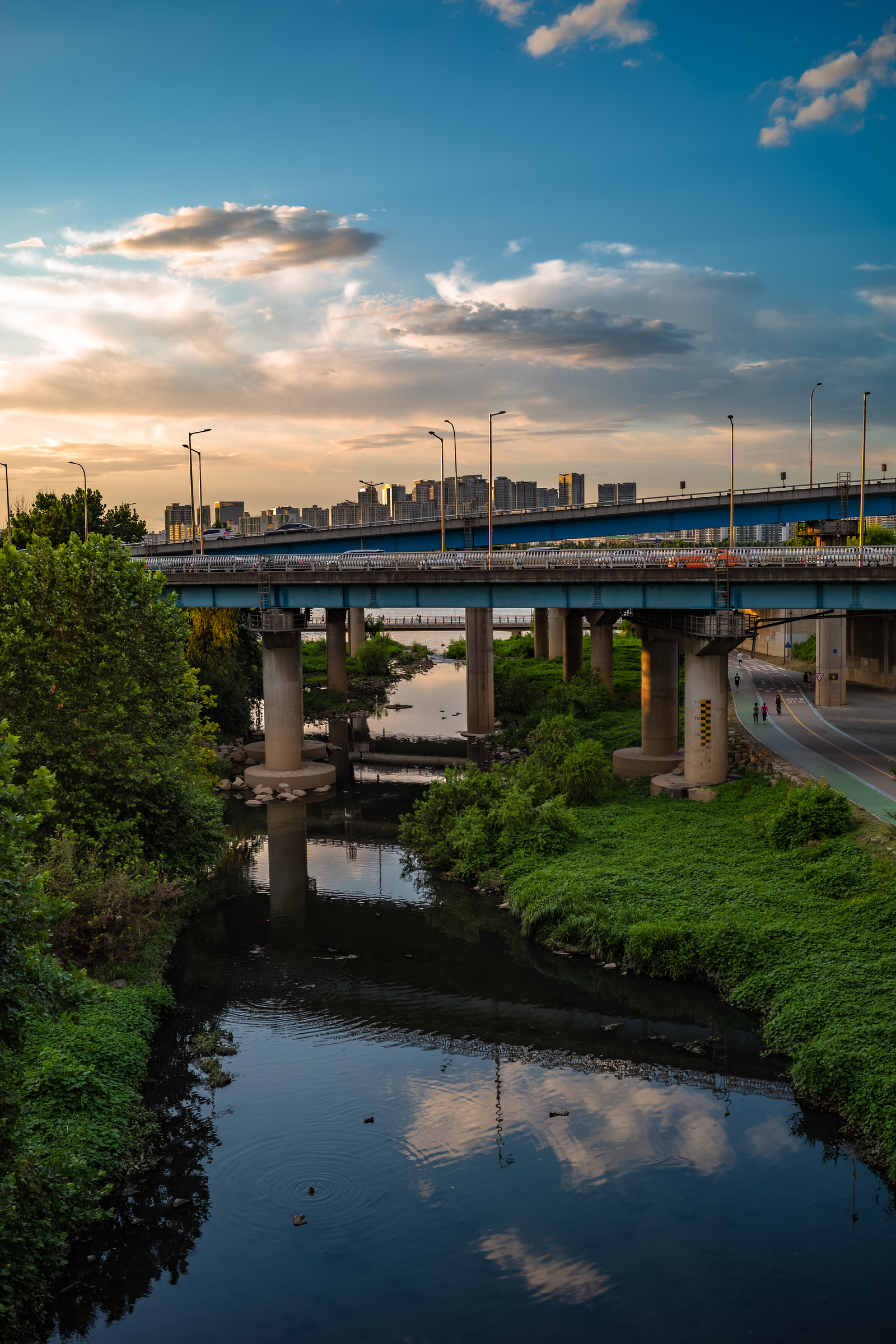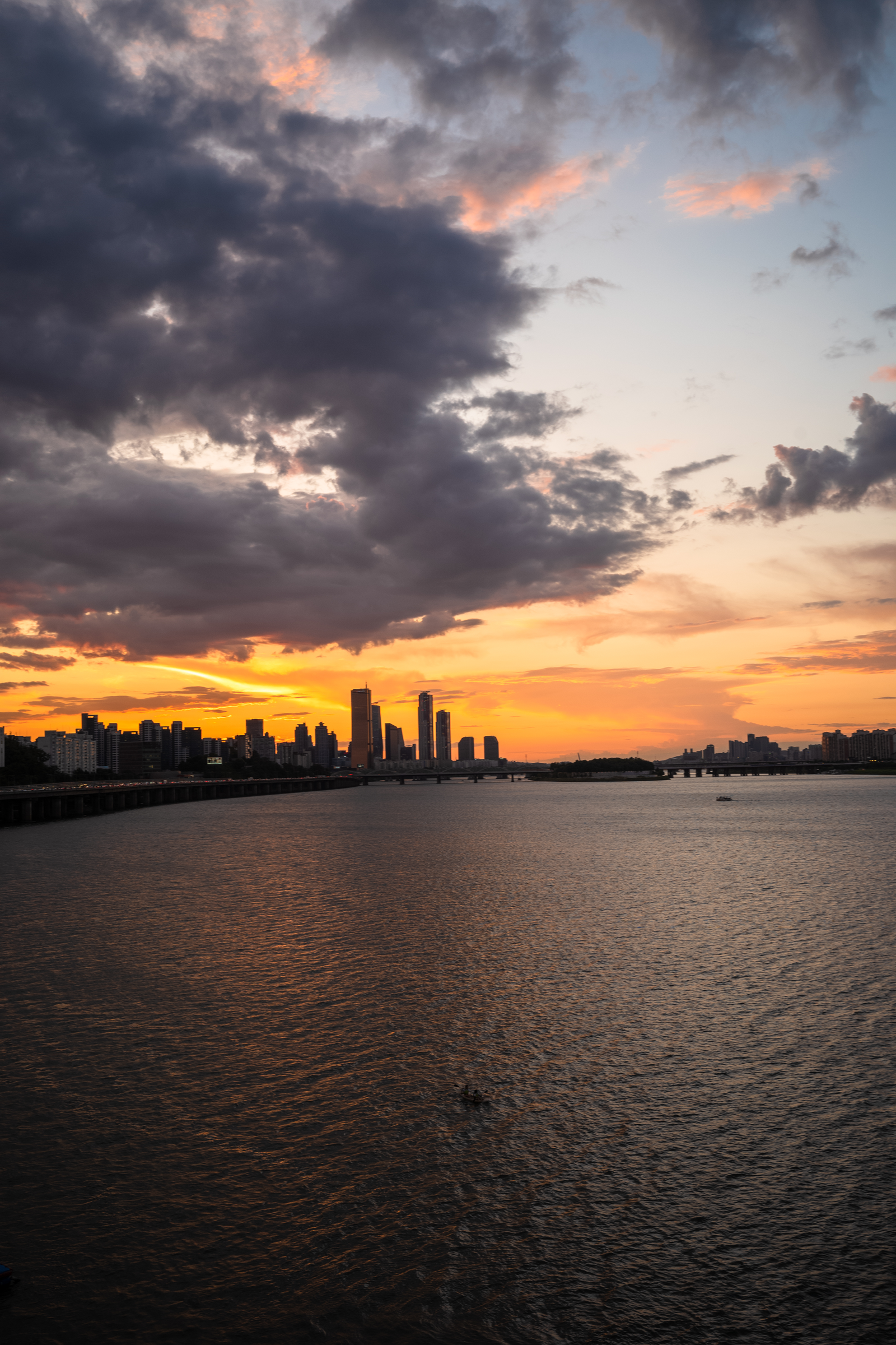 제가 도착한 시각은 일곱 시 남짓. 몇 주 전 동호대교에 갔던 날 일몰 시간이 여덟시 쯤이었는데 이날은 일곱시 반만 돼도 깜깜해지더라고요. 계절의 변화가 생각보다 꽤 빠르다는 생각을 했습니다. 붉게 물든 노을 아래로 도시의 스카이 라인과 자동차 헤드라이트, 하나 둘 켜지기 시작한 가로등 불빛 그리고 붉은 빛으로 물든 한강을 감상했습니다. 때마침 한강 위를 유영하는 카약 한 대가 있어 운치가 있었어요.