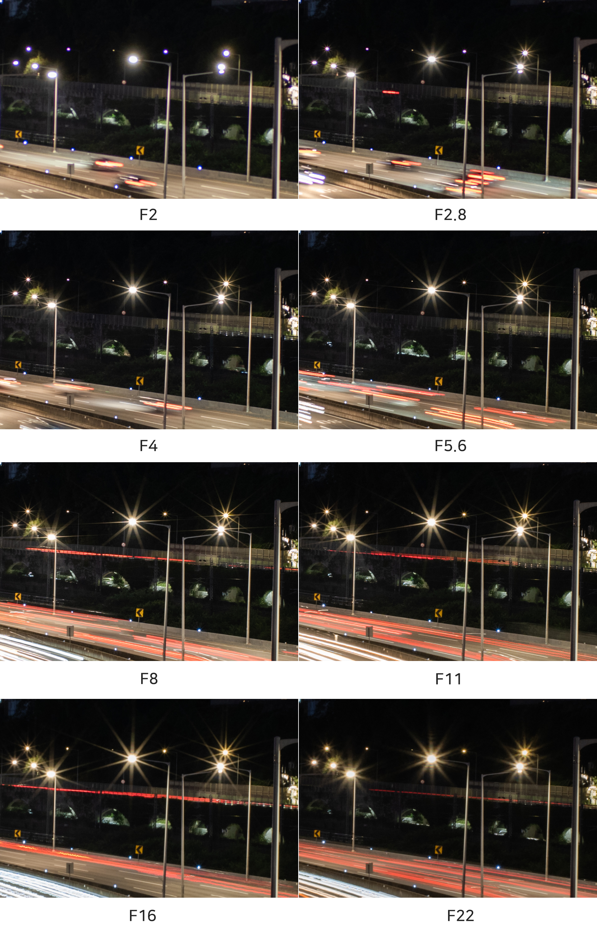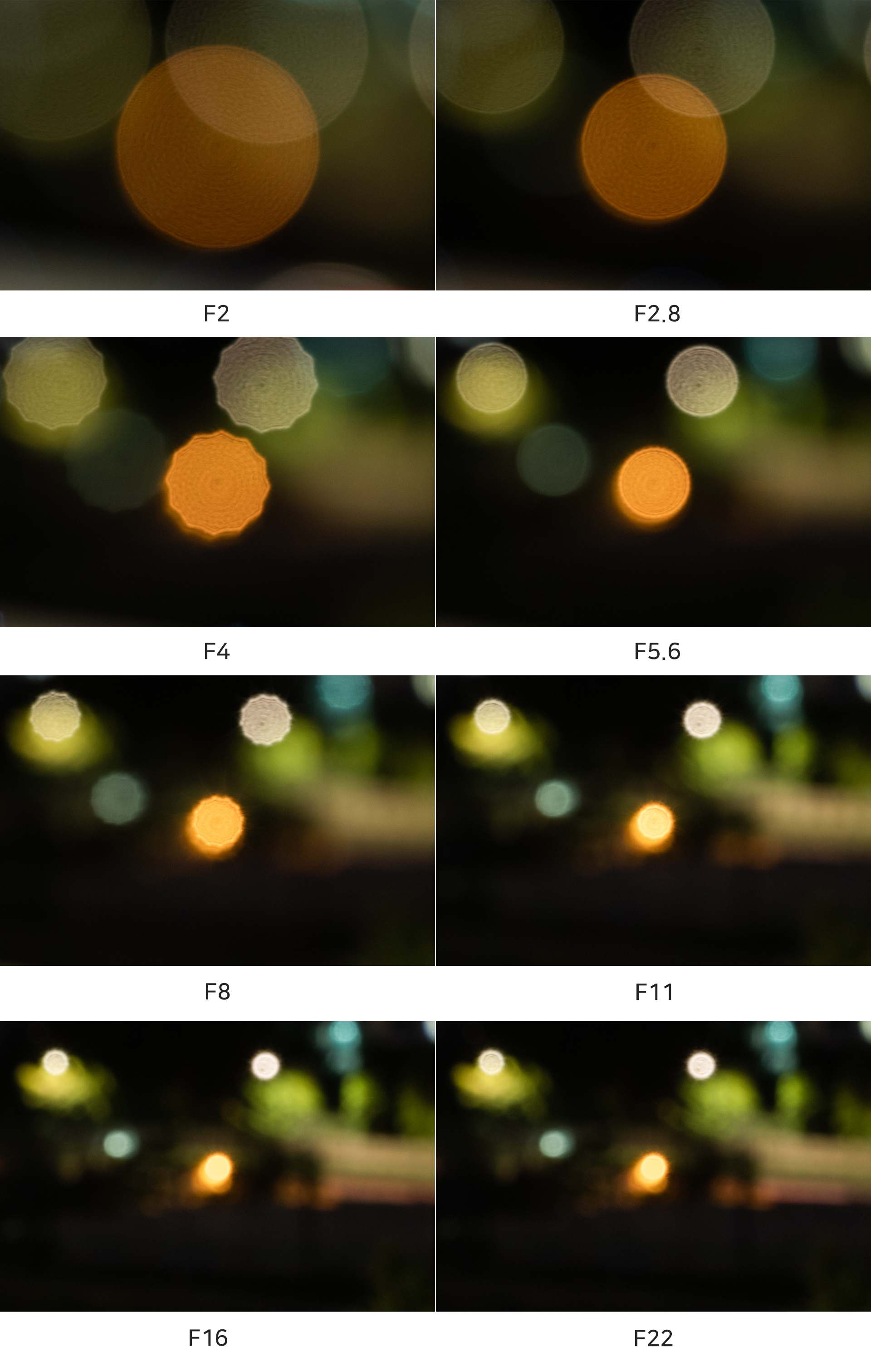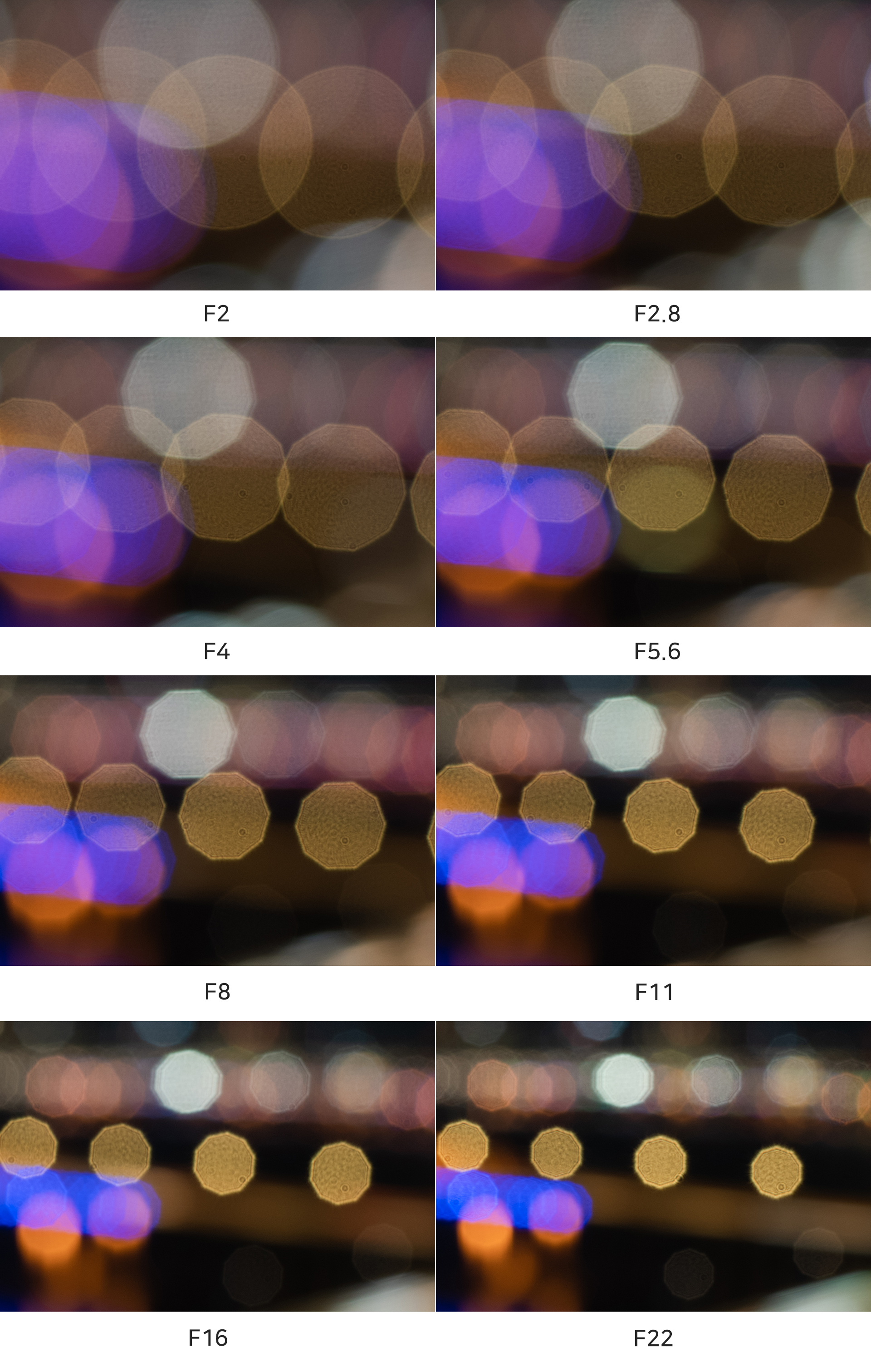 조리개 값에 따른 보케의 형태를 비교해 보았습니다. F2에서 완전한 원형으로 표현되며 이후 조리개 값이 높아지면서 점차 10각형의 형태로 변합니다. 10매 조리개 날을 채용한 결과입니다. 조명의 모양과 밝기에 따라 원형 보케가 유지되는 조리개 값에 변화가 있습니다.