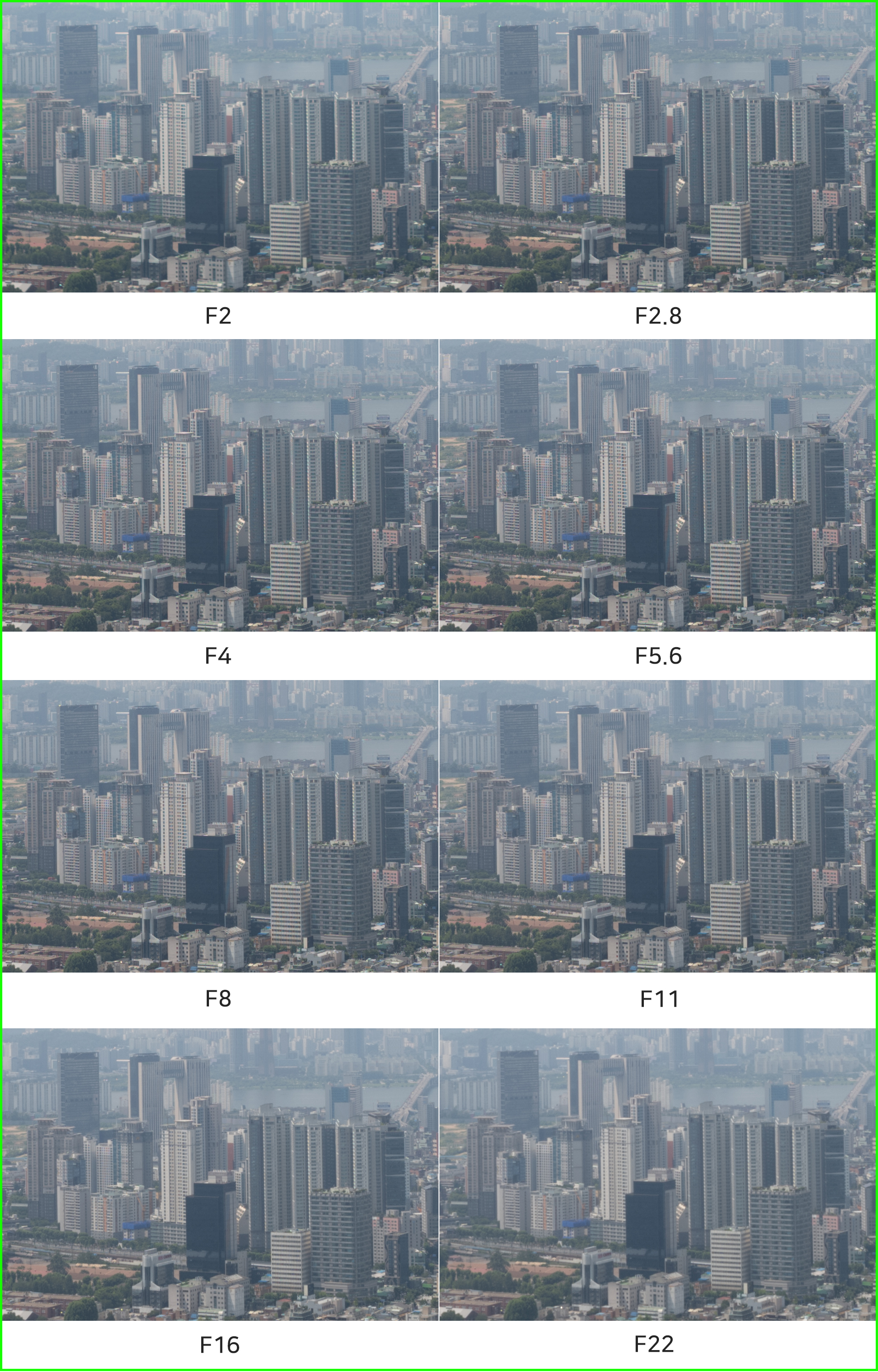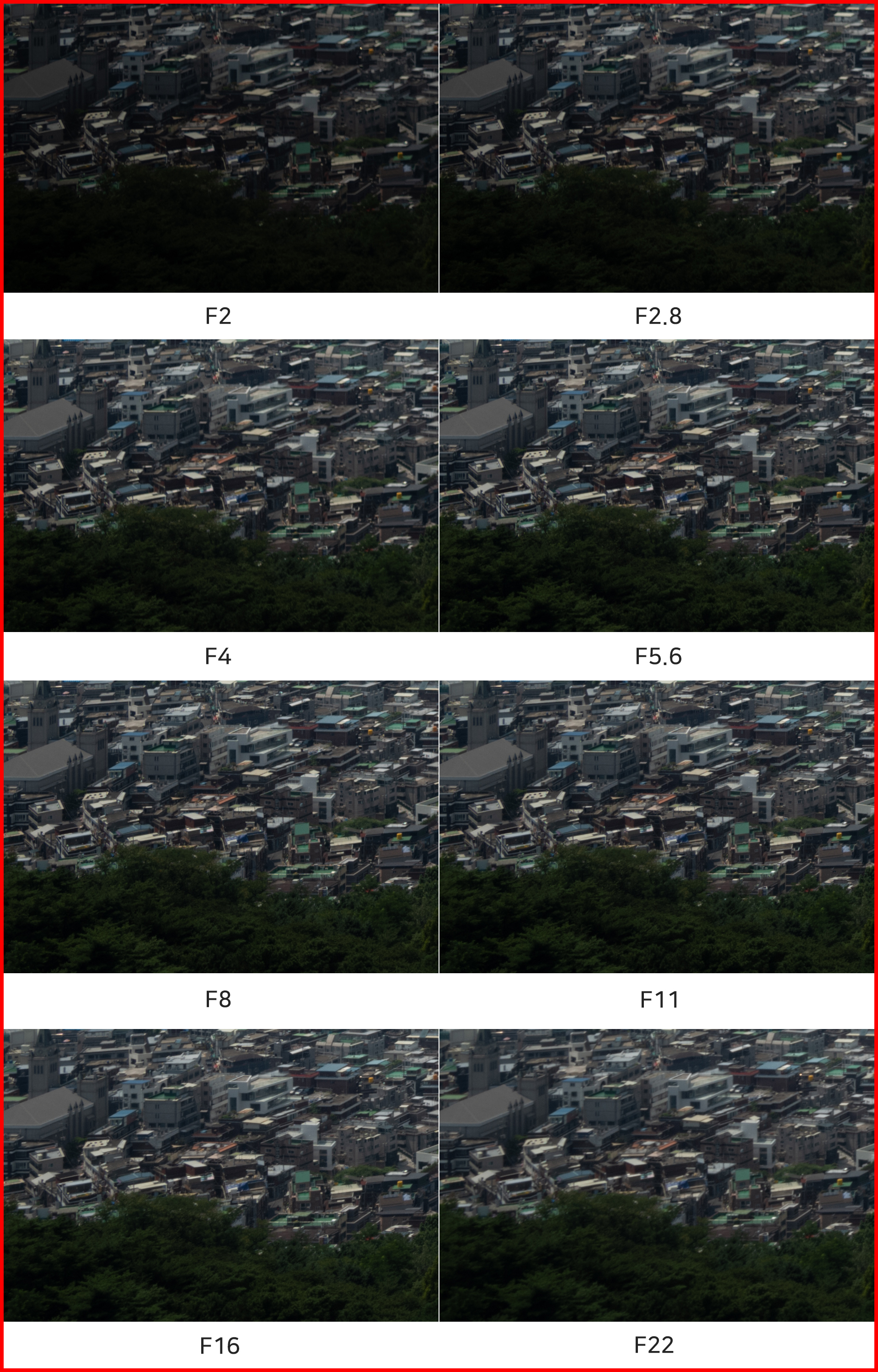 육안상 큰 차이를 느끼지 못했지만 F2 최대 개방과 F2.8 조리개 값을 나란히 비교하니 역시나 약간의 해상력 차이가 있습니다. 다만 그 차이가 100% 확대가 아닌 이상 크게 느껴질 정도는 아니라 F2 최대 개방 촬영을 적극 활용하기에 무리 없습니다. 이후로 F2.8부터 F16까지 해상력이 비교적 균일하게 유지되며 F16 이상에선 회절 현상으로 인한 해상력 저하가 있습니다.