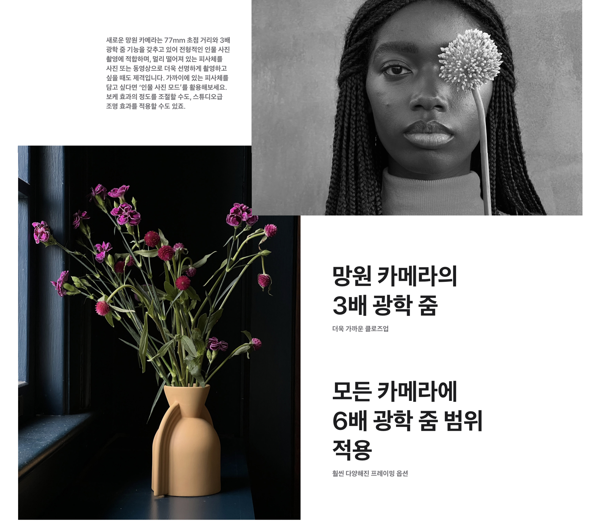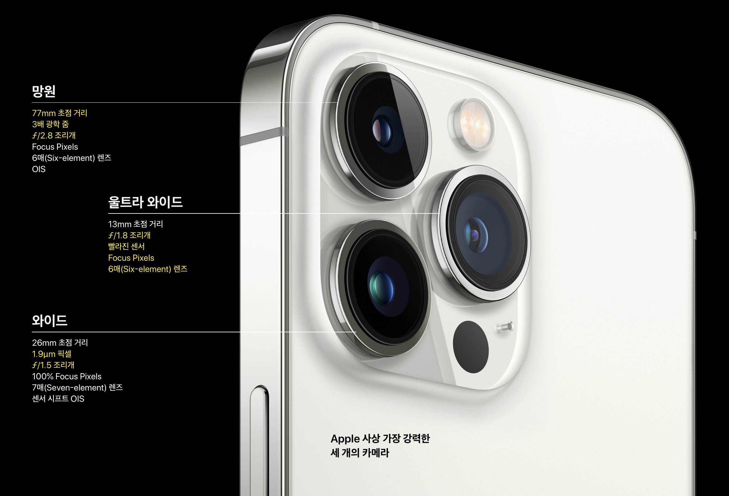 카메라의 수는 이전과 동일한 초광각/광각/망원 셋입니다. 다만 카메라의 크기와 면적이 증가한만큼 사양 역시 향상됐습니다. 노란색 글씨 부분이 이전 모델 대비 향상/변화한 내용으로 망원 카메라는 초점거리가 77mm로 변경돼 클로즈업 성능이 향상됐고, 울트라 와이드 렌즈는 F1.8의 밝은 조리개 값과 AF 성능 향상을 꼽을 수 있습니다. 기본 광각 카메라는 화질에 직접적인 영향을 미치는 이미지 센서의 크기가 커졌고 조리개 값 역시 F1.5로 밝아져 큰 폭의 화질 향상을 기대할 수 있게 됐습니다.
