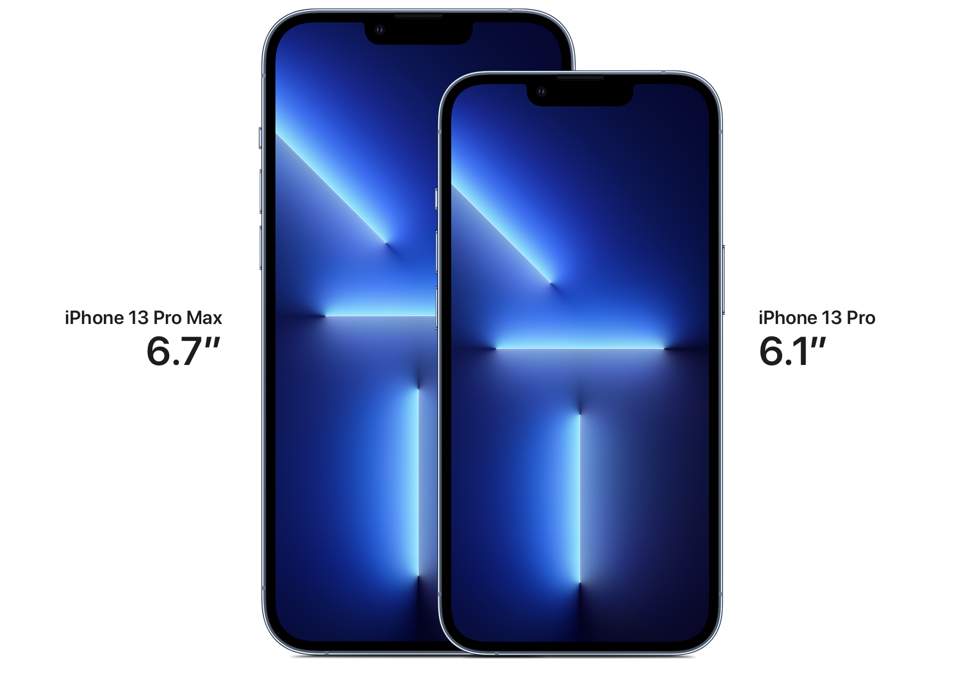 아이폰 13 프로 라인업은 전작과 동일하게 6.1인치 프로 모델, 6.7인치 프로 맥스 모델로 출시됐습니다. 디스플레이 크기에 따라 나뉜 것으로 전작은 카메라 사양에서 일부 차이가 있었지만 이번엔 화면 크기와 배터리 정도를 제외하면 동일 사양입니다.