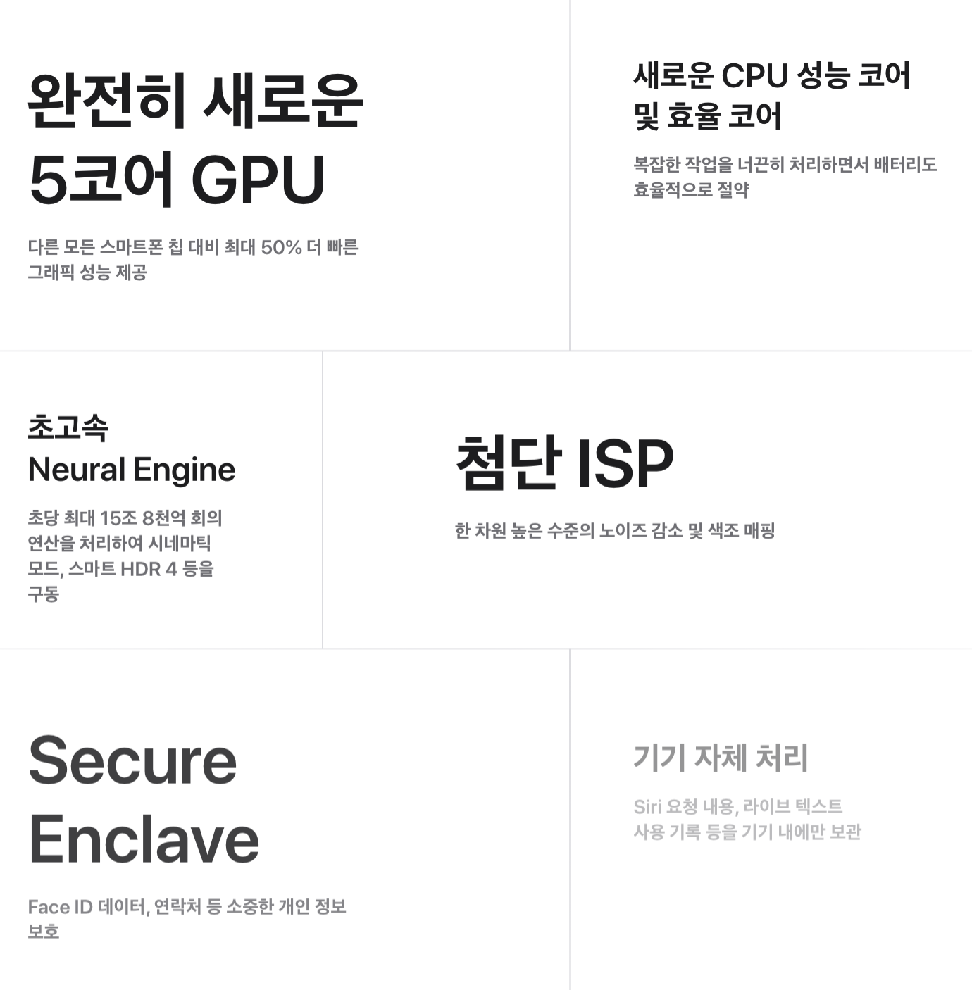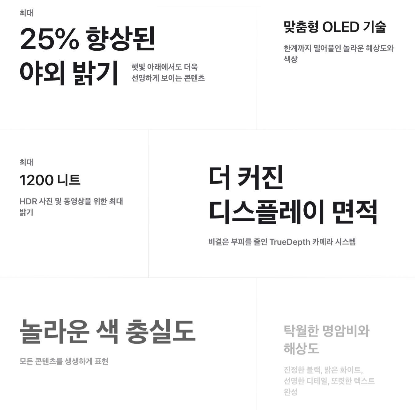 그 밖에 더 밝고 선명해진 화면, 더 향상된 A 칩 성능 등의 업데이트 내용이 있습니다. 이건 매년 반복되는 것이라 몇 년 전부터는 눈길이 가지 않더군요. 당연히 작년 아이폰보다 더 좋아졌겠지, 라면서요.
