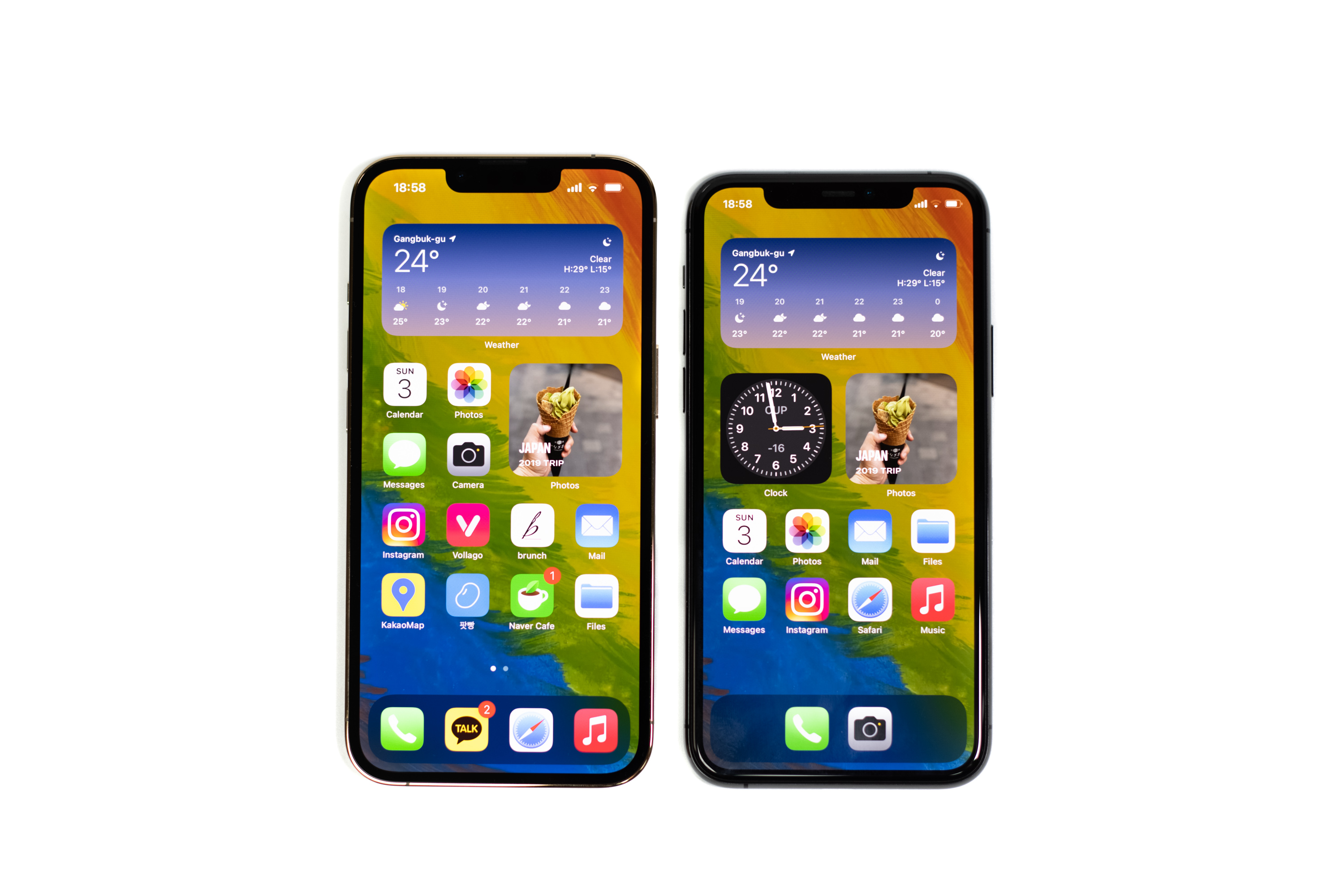 아이폰 13 프로와 11 프로의 크기 비교. 6.1인치와 5.8인치로 화면 크기에 차이가 있고 그로 인해 제품 크기도 차이가 있습니다. 5.8인치 아이폰이 한 손에 쥐기 이상적인 크기였다면 6.1인치 아이폰은 한 손 사용의 경계에 아슬아슬하게 있는 것 같습니다. 게다가 측면 프레임이 직선이라 그립감도 별로 좋지 않아요.
