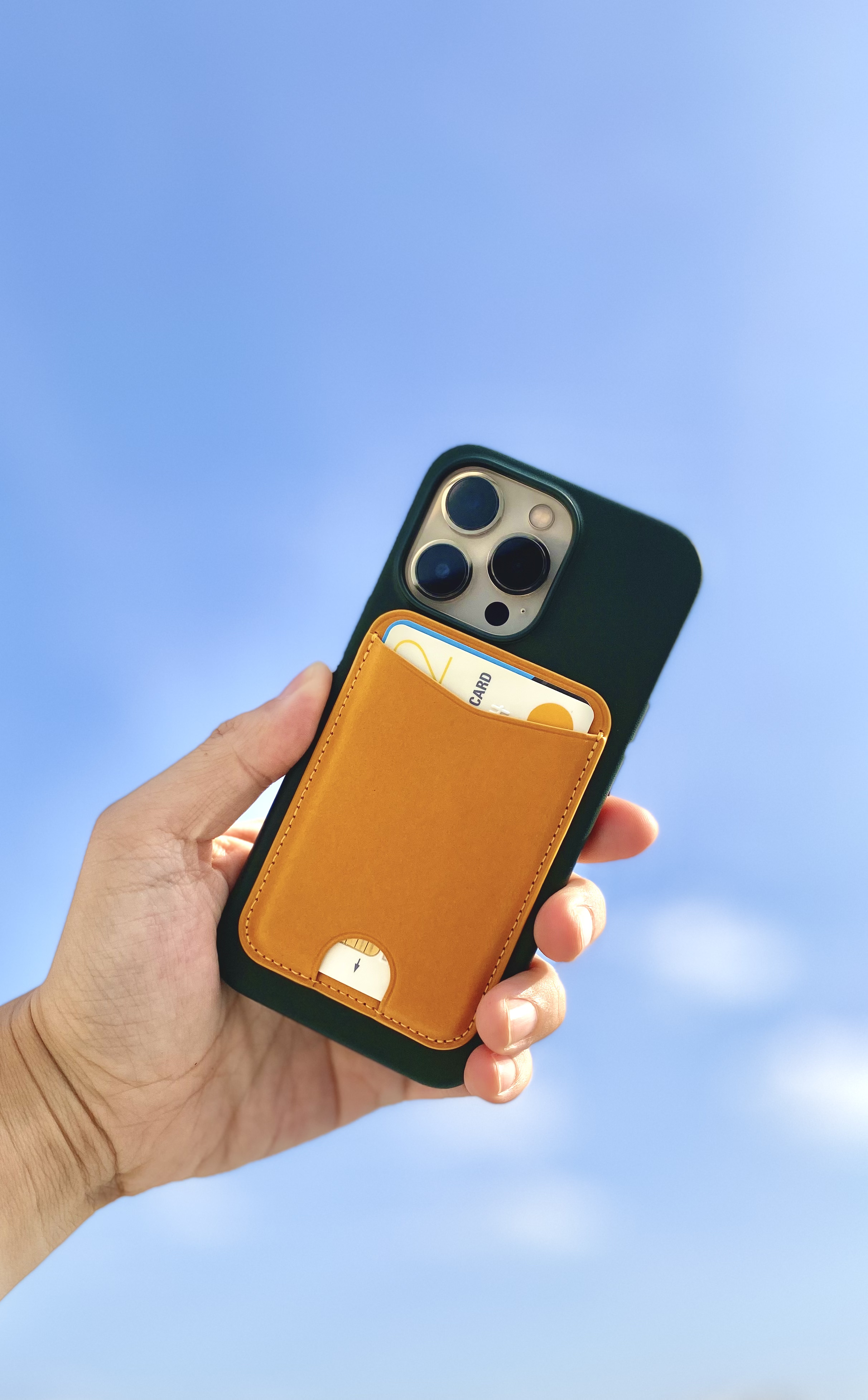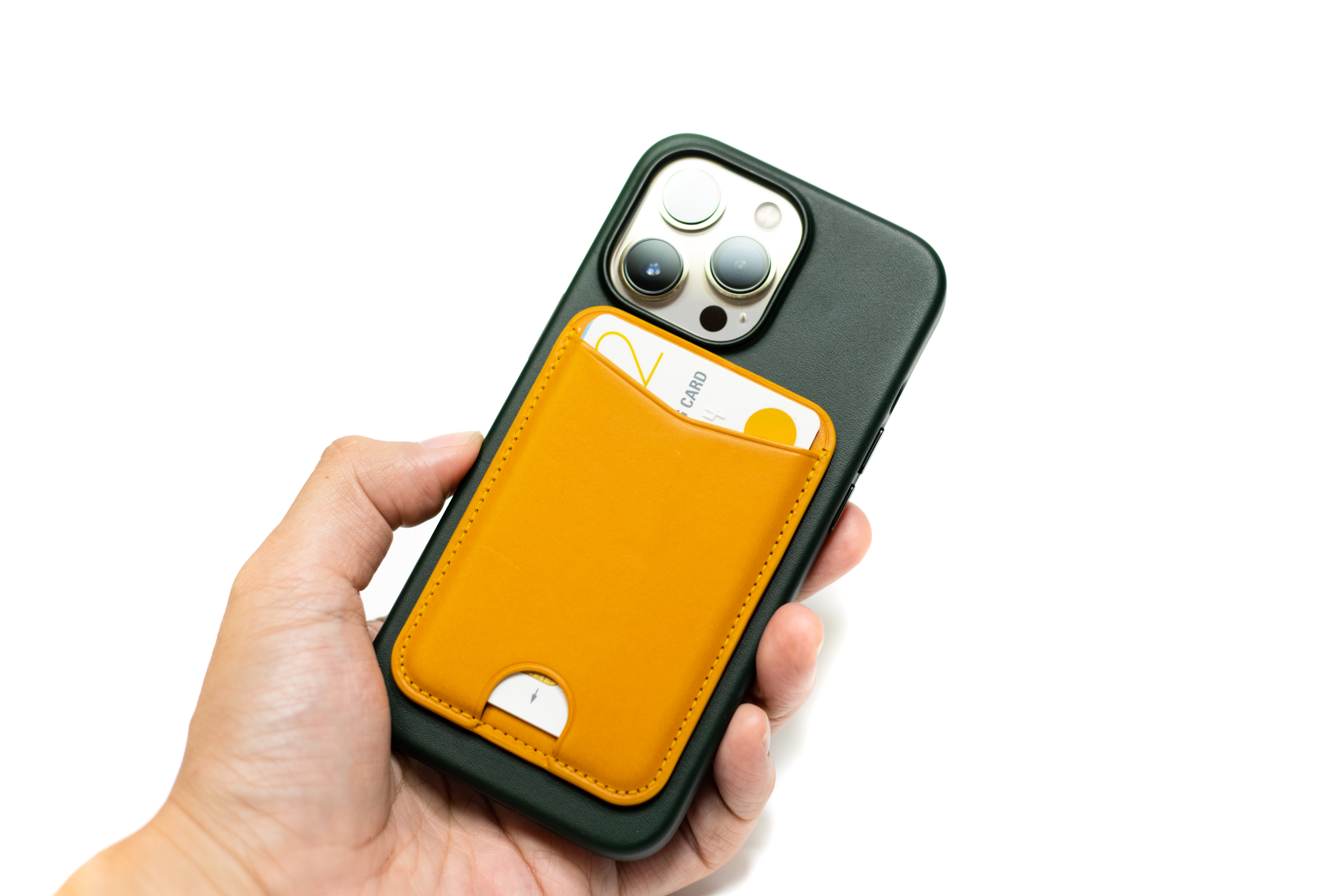 미리 준비해 둔 디그니스 카드 지갑까지 장착하니 아이폰 사용할 준비가 끝났습니다. 골드 아이폰과 그린 가죽 케이스 그리고 노란색 카드 지갑의 조화를 기대하면서 주문했는데, 예상만큼 잘 어울려 기쁩니다. 전보다 더 비싸졌지만 그래도 애플 정품 가죽 케이스는 여전히 첫 번째로 추천할 만한 케이스입니다.