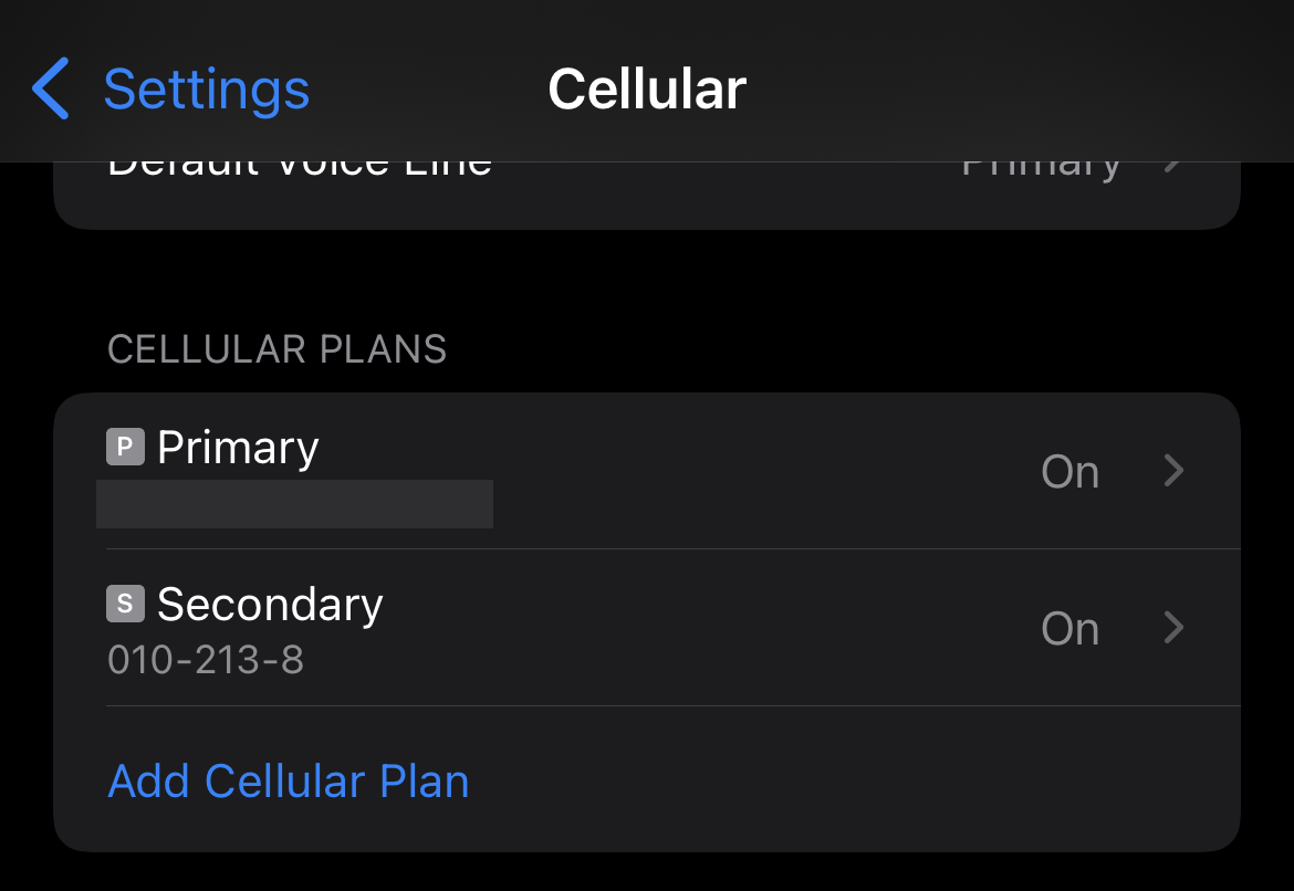 아이폰의 셀룰러 옵션에서 - 셀룰러 플랜 추가를 누르면 새 번호 추가 시작.