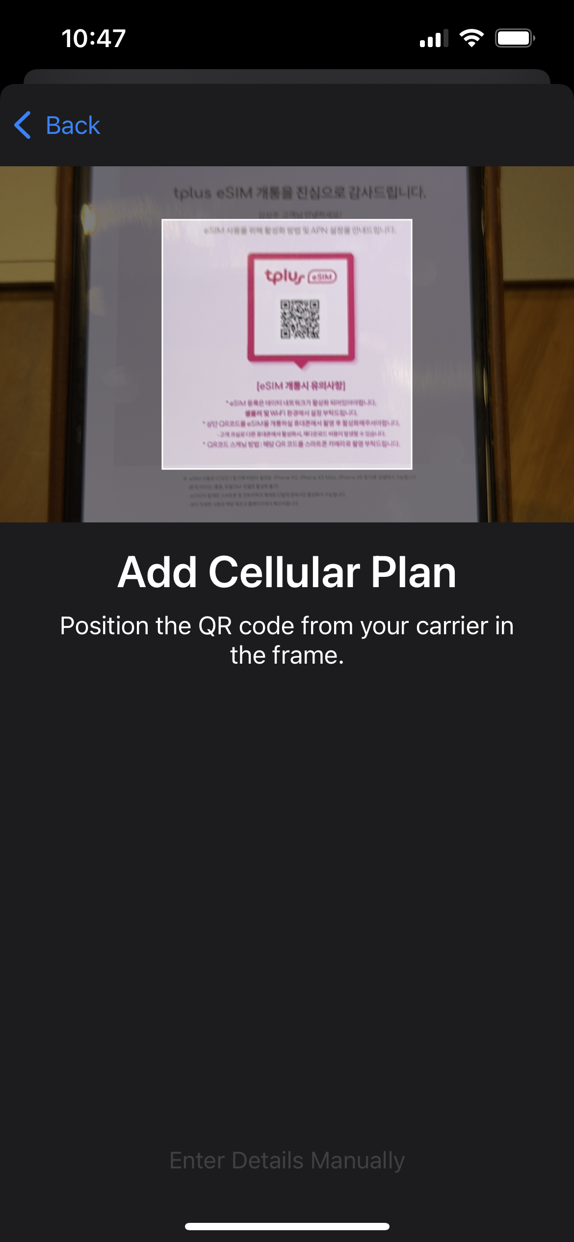 카메라로 QR 코드를 인식하면 바로 회선 추가 작업이 진행됩니다. 티플러스 통신사를 확인한 뒤 번호 정보를 선택합니다.