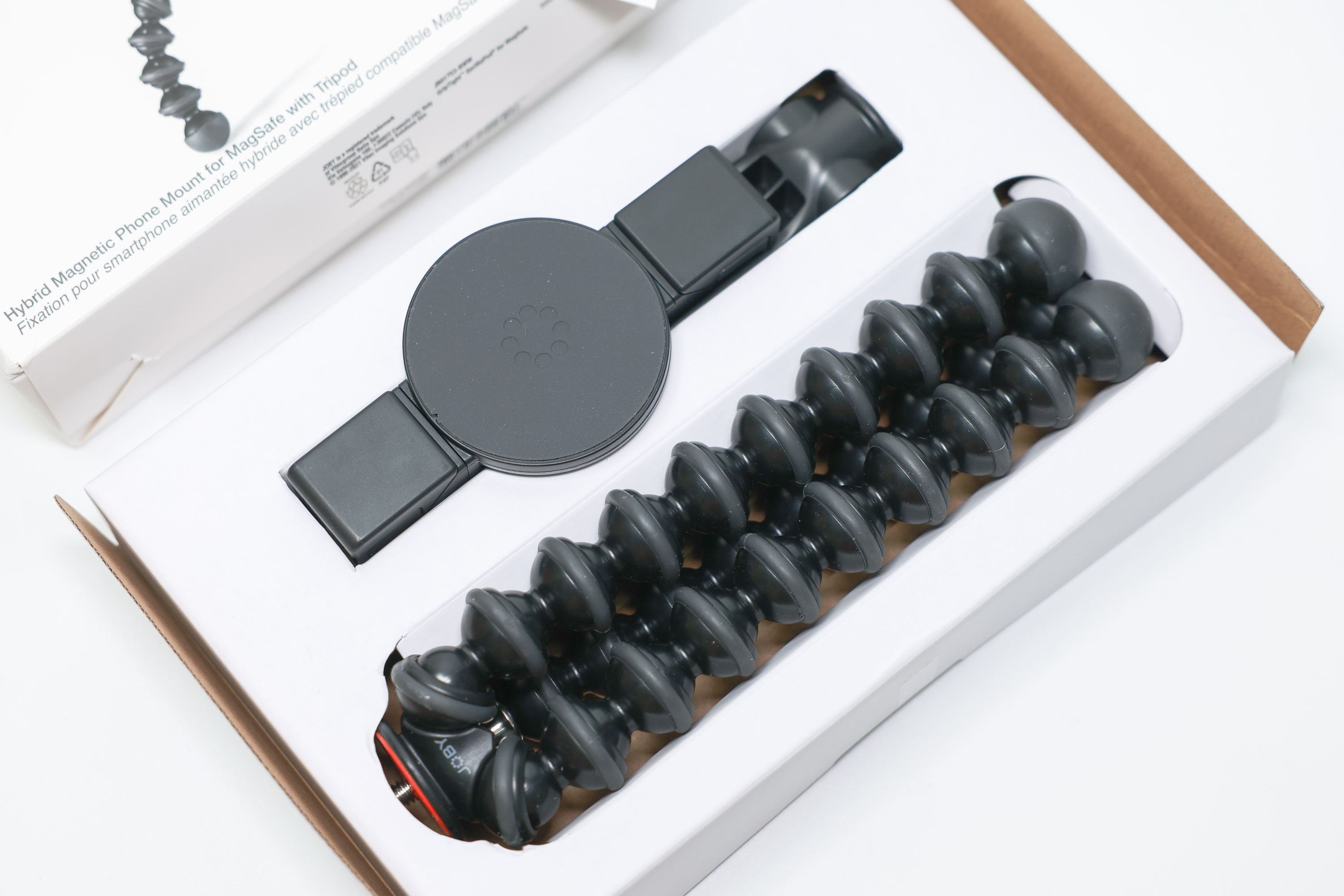 구성품은 맥세이프 거치대와 고릴라포드 삼각대로 이뤄져 있습니다. 나사 방식으로 둘을 결합하는 방식입니다. 나사는 카메라의 삼각대 홀과 호환되기 때문에 고릴라 포드를 소형 카메라 또는 삼각대 플레이트에 결합해 사용할 수도 있습니다. 고릴라포드 삼각대만의 길이는 약 20cm 입니다.
