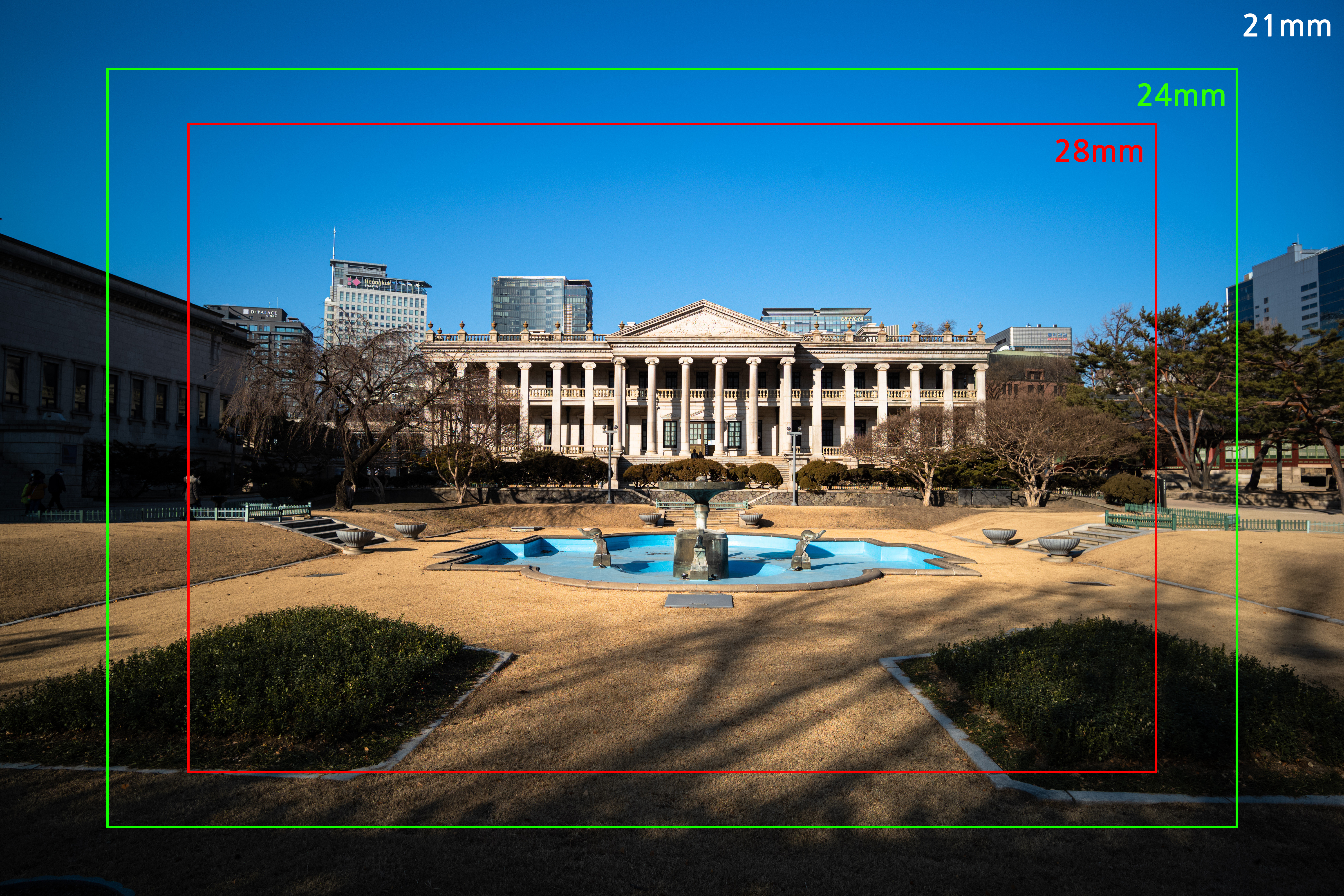 컬러스코파 21mm F3.5 렌즈의 프레임은 말 그대로 시원합니다. 단순히 뒤로 물러나는 것에서 느낄 수 없는 빨려들 것 같은 몰입감이 있어요. 위 이미지는 주요 광각 프레임의 너비 차이를 비교한 것입니다. 일반적으로 사용하는 24,28mm 프레임에 비해 그 차이가 확연합니다. 광각에서는 초점거리 1mm 차이가 매우 크다고들 하죠.