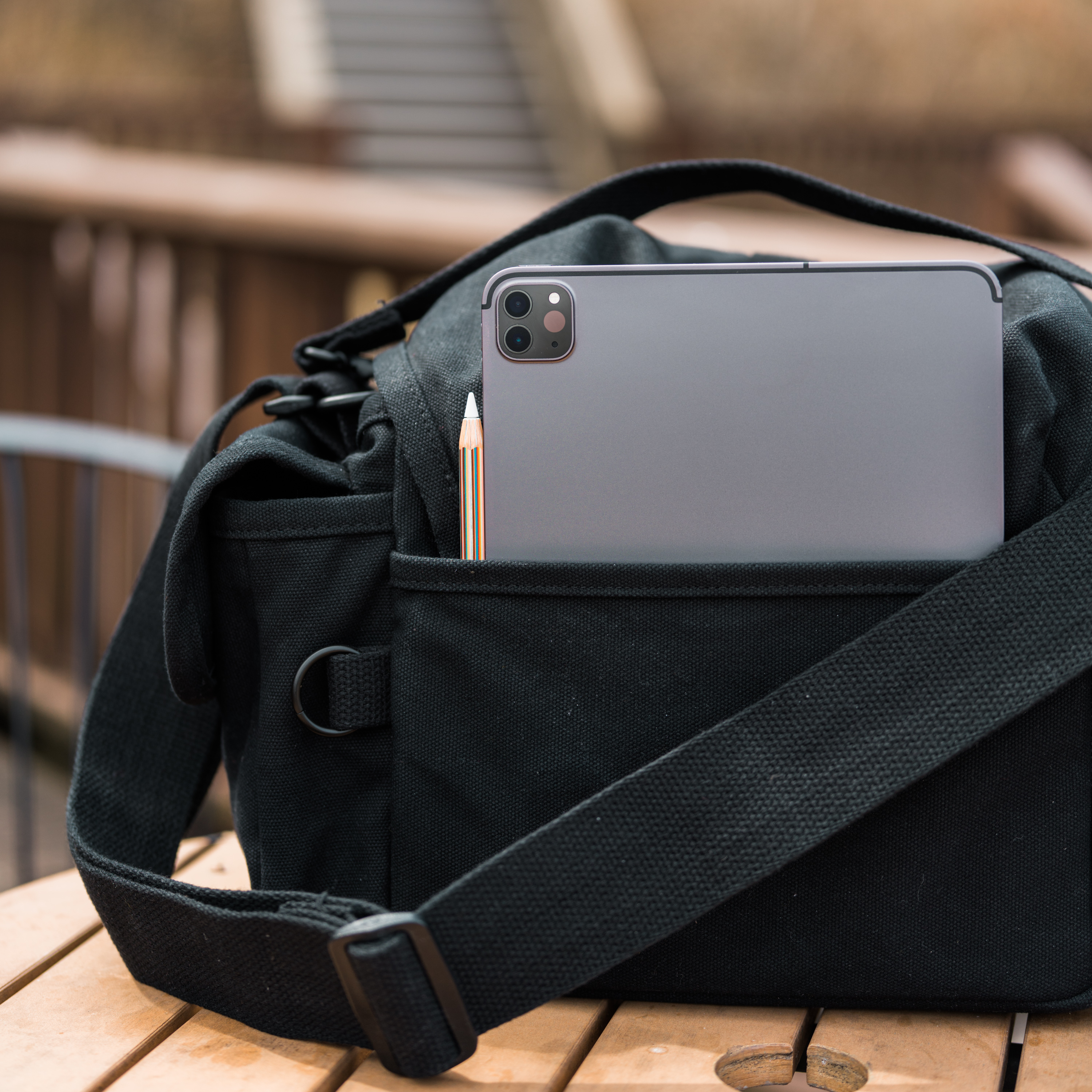 덮개 안쪽에 있는 주머니에는 아이패드 11인치 모델이 딱 맞게 들어갑니다. 카메라 내부 공간이 아이패드 11인치에 맞춰져 있어서 노트북까지 함께 휴대하기엔 무리지만 카메라, 렌즈에 태블릿까지 휴대할 수 있는 점이 저는 오히려 장점으로 느껴졌습니다.