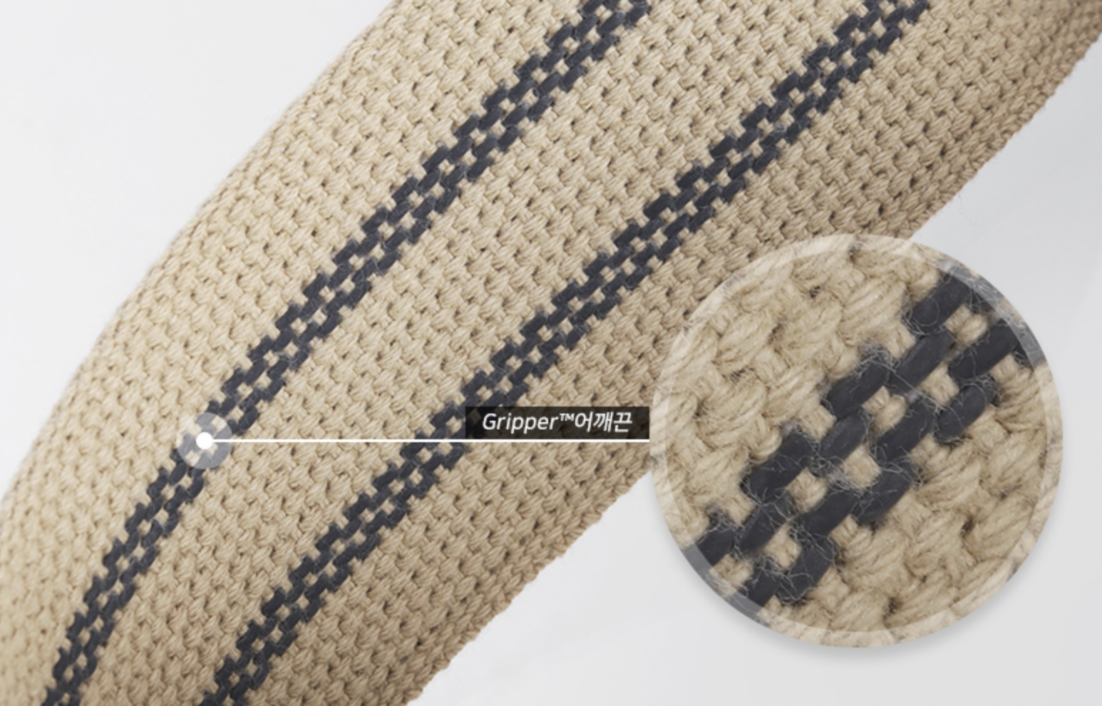 스트랩은 제가 이 가방에서 가장 좋아하는 부분입니다. 패브릭 짜임에 고무 소재를 포함시켜 어깨에서 미끄러지는 것을 방지했습니다. 두 줄이나 배치돼 있어 고정 효과가 설명만큼 뛰어납니다. 가방이 미끄러져 불편을 자주 겪었던 저는 이 스트랩만 떼다 다른 가방에 붙이고 싶을만큼 마음에 들었습니다.