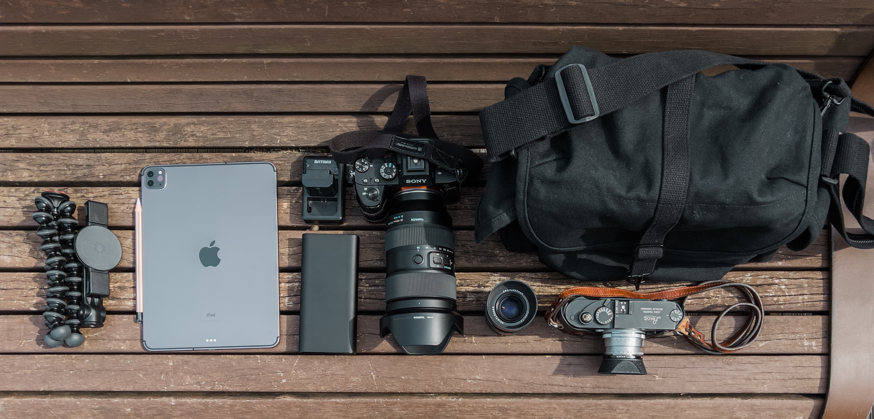 비교적 가벼운(?) 출사에 챙긴 장비들을 꺼내 보았습니다. 대구경 줌렌즈 탐론 35-150mm F2-2.8을 마운트한 풀 프레임 미러리스 카메라 A7R3와 보이그랜더 울트론 35mm F2 렌즈를 마운트 한 풀 프레임 RF 카메라 라이카 M10-D, 추가 렌즈로 보이그랜더 아포-란타 50mm F2를 챙겼습니다. 거기에 소형 삼각대와 카메라 충전용 보조 배터리, 2구 충전기와 추가 배터리, 아이패드 프로 11인치까지 여유있게 수납이 가능합니다.