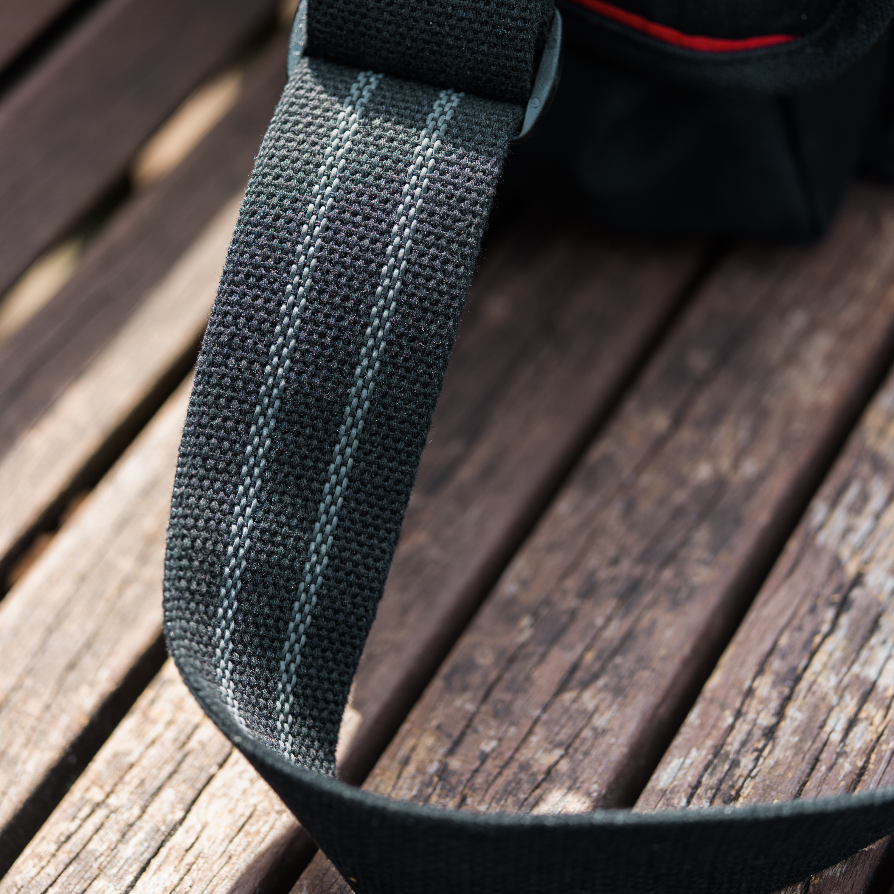미끄럼 방지 처리가 된 스트랩은 몇 번을 칭찬해도 부족하지 않습니다. 무거운 카메라 가방이 어깨에서 미끄러져 떨어질 때의 가슴 철렁함, 가방이 미끄러지지 않도록 어깨에 힘을 주고 다닌 후의 피로감을 겪어 봤다면 왜 다른 가방에는 이런 장치가 없을까 의문이 들 정도입니다. 스트랩에 포함된 고무 소재는 손으로 쓸어 만질 때도 확연히 마찰이 다르며 나일론처럼 미끄러운 소재로 된 옷을 입었을 때도 기존 스트랩 대비 확실히 안정적입니다.