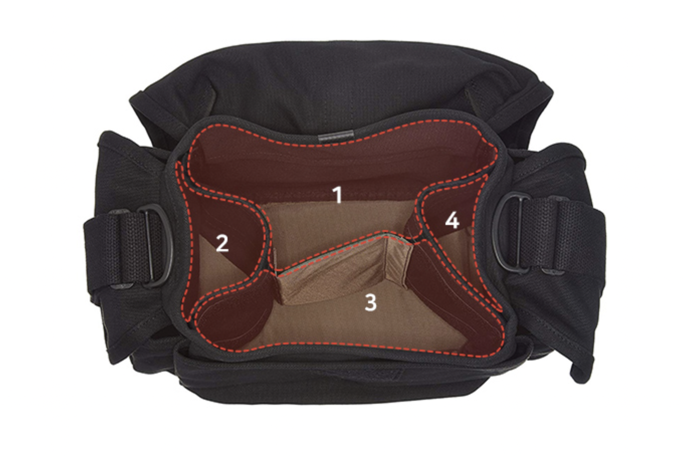 내부는 큰 장비를 보관하는 중앙 공간과 추가 렌즈, 액세서리를 수납할 수 있는 양쪽 포켓으로 나뉘어 있습니다. 여기에 파티션으로 중앙 공간을 둘로 나눠 사용할 수 있는 것이 특징입니다. 파티션을 제외할 경우 대구경 렌즈를 마운트한 카메라를 넣을 수 있을만큼 넉넉합니다. 카메라와 렌즈를 합쳐 20cm에 달하는 장비를 넣을 수 있습니다.
