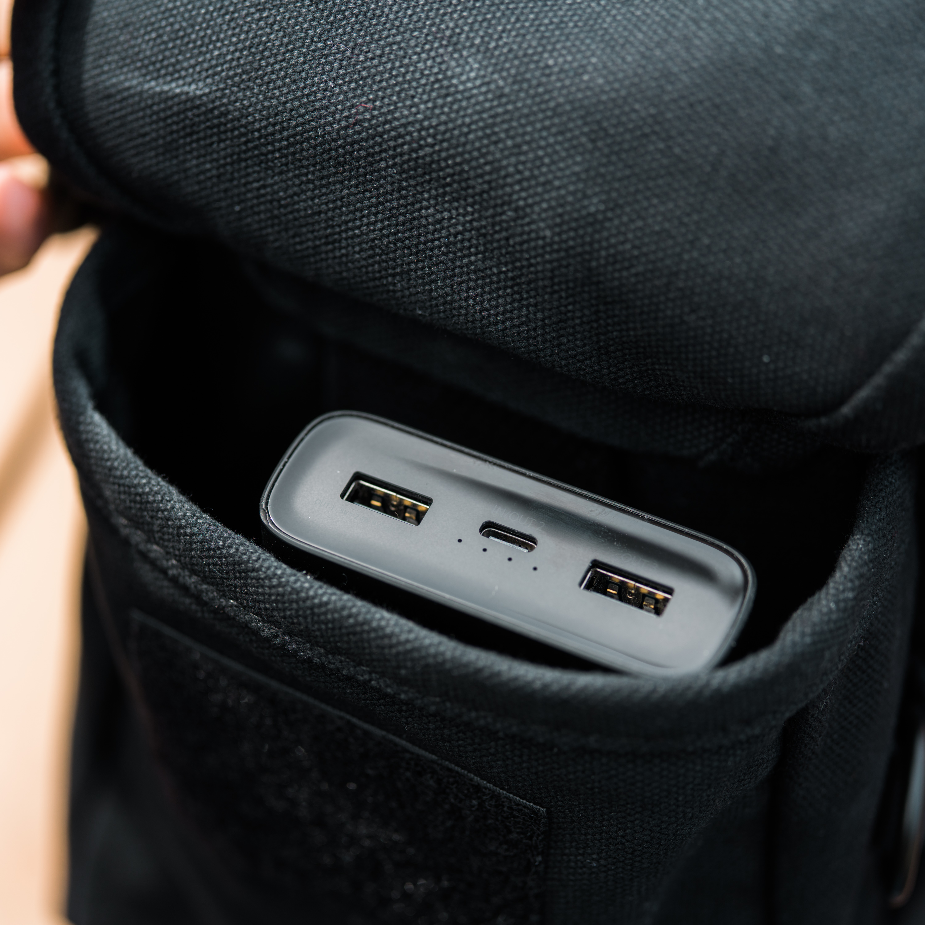덮개 안쪽에는 지퍼로 여닫을 수 있는 공간이 추가로 마련돼 있습니다. 여긴 아무래도 작고 가벼운 그리고 자주 꺼내지 않는 소품류가 적당할 것 같습니다. 저는 출사, 여행 때 여기에 추가 배터리와 충전기를 넣어 보관합니다. 다만 비가 올 때는 덮개 부분이 수분에 취약하기 때문에 주의하는 것이 좋겠습니다.