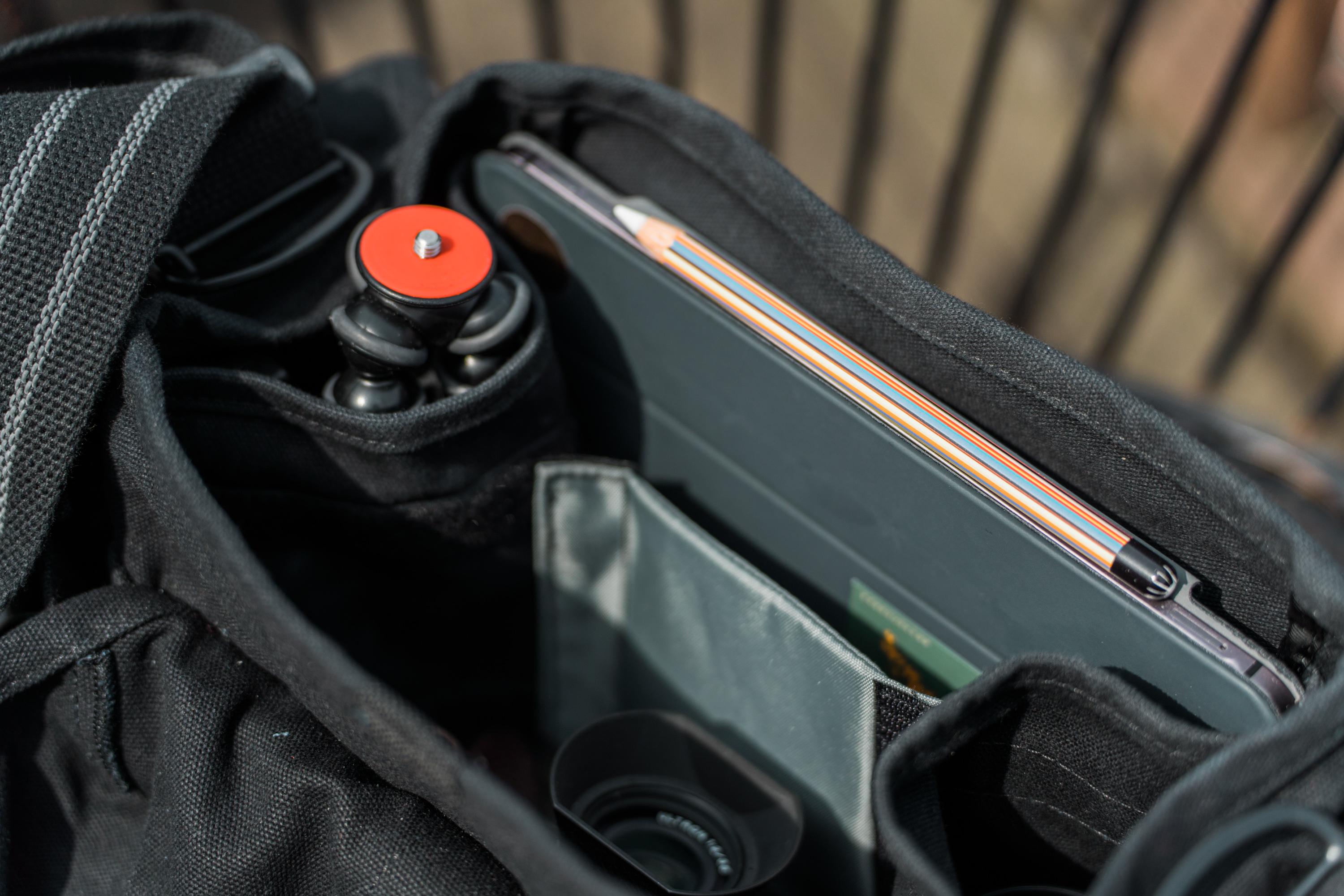 덮개 안쪽에 있는 주머니에는 아이패드 11인치 모델이 딱 맞게 들어갑니다. 카메라 내부 공간이 아이패드 11인치에 맞춰져 있어서 노트북까지 함께 휴대하기엔 무리지만 카메라, 렌즈에 태블릿까지 휴대할 수 있는 점이 저는 오히려 장점으로 느껴졌습니다.