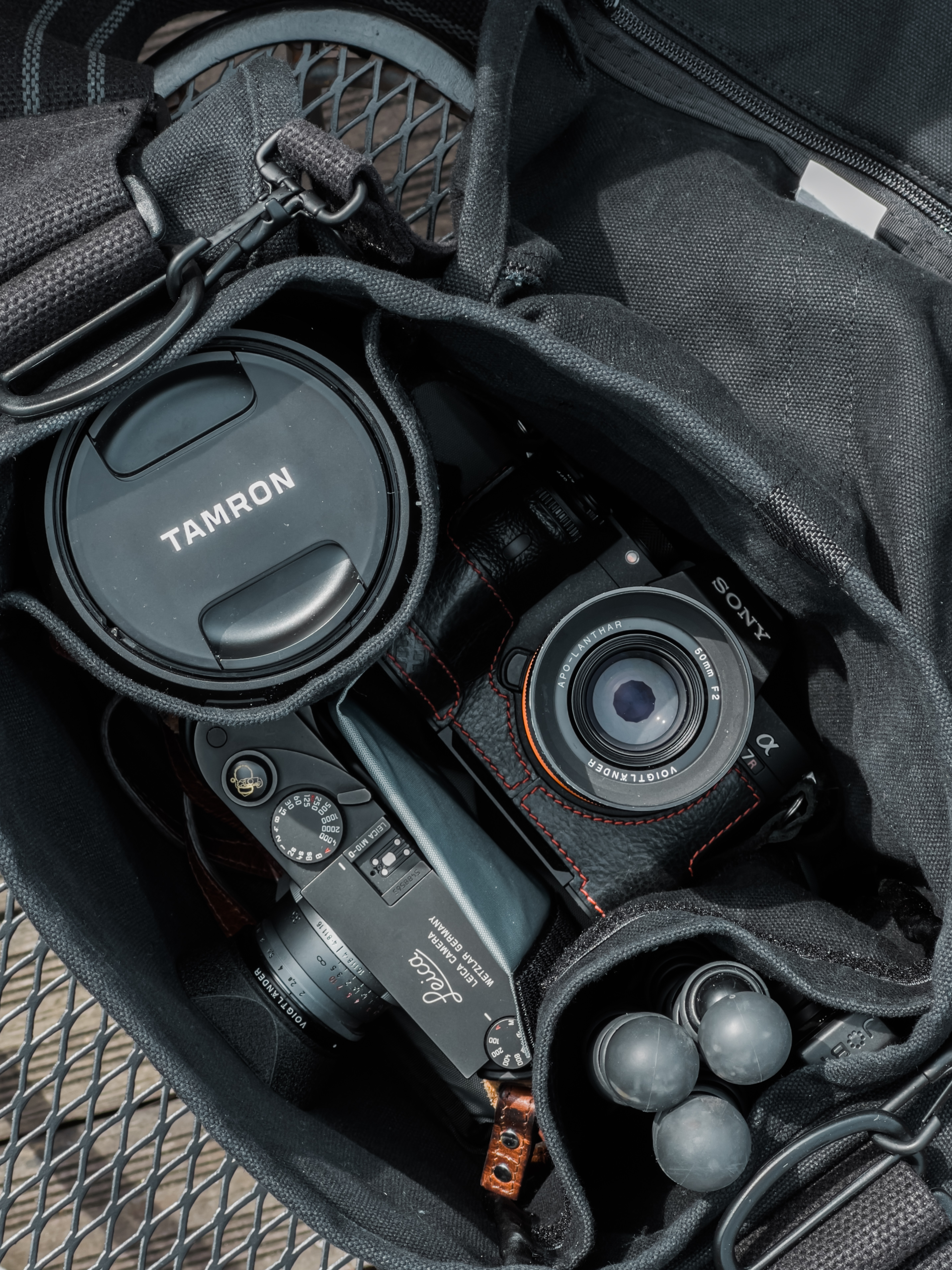 비교적 가벼운(?) 출사에 챙긴 장비들을 꺼내 보았습니다. 대구경 줌렌즈 탐론 35-150mm F2-2.8을 마운트한 풀 프레임 미러리스 카메라 A7R3와 보이그랜더 울트론 35mm F2 렌즈를 마운트 한 풀 프레임 RF 카메라 라이카 M10-D, 추가 렌즈로 보이그랜더 아포-란타 50mm F2를 챙겼습니다. 거기에 소형 삼각대와 카메라 충전용 보조 배터리, 2구 충전기와 추가 배터리, 아이패드 프로 11인치까지 여유있게 수납이 가능합니다.