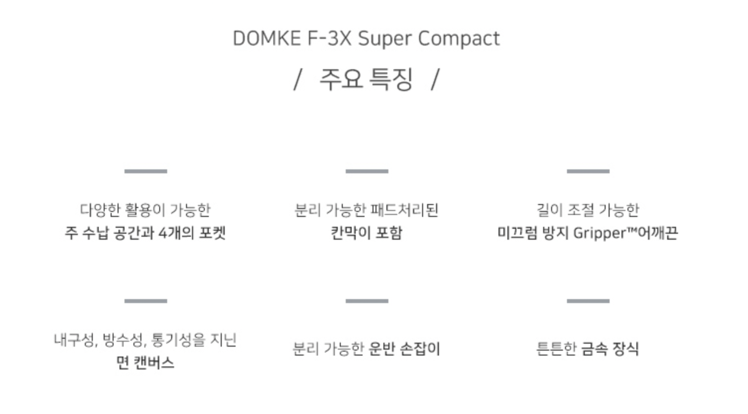 돔케 F-3X 카메라 가방의 소개 페이지를 아래 덧붙입니다. 궁금하신 분들은 방문해 보세요.