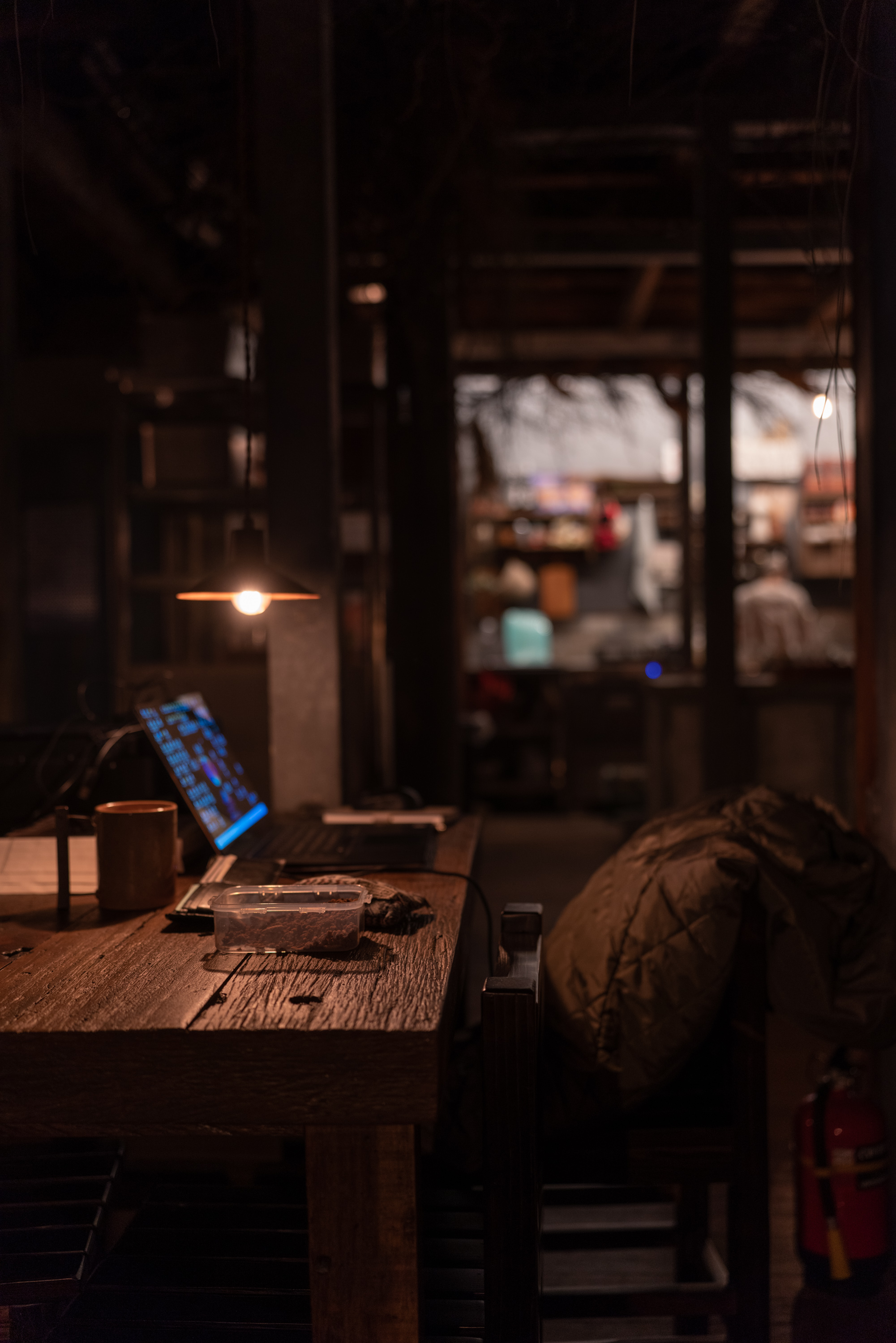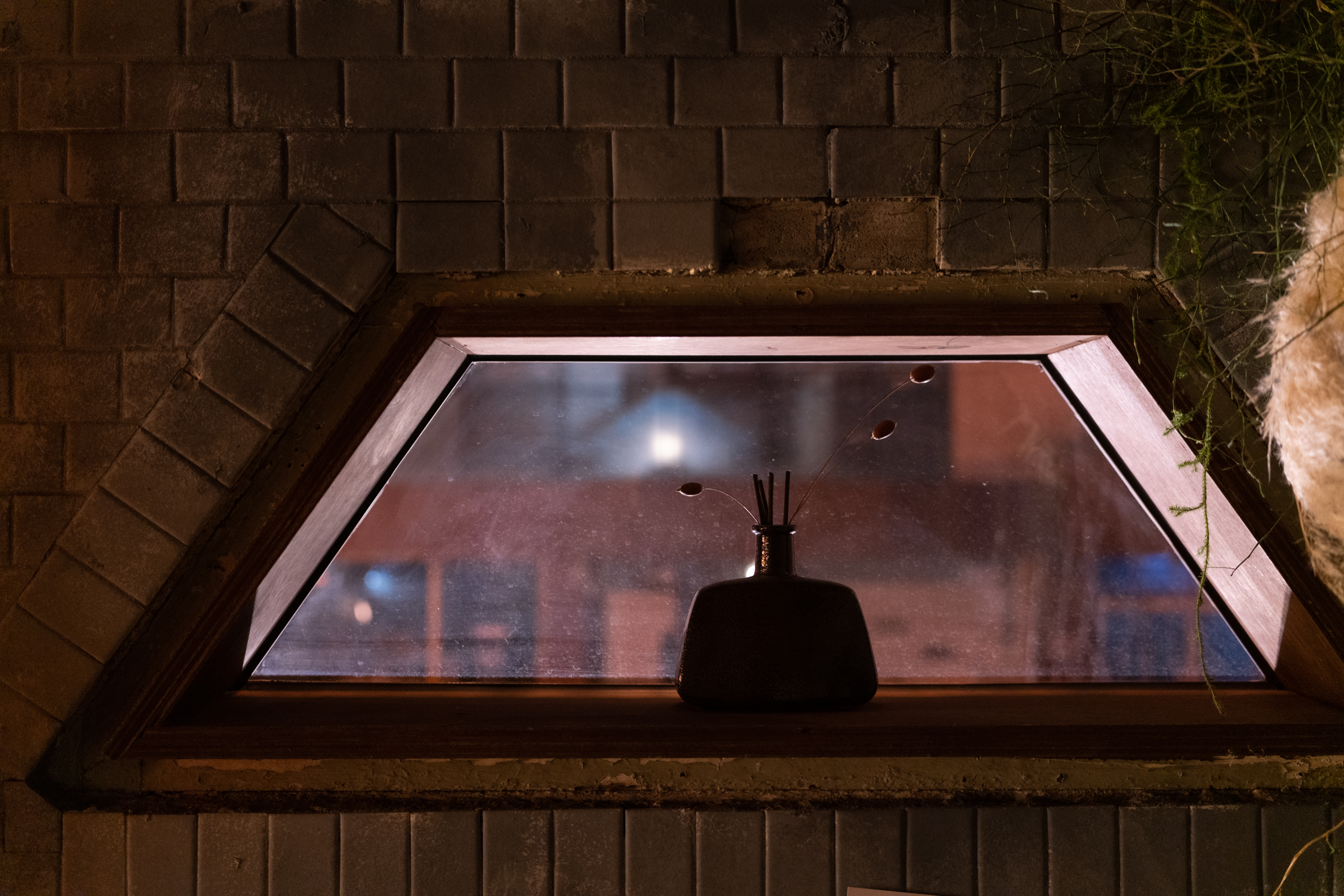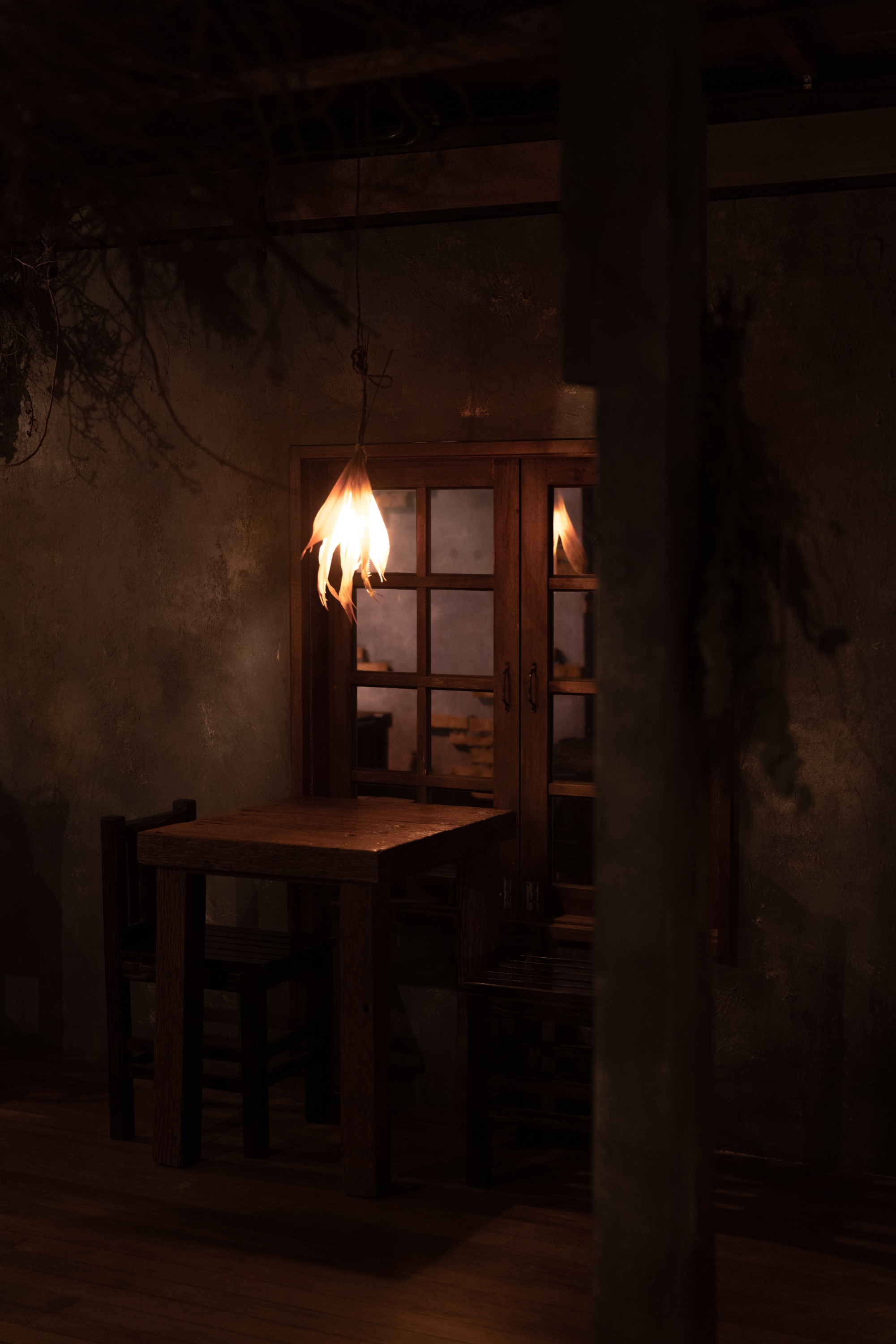 낡은 파란색 2층 집을 연출한 건물 외관이 골목길 속에서 단연 눈에 띕니다. 저는 밤에 방문해서 어둠에 가린 모습밖에 못 봤는데, 밝을 때 보면 더 그럴듯 할 것 같습니다. 내부 인테리어 역시 바깥에서 상상했던 대로 낡은 집을 연상시킵니다. 조명이 어둑어둑하고 낡은 나무 테이블이 있습니다.
