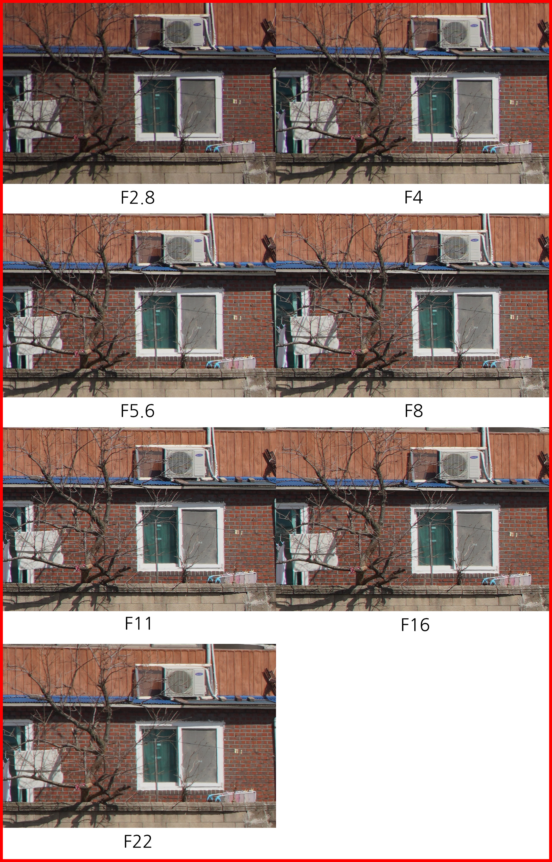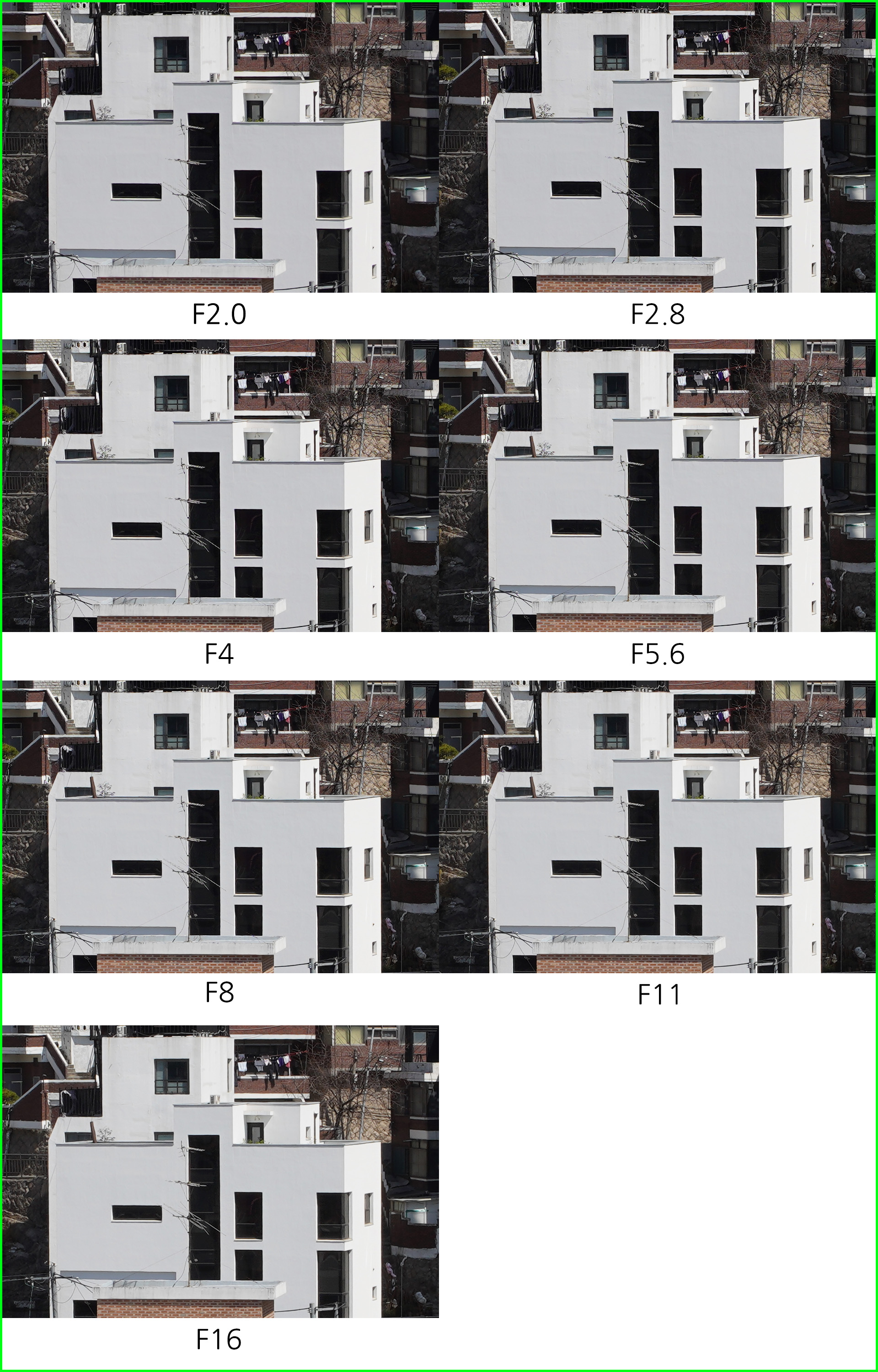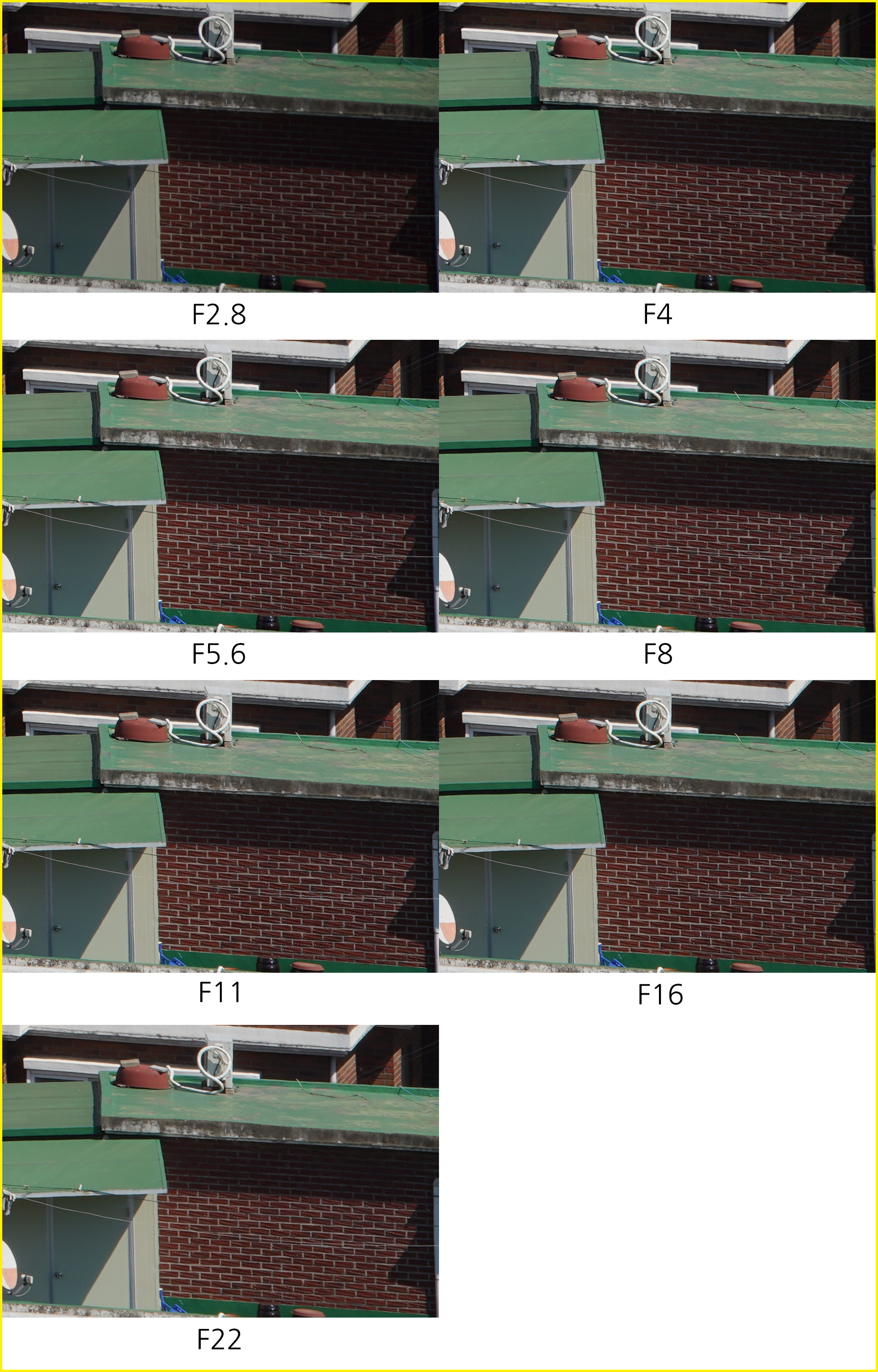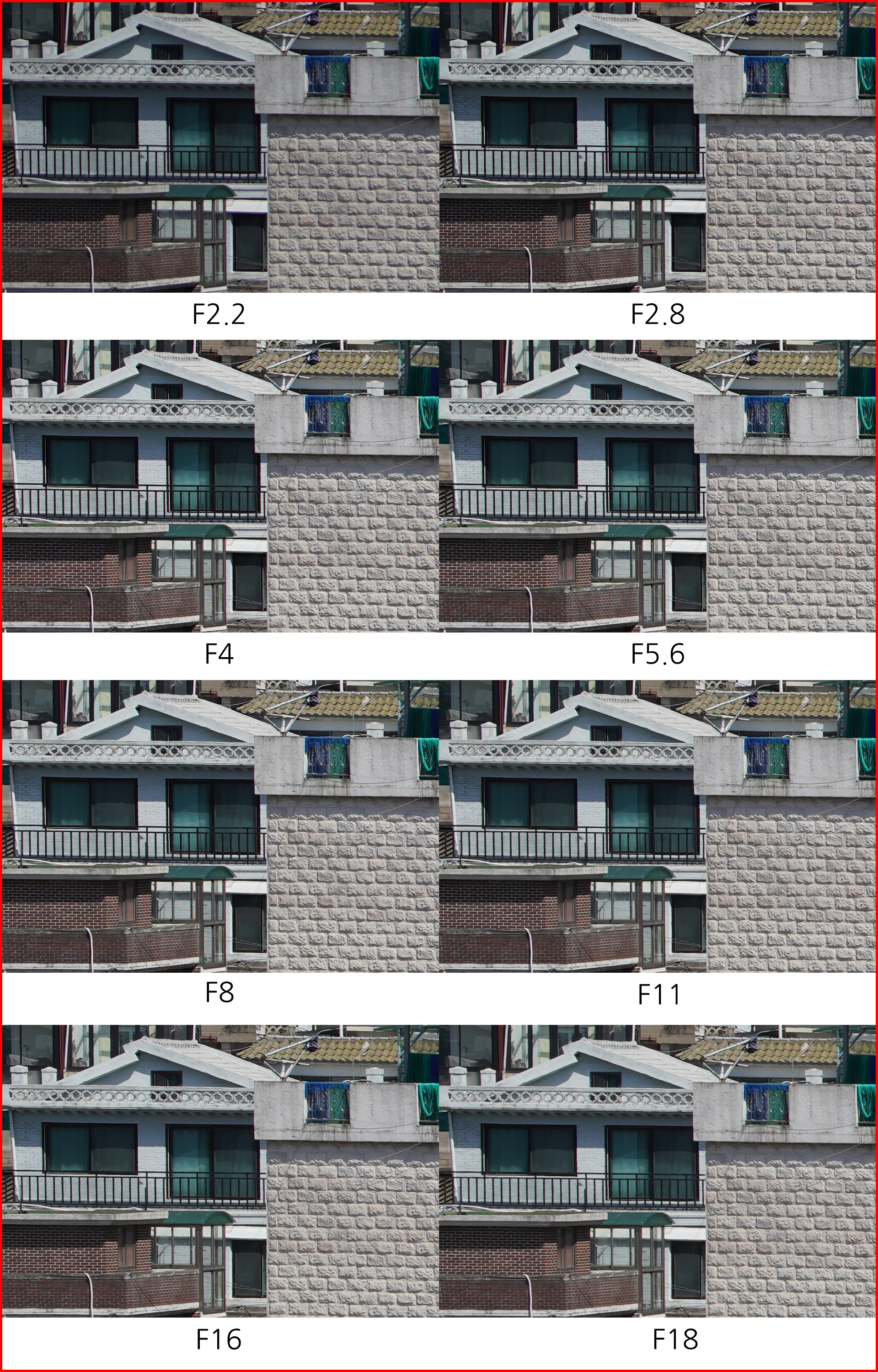 아래는 동일한 환경에서 초점거리/조리개 값 별로 해상력을 비교한 것입니다. 일반 사용자의 촬영 환경을 고려해 렌즈 보정(왜곡,주변 조도,수차)를 모두 '자동'으로 설정하고 jpg 고화질 결과물로 비교했습니다.