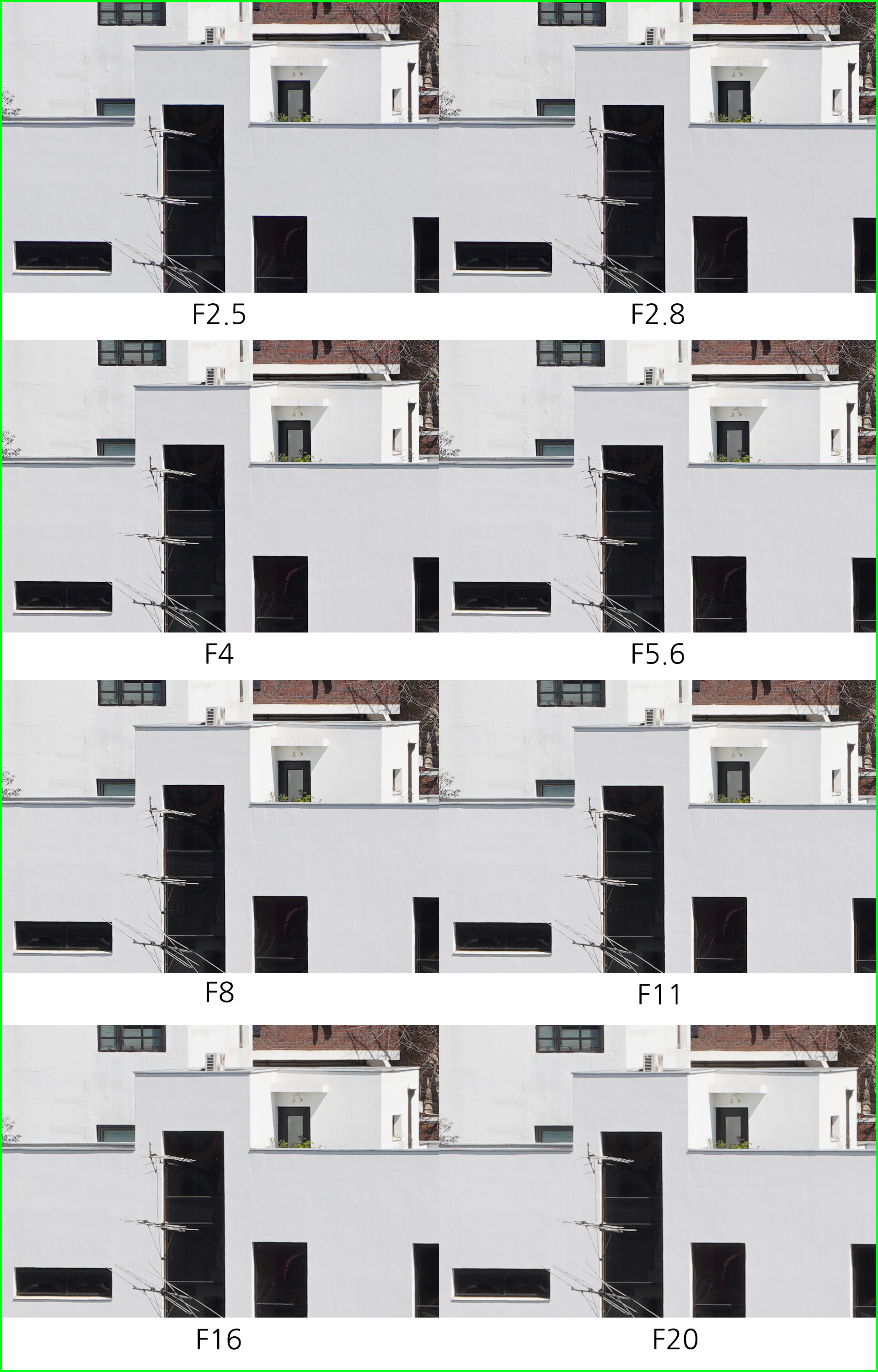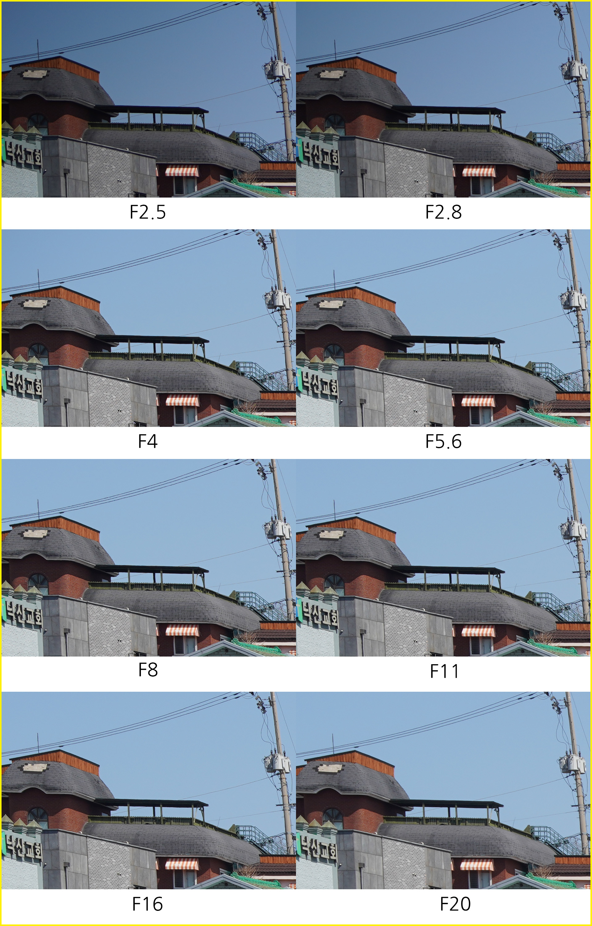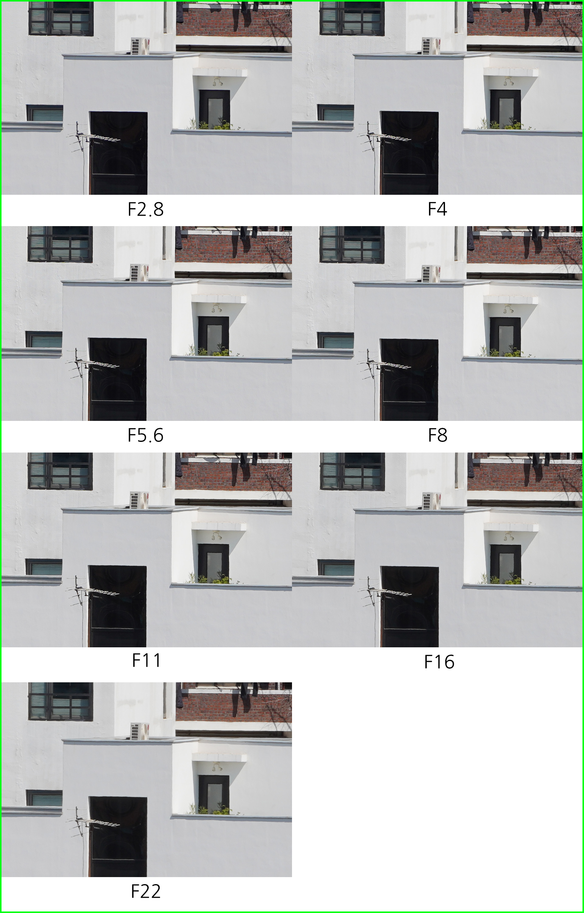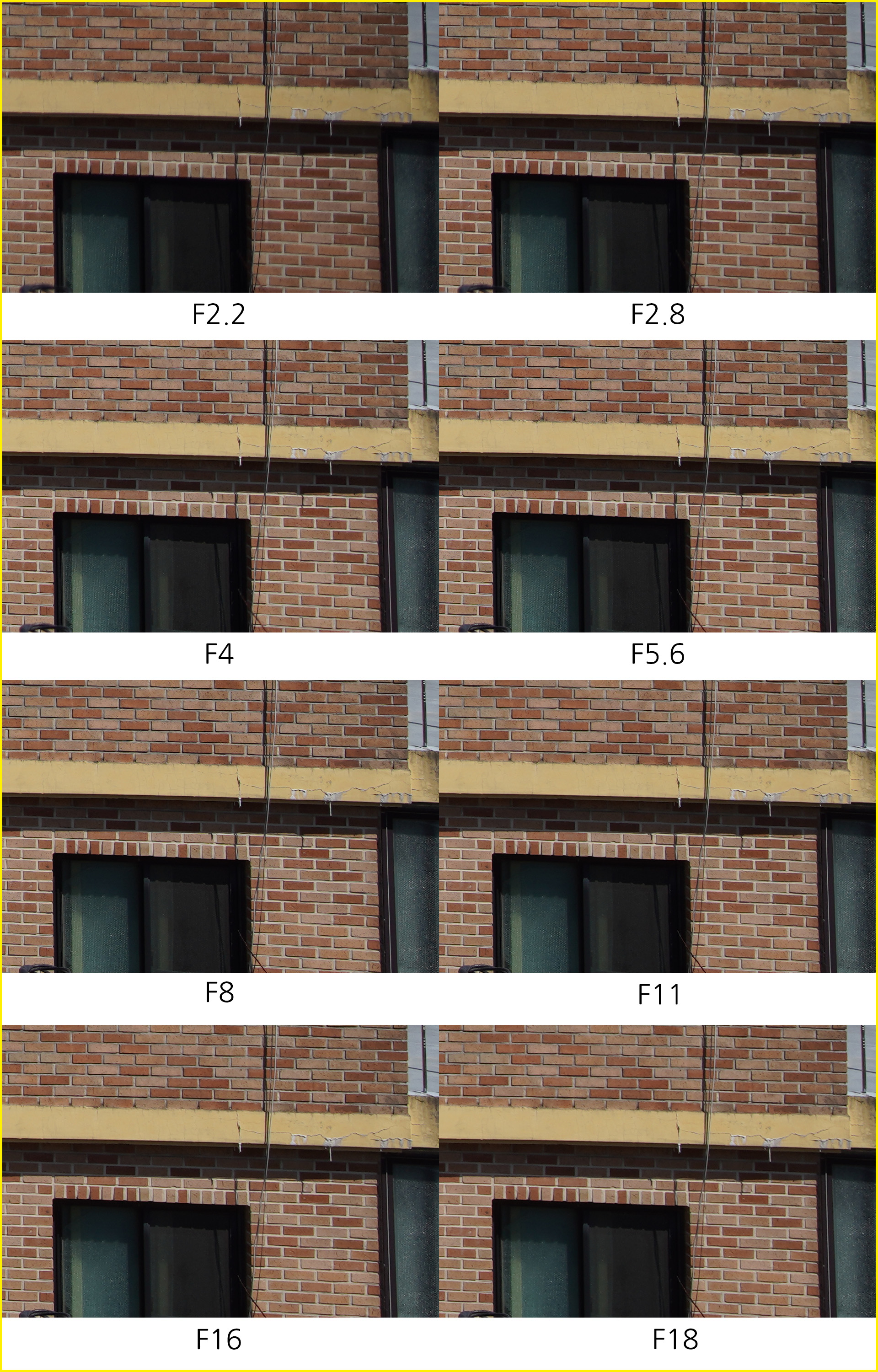 아래는 동일한 환경에서 초점거리/조리개 값 별로 해상력을 비교한 것입니다. 일반 사용자의 촬영 환경을 고려해 렌즈 보정(왜곡,주변 조도,수차)를 모두 '자동'으로 설정하고 jpg 고화질 결과물로 비교했습니다.