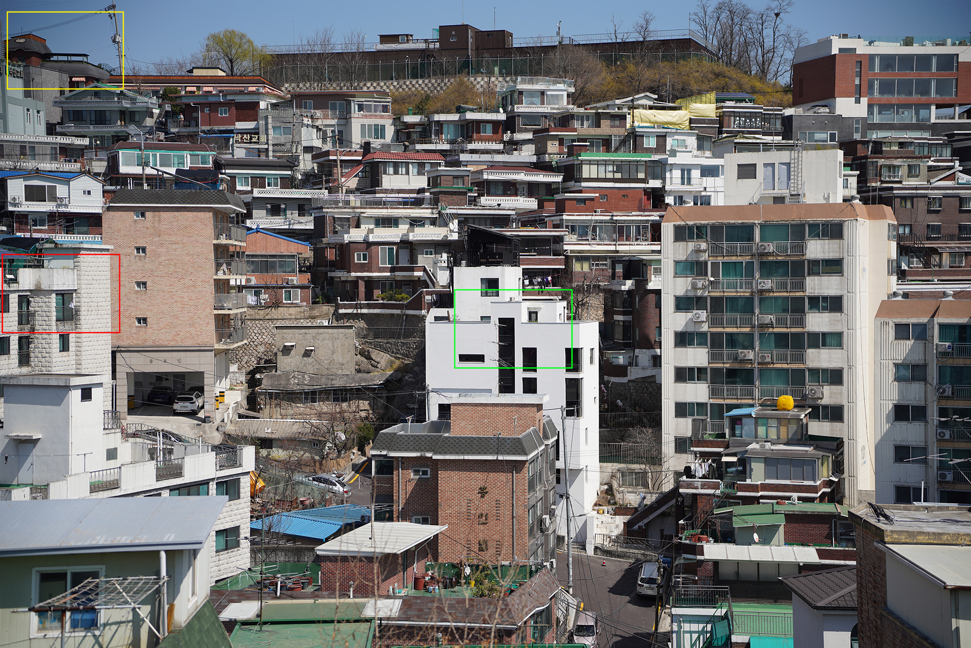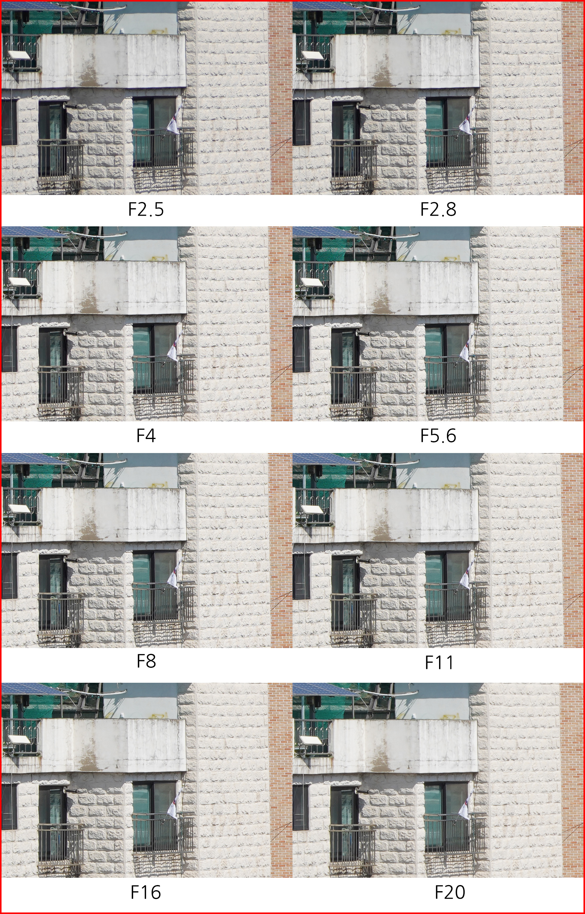 아래는 동일한 환경에서 초점거리/조리개 값 별로 해상력을 비교한 것입니다. 일반 사용자의 촬영 환경을 고려해 렌즈 보정(왜곡,주변 조도,수차)를 모두 '자동'으로 설정하고 jpg 고화질 결과물로 비교했습니다.