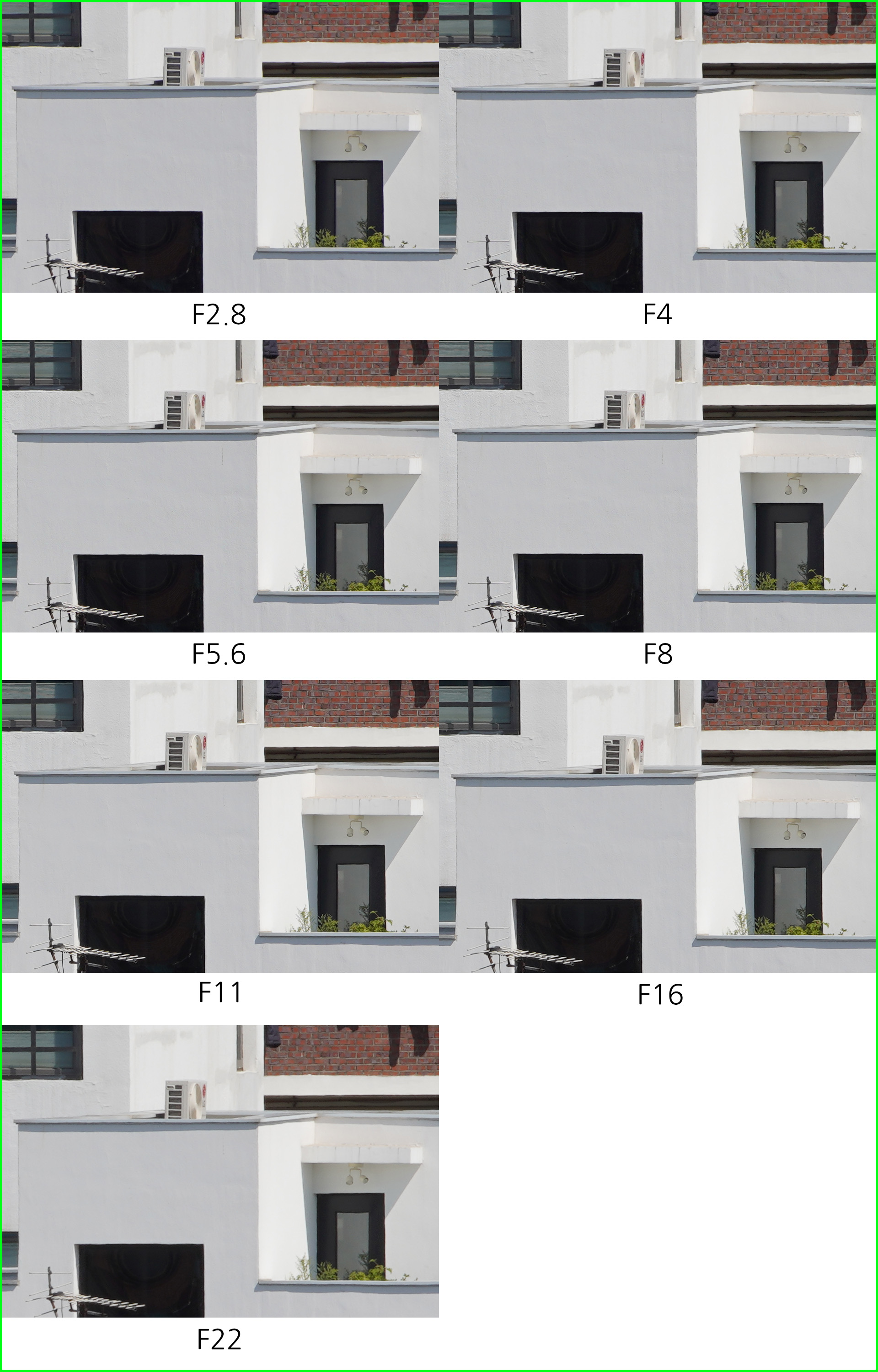 35mm 최대 광각 결과물에서는 F2 최대 개방에서 중심부의 해상력 저하, 주변부/구석부의 광량 저하가 눈에 띕니다. 주변부 이미지 품질은 다른 초점거리와 비교했을 때 역시 광각인 35mm에서 가장 열세를 보이고요. 중심부 해상력은 조리개 값을 F2.8로 조금만 높여도 눈에 띄게 개선됩니다. 이후 F5.6-F8 구간에서 가장 좋은 결과물을 얻을 수 있습니다. F11,F16에서 회절 현상으로 인한 해상력 저하가 있고, 육안상 F2 최대 개방 결과물과 비슷합니다. 해상력보다는 주변부 광량 저하가 결과물에 더 큰 영향을 미치는데, 카메라의 렌즈 보정을 설정해도 F2.8까지는 주변부 비네팅 현상이 완전히 사라지지 않습니다.