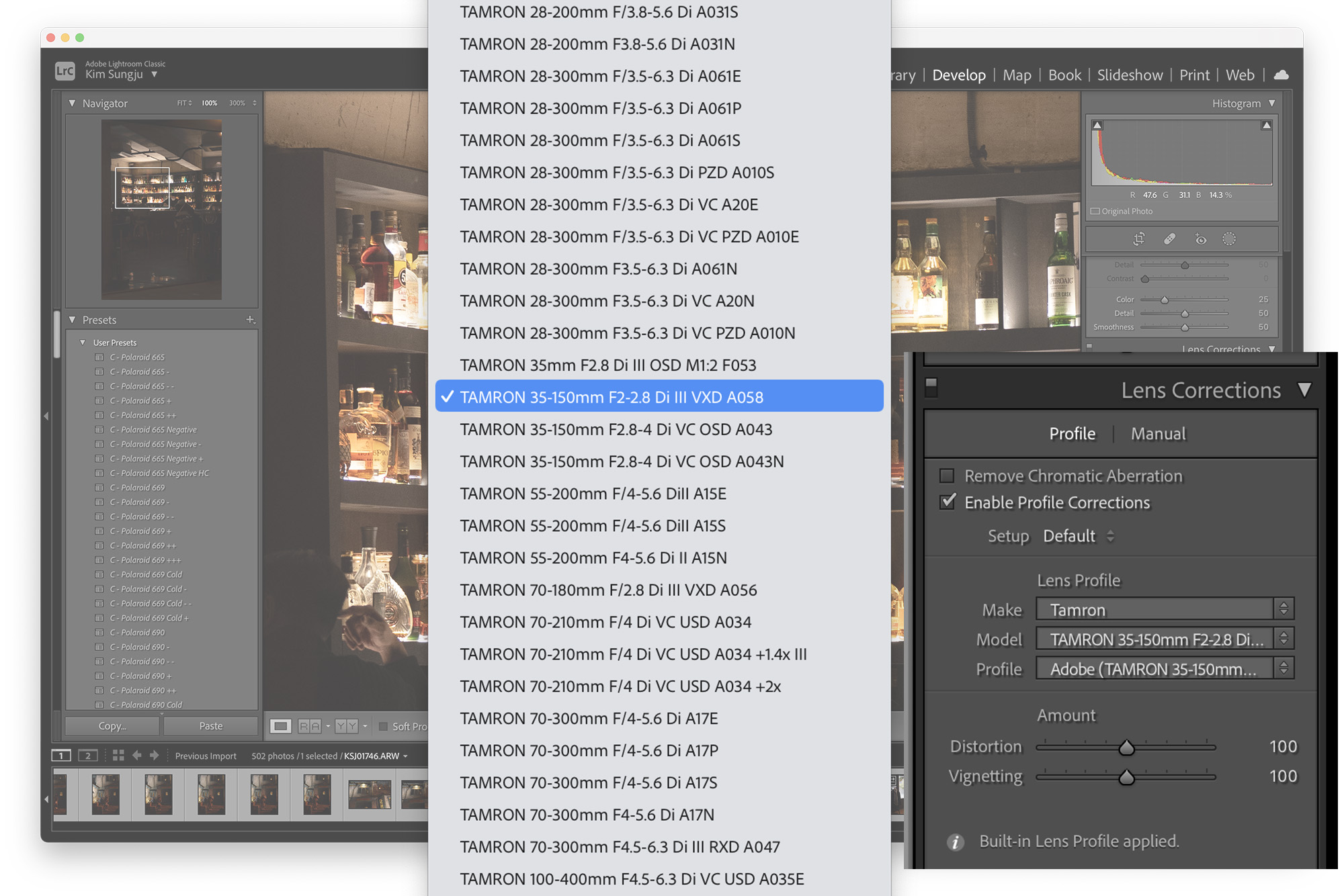 라이트룸 프로파일의 오류는 이미 많은 사례가 보고되어 있으나 아직까지 수정이 되지 않고 있습니다. 때문에 렌즈 프로파일 적용을 해제하고 수동으로 비네팅 보정 옵션을 적용하거나 렌즈 프로파일에 설정된 비네팅 설정 값을 100에서 50 내외로 적용하면 자연스러운 결과물을 얻을 수 있습니다.