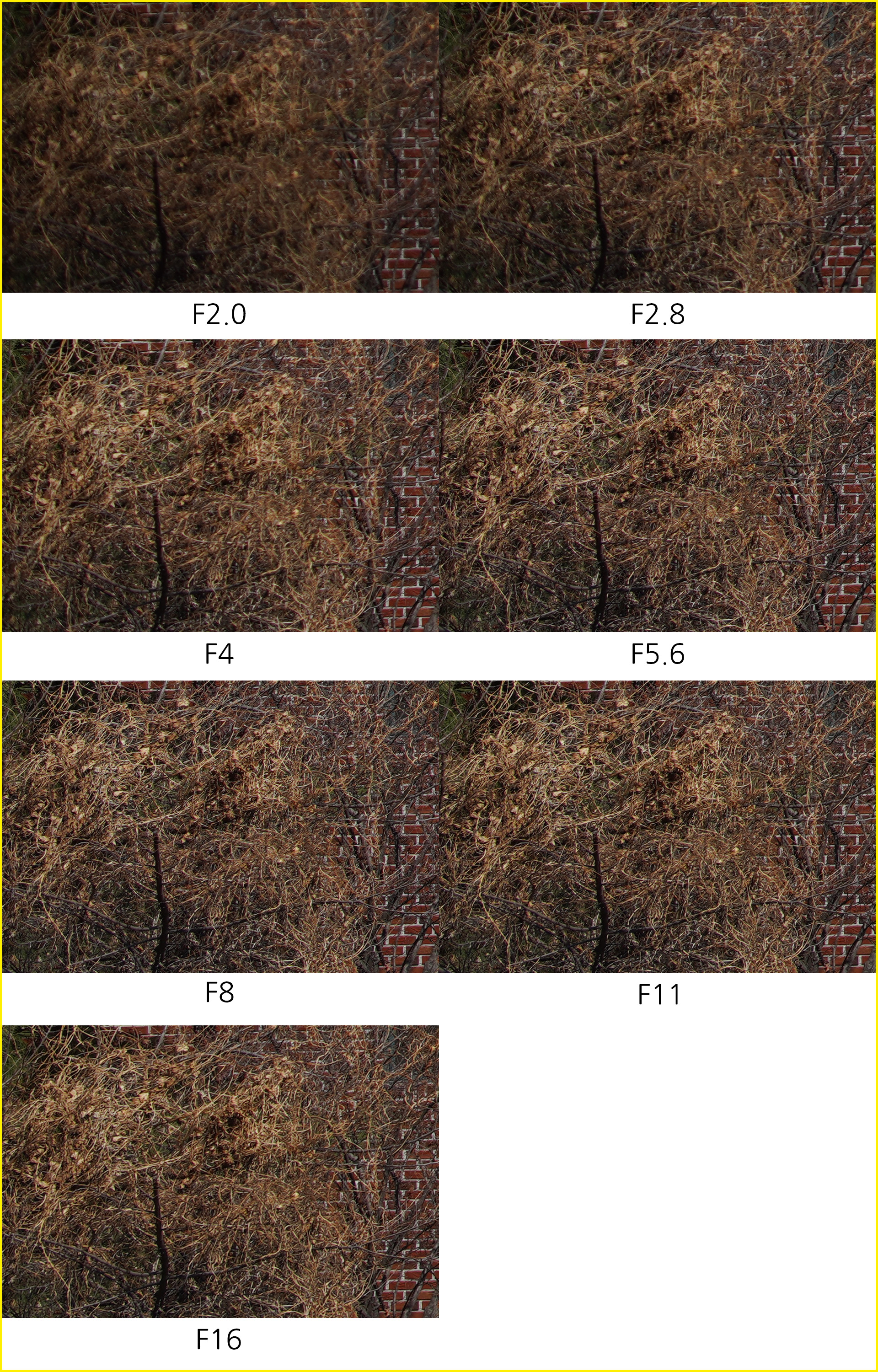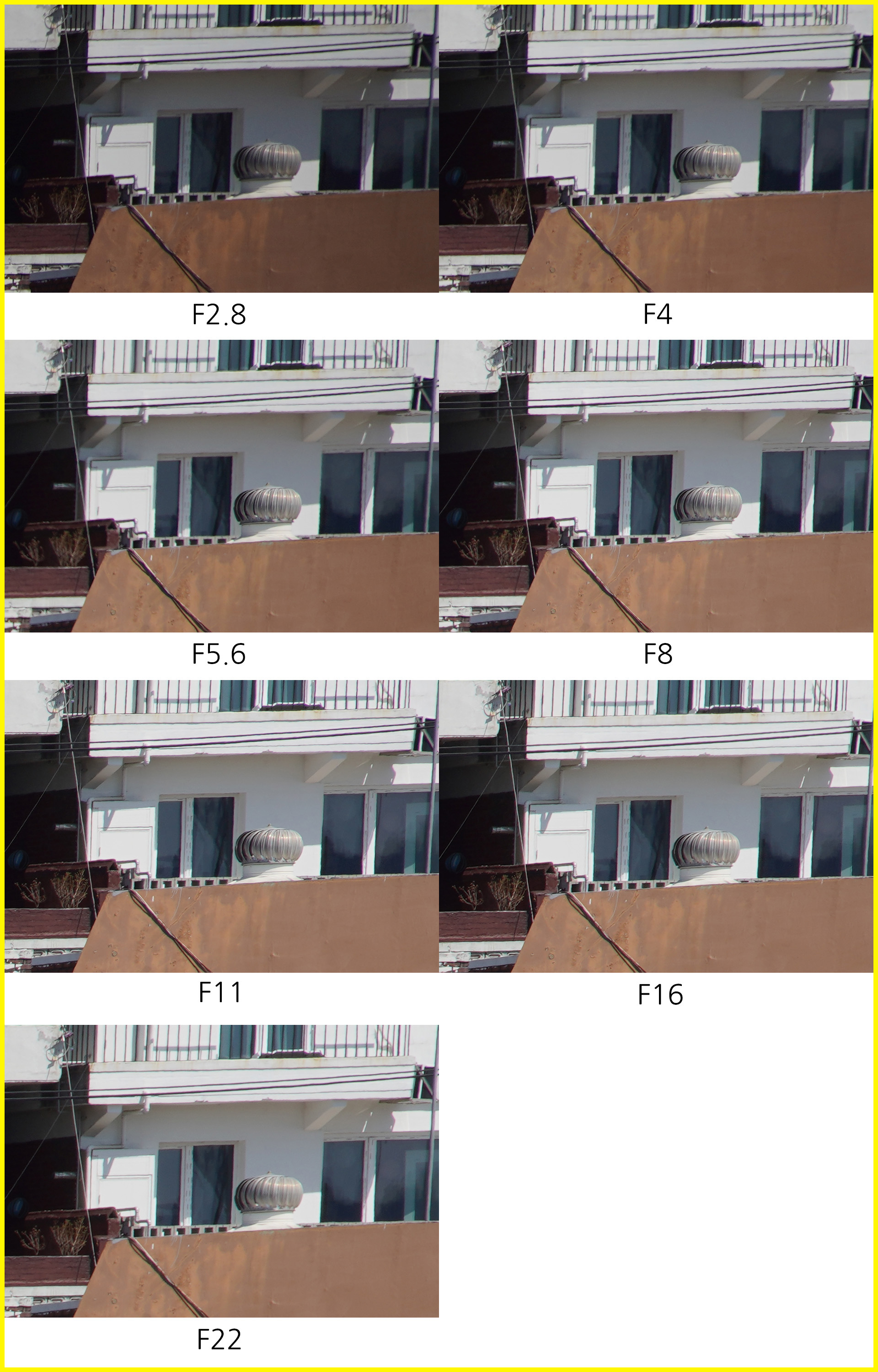 35mm 최대 광각 결과물에서는 F2 최대 개방에서 중심부의 해상력 저하, 주변부/구석부의 광량 저하가 눈에 띕니다. 주변부 이미지 품질은 다른 초점거리와 비교했을 때 역시 광각인 35mm에서 가장 열세를 보이고요. 중심부 해상력은 조리개 값을 F2.8로 조금만 높여도 눈에 띄게 개선됩니다. 이후 F5.6-F8 구간에서 가장 좋은 결과물을 얻을 수 있습니다. F11,F16에서 회절 현상으로 인한 해상력 저하가 있고, 육안상 F2 최대 개방 결과물과 비슷합니다. 해상력보다는 주변부 광량 저하가 결과물에 더 큰 영향을 미치는데, 카메라의 렌즈 보정을 설정해도 F2.8까지는 주변부 비네팅 현상이 완전히 사라지지 않습니다.
