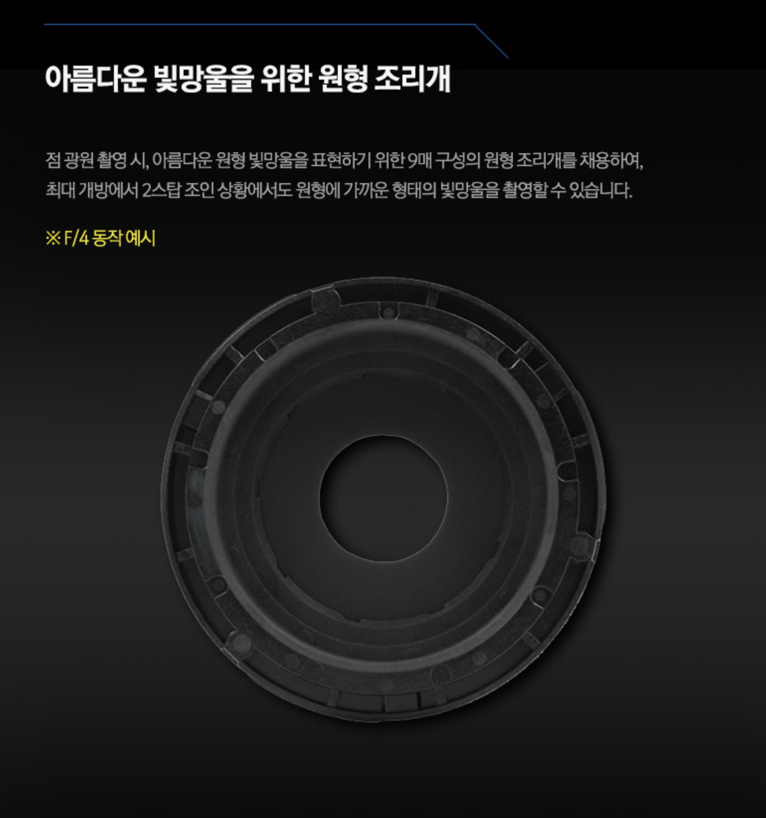 얕은 심도의 인물/정물 촬영과 야경 촬영에서 이미지를 더 풍부하고 아름답게 만드는 빛망울/빛갈라짐 표현 역시 렌즈의 광학 특성과 완성도를 평가할 때 중요한 요소입니다. 이를 위해 이 렌즈는 원형의 빛망울을 표현할 수 있는 9매의 원형 조리개가 채용됐습니다.