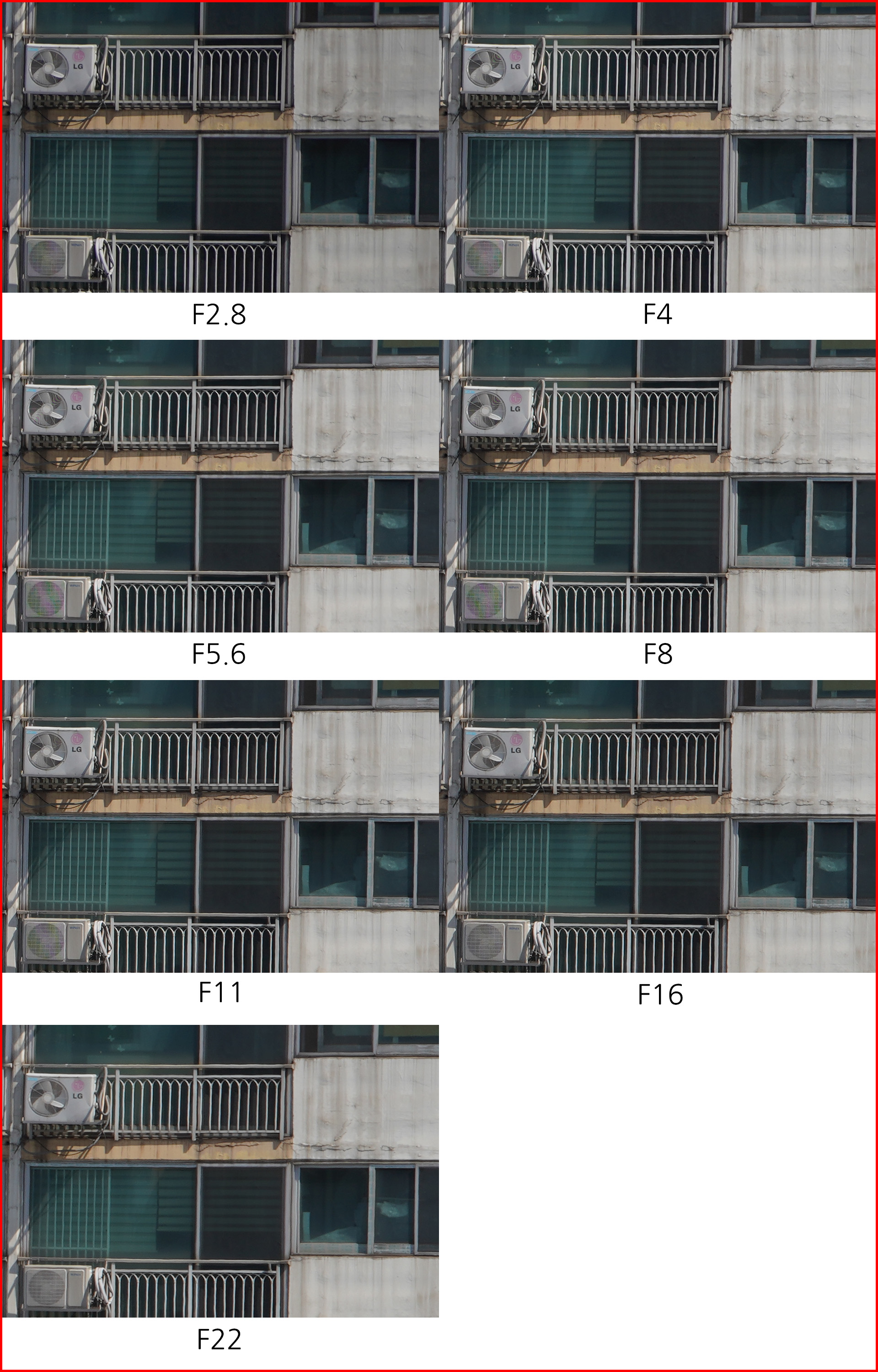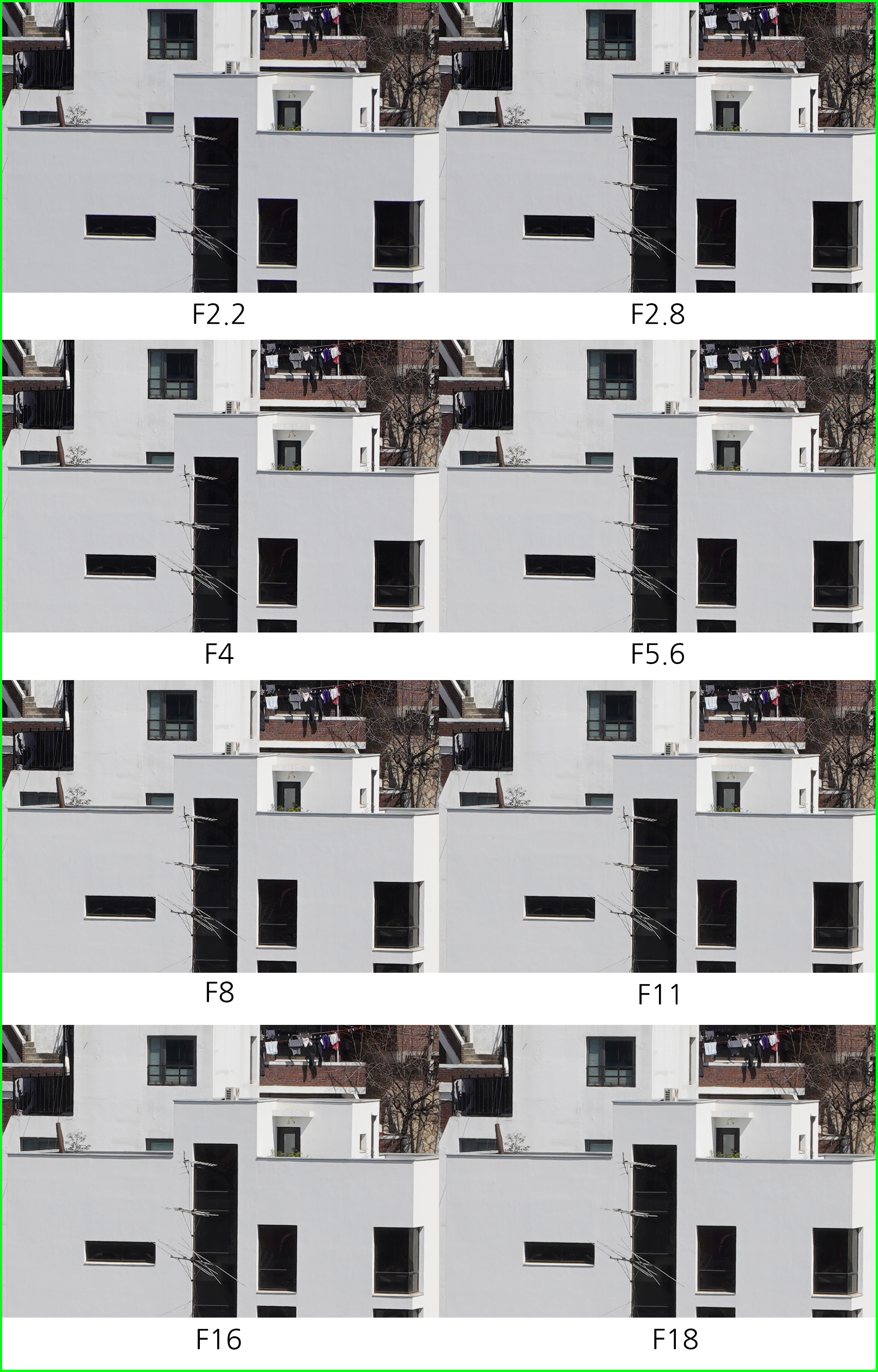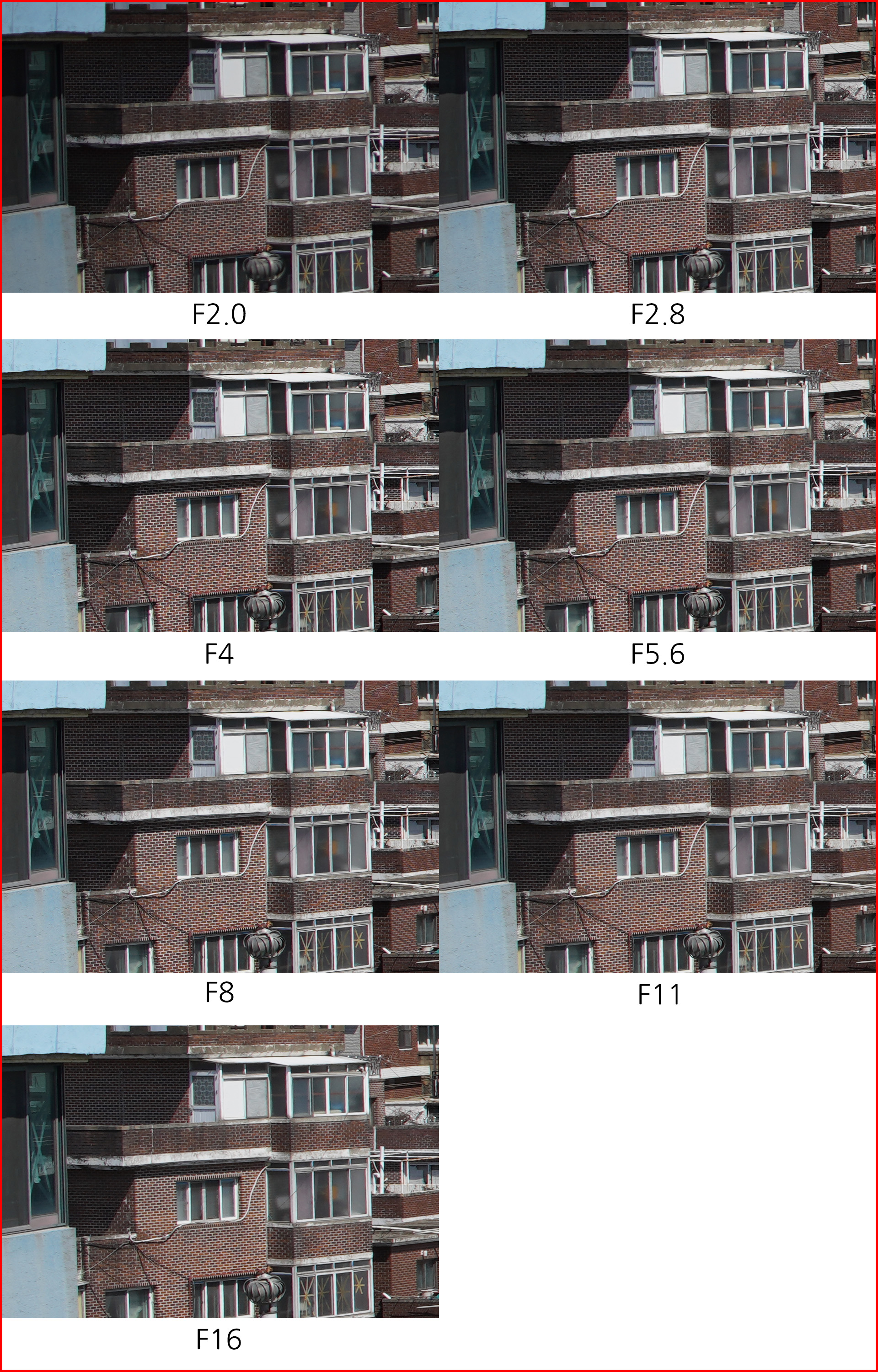 아래는 동일한 환경에서 초점거리/조리개 값 별로 해상력을 비교한 것입니다. 일반 사용자의 촬영 환경을 고려해 렌즈 보정(왜곡,주변 조도,수차)를 모두 '자동'으로 설정하고 jpg 고화질 결과물로 비교했습니다.