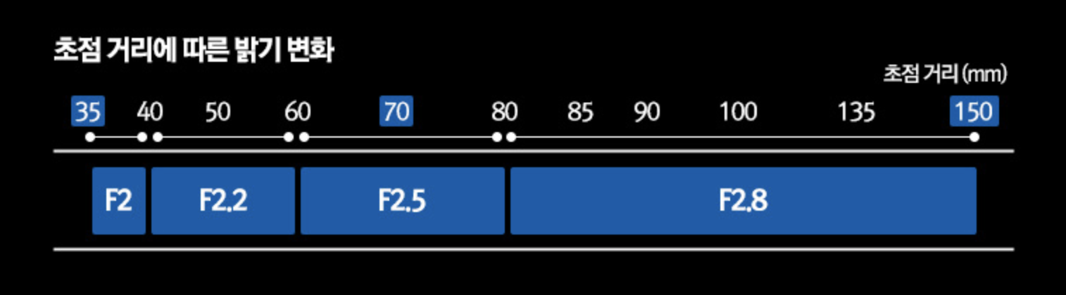 35-40mm 구간에서는 F2의 밝은 조리개 값을 사용할 수 있습니다. 이후 40-60mm 구간까지도 F2.2의 밝은 조리개 값을 사용할 수 있습니다. 표준 초점거리로 일컬어지는 50mm 내외 구간에서 F2.8보다 밝은 F2.2 촬영이 가능한 것은 분명한 장점입니다. 이후 60-80mm 구간에서 F2.5로 다시 1/3스톱 높아진 뒤 80-150mm 구간에서 F2.8로 고정됩니다.