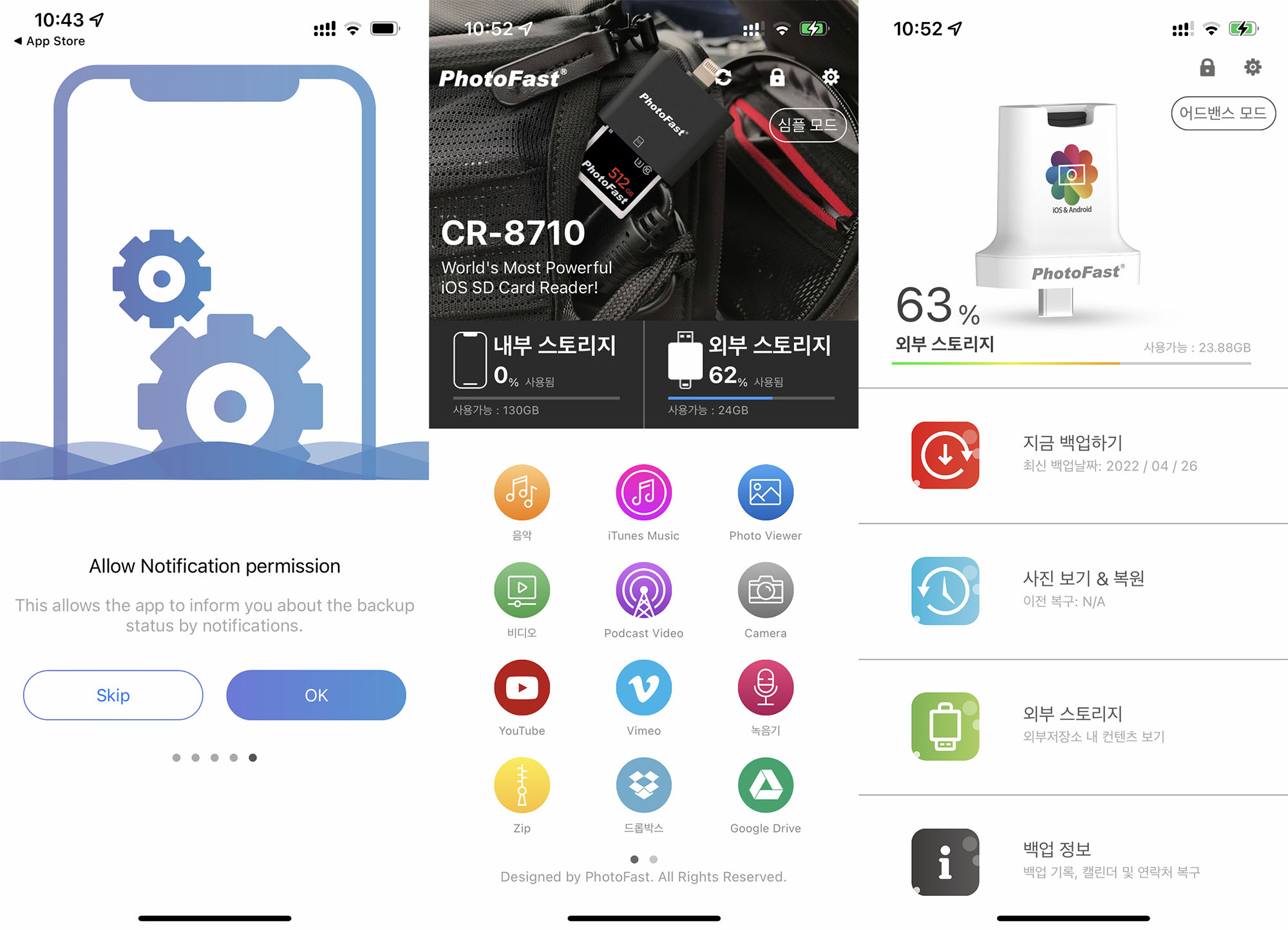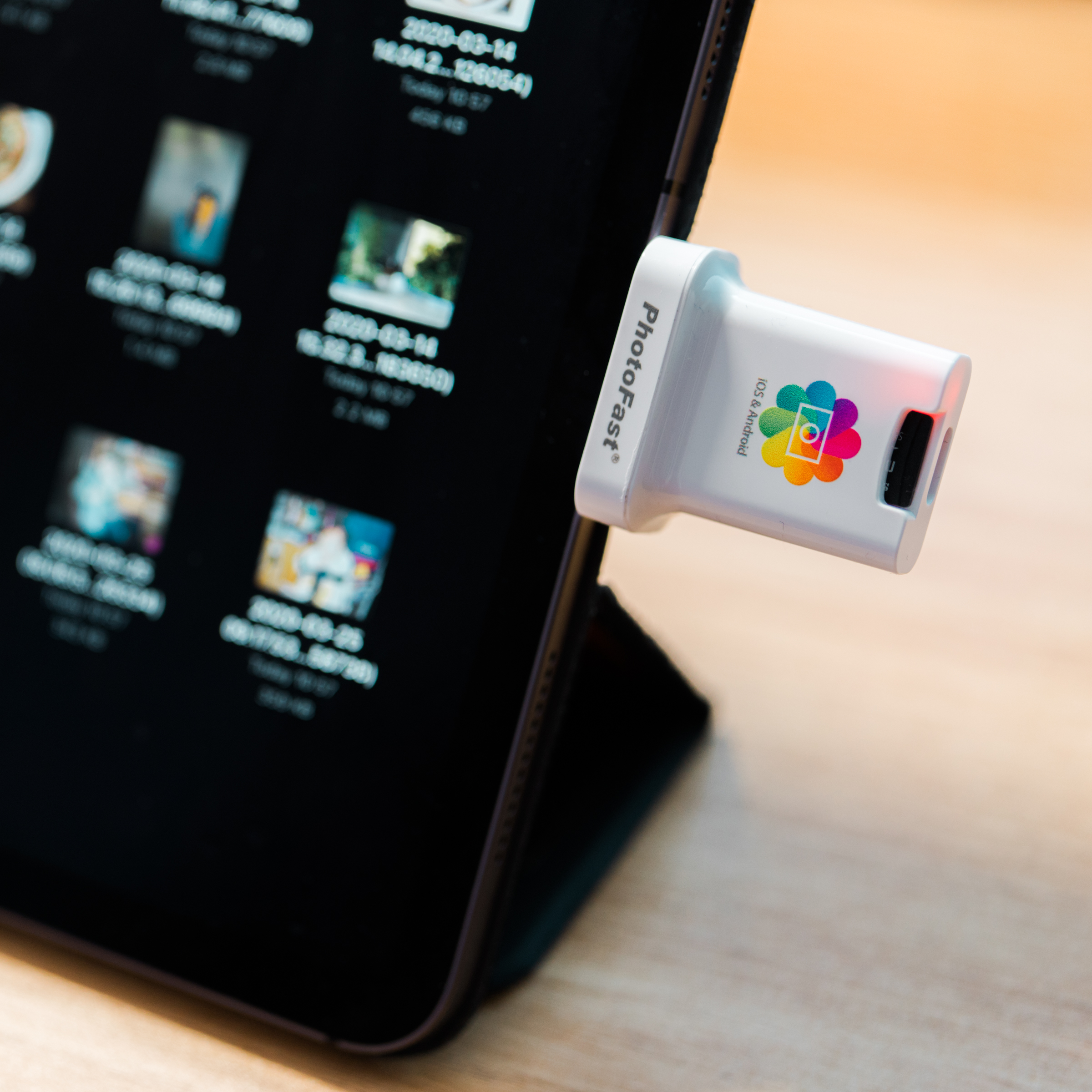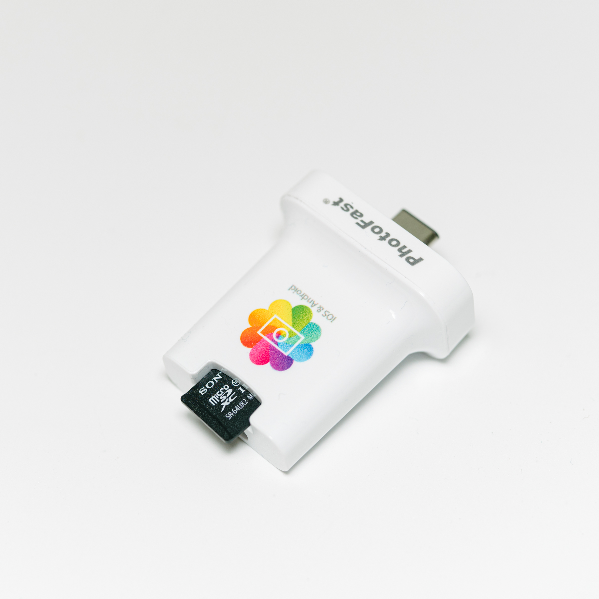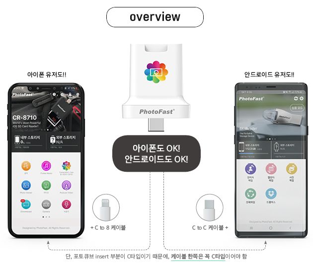 제품명은 포토패스트 포토큐브 C+입니다. USB C 포트를 통해 스마트폰과 연결되며 장치에 직접 삽입하는 microSD카드에 데이터를 백업합니다. 백업된 파일을 다른 휴대폰에 복원하는 것도 가능합니다. 아이폰/안드로이드폰을 모두 지원해 활용도가 높습니다.