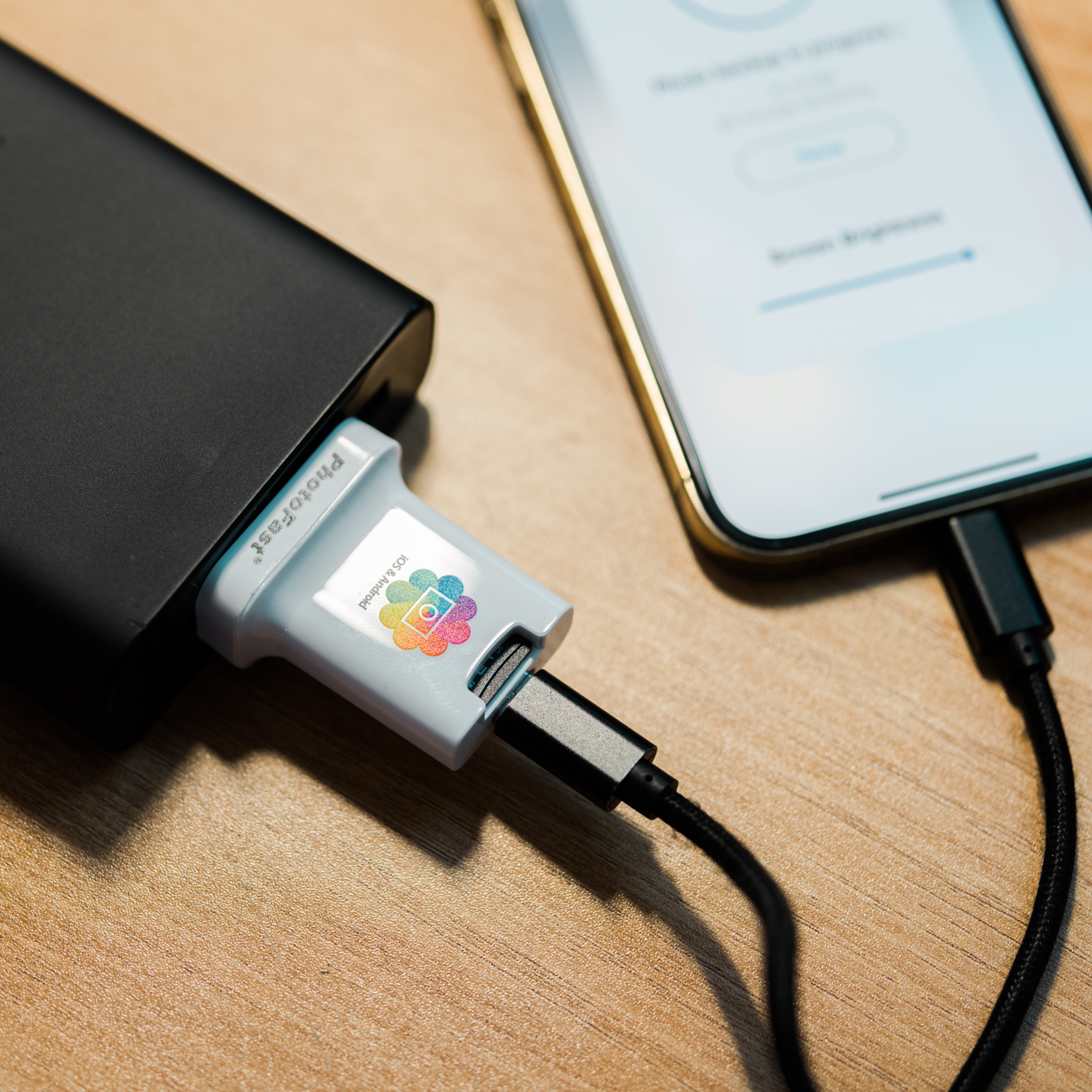연결 방법은 간단합니다. microSD 카드가 삽입된 포토큐브 C+를 PC나 충전 어댑터, 보조 배터리 등 전원을 제공받을 수 있는 USB 포트에 연결하고, 반대편에 스마트폰 케이블을 연결하면 됩니다. USB 포트와 스마트폰 사이에 포토큐브 C+를 추가한다고 생각하면 되겠네요.