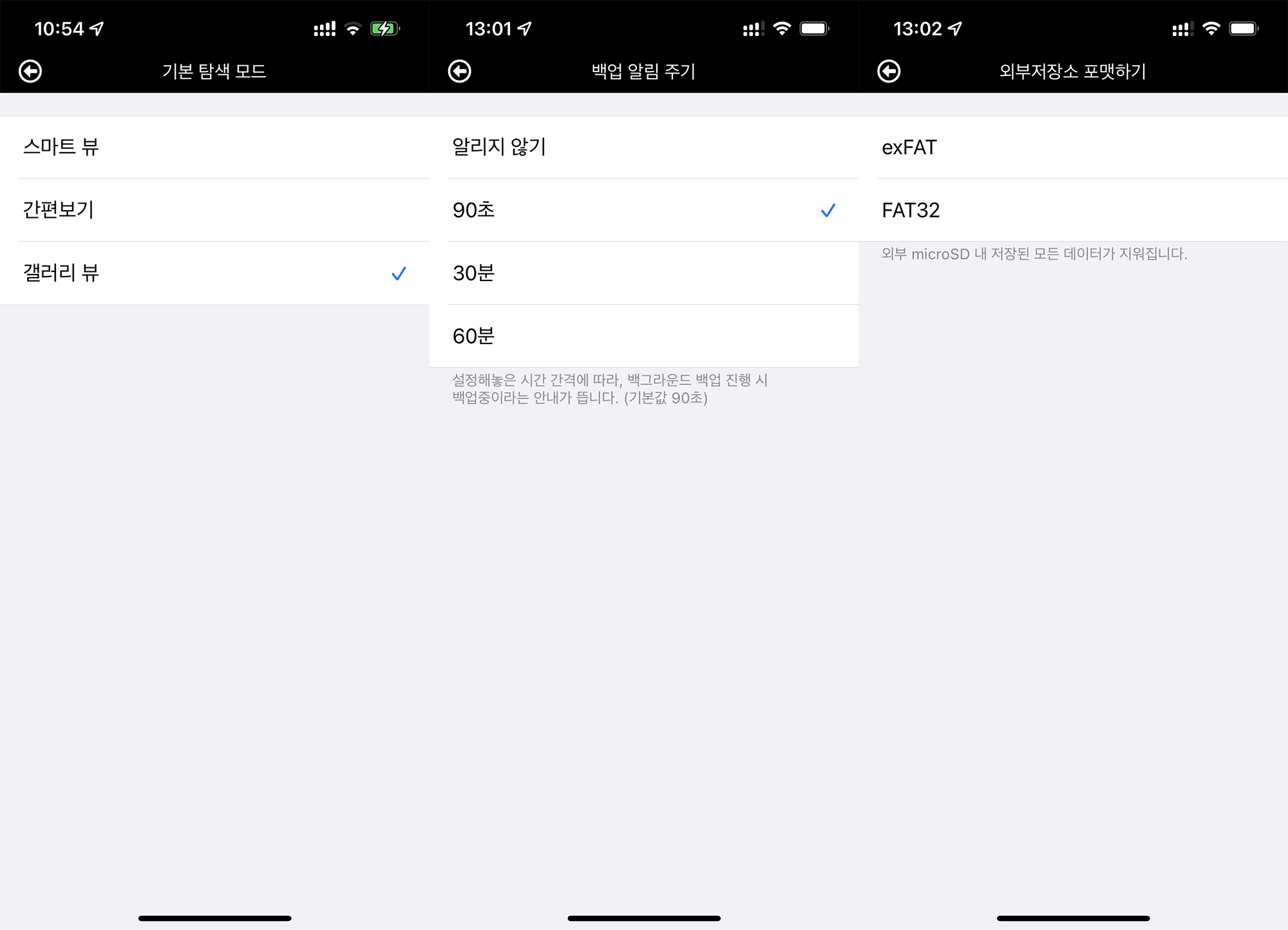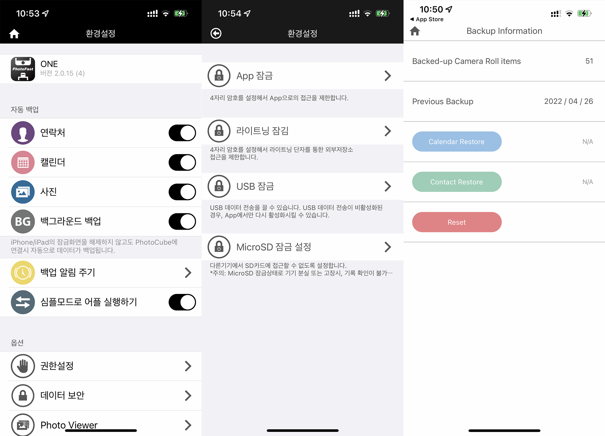 설정 메뉴에서 생각보다 다양한 옵션을 지원하는 것을 확인할 수 있습니다. 연락처/일정/사진 중 원하는 항목만 선택해서 백업할 수 있고 자동 백업 여부와 알림 주기 설정 역시 가능합니다. 데이터 관리에서 가장 신경 쓰이는 보안 옵션도 네 가지를 지원합니다. 정보 메뉴에서는 백업된 파일 수를 확인하고 항목별 복원 기능을 실행할 수 있습니다.