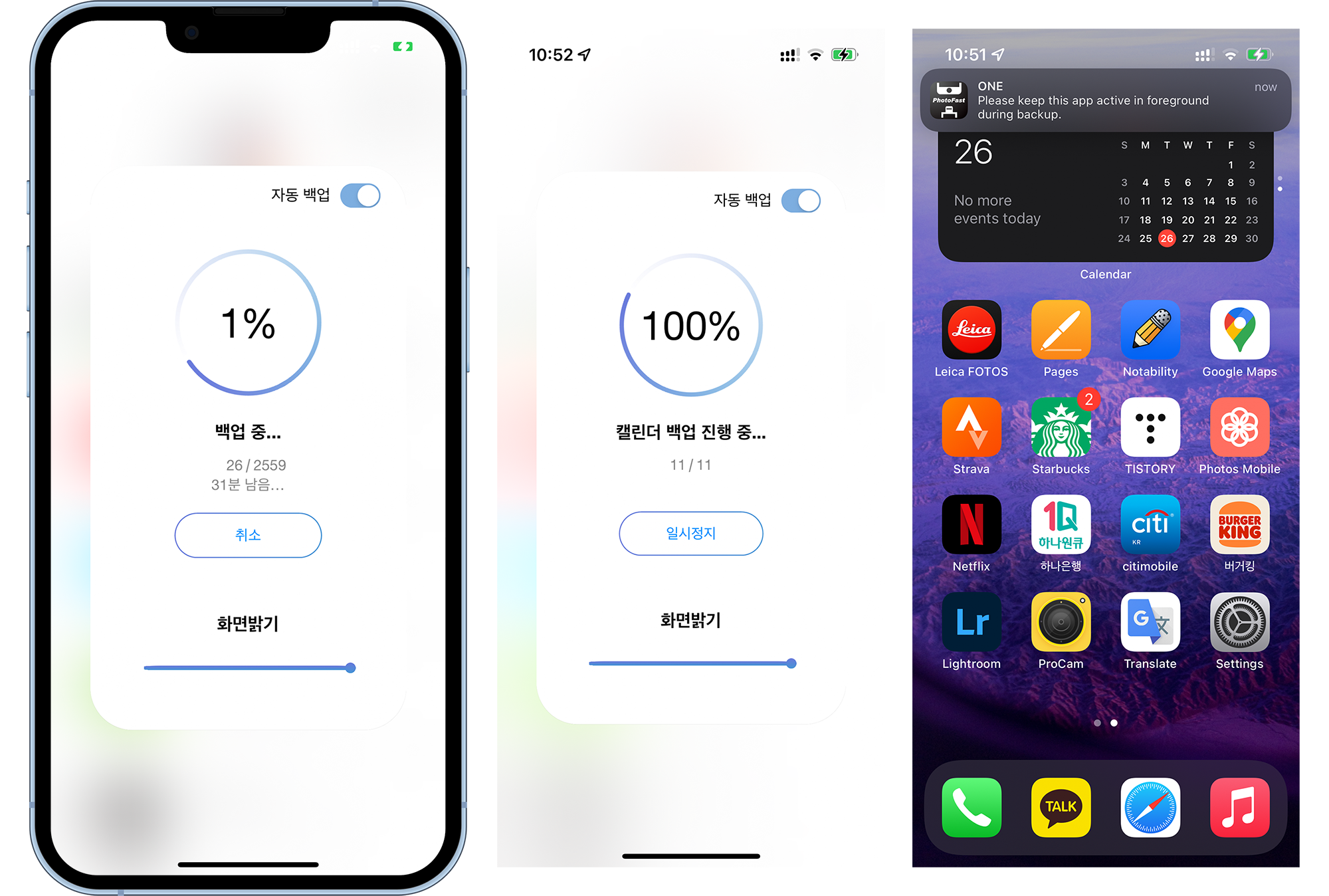 자동 백업이 설정된 경우 별다른 조작 없이 데이터 백업이 즉시 실행됩니다. 스마트폰에 저장된 데이터 색인 작업 후 백업이 실행되며 진행 상황을 퍼센트, 남은 시간으로 표시합니다. 다른 앱을 실행할 때도 백그라운드 작업으로 작업이 진행되도록 할 수 있습니다. 전송 속도는 PC의 USB 연결과 큰 차이를 느낄 수 없었습니다. 제조사 발표 기준 30MB/s로 약 8000장의 사진을 백업할 때 한 시간 정도 소요된다고 합니다.