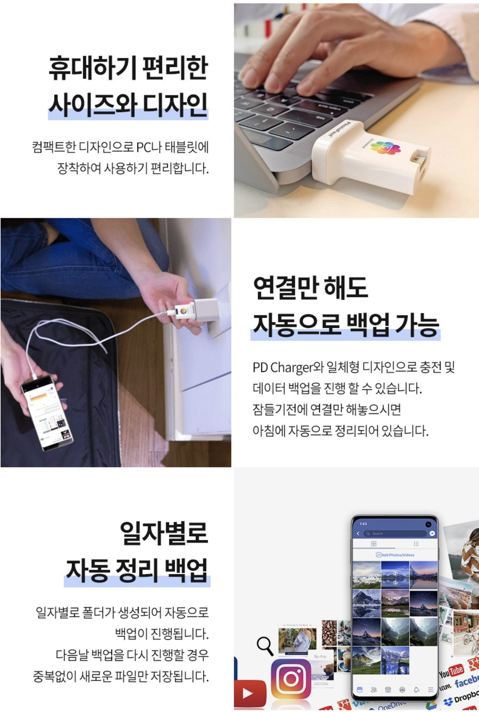 클라우드 서비스로 스마트폰 속 데이터를 간편하게 백업하는 것이 익숙해졌지만 월 구독료의 부담, 온라인 연결이 필요한 접속 환경, 서비스 자체에 대한 신뢰 등 단점도 여럿 생각납니다. 특히 소중한 사진이라면 직접 디스크에 보관, 간직하고 싶은 욕심이 생기기도 하죠. 그런 면에서 이번 포스팅에서 소개하는 리더기 형태의 백업 장치는 간편함과 안전성에서 모두 장점이 있습니다. 사용하고 있는 케이블로 스마트폰을 연결만 하면 폰 속 사진과 연락처, 일정 데이터를 자동으로 백업할 수 있습니다.