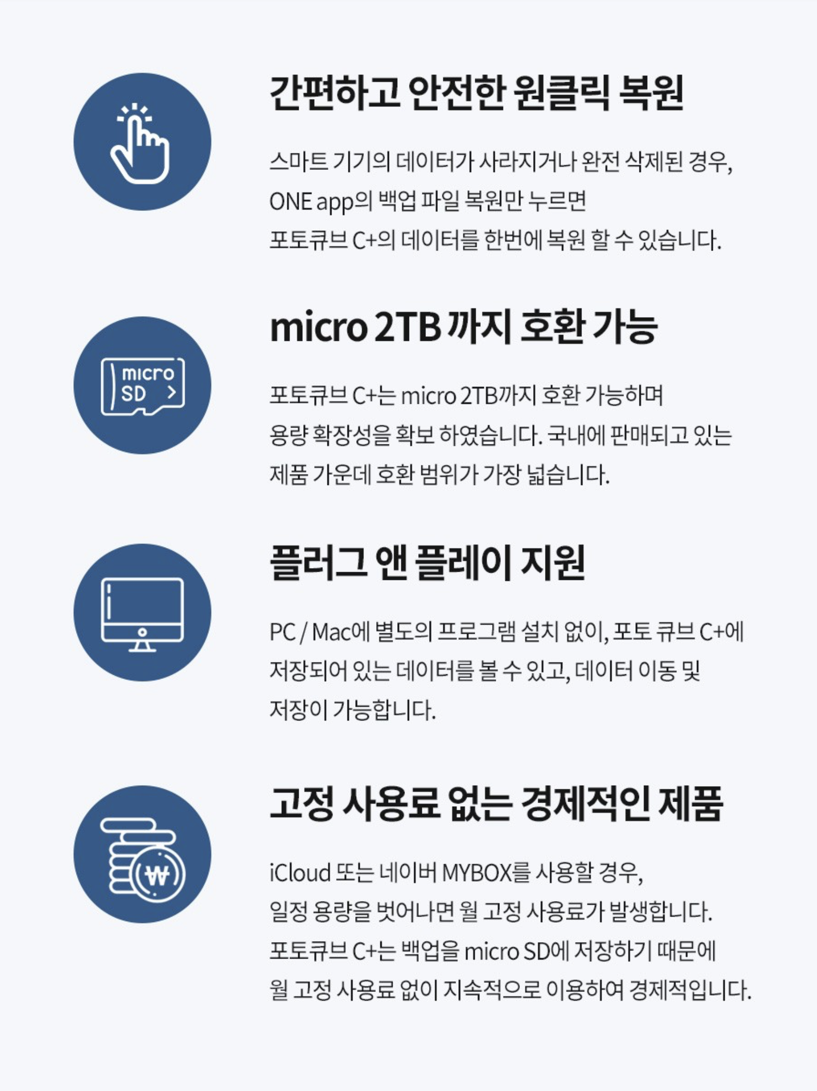 스마트폰의 용량 부족을 경험했고, 단순히 사진 데이터 백업을 위해 매달 일정 금액을 지불하는 클라우드 서비스가 굳이 필요하지 않은 분들에게 포토큐브 C+는 유용한 제품입니다. 한 번 구매로 추가 지불 없이 사용할 수 있고 연결과 백업 과정 역시 간편합니다. 최대 2TB의 대용량 microSD 카드를 지원하는데다 microSD 카드만 추가 구매한다면 사실상 무제한 용량의 백업이 가능한 것도 장점으로 꼽을 수 있겠네요. 특히 여행지에서 남길 소중할 추억을 안전하게 백업하는 용도로 추천할만한 제품인 것 같습니다.