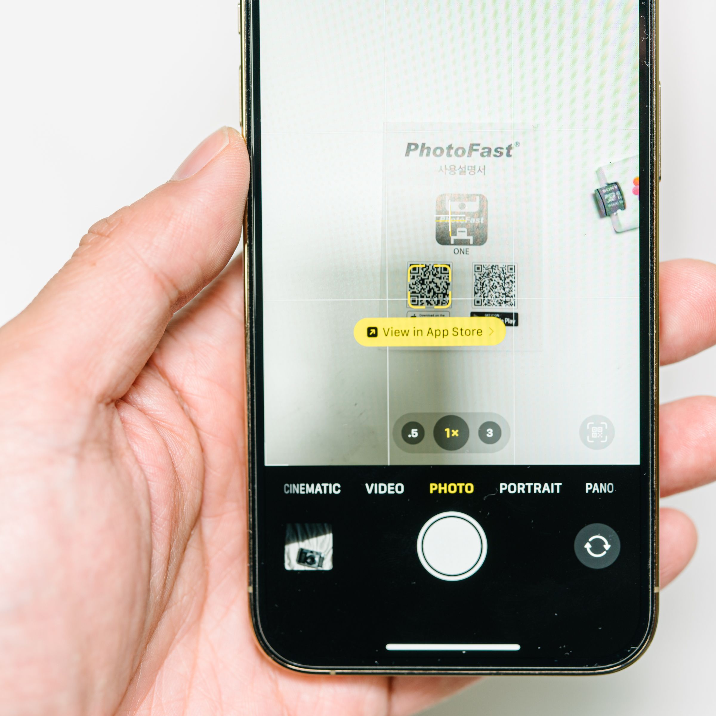 백업과 복원, 설정 등 모든 작업은 전용 앱 Photofast ONE으로 진행됩니다. 사용 설명서의 QR 코드를 스캔하면 앱스토어/플레이스토어의 앱 다운로드 화면으로 바로 연결됩니다.